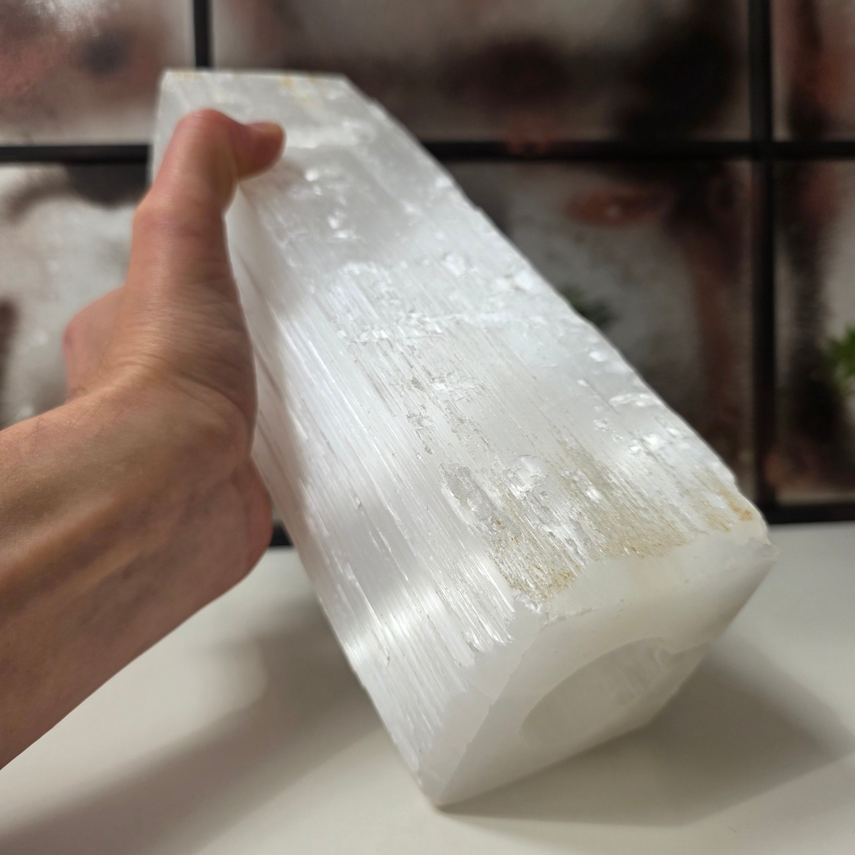 When a candle is lit inside, selenite radiates a gentle glow, transforming the room into a sanctuary of peace. It is ideal for moments of relaxation, meditation or simply to bring natural beauty into your home.