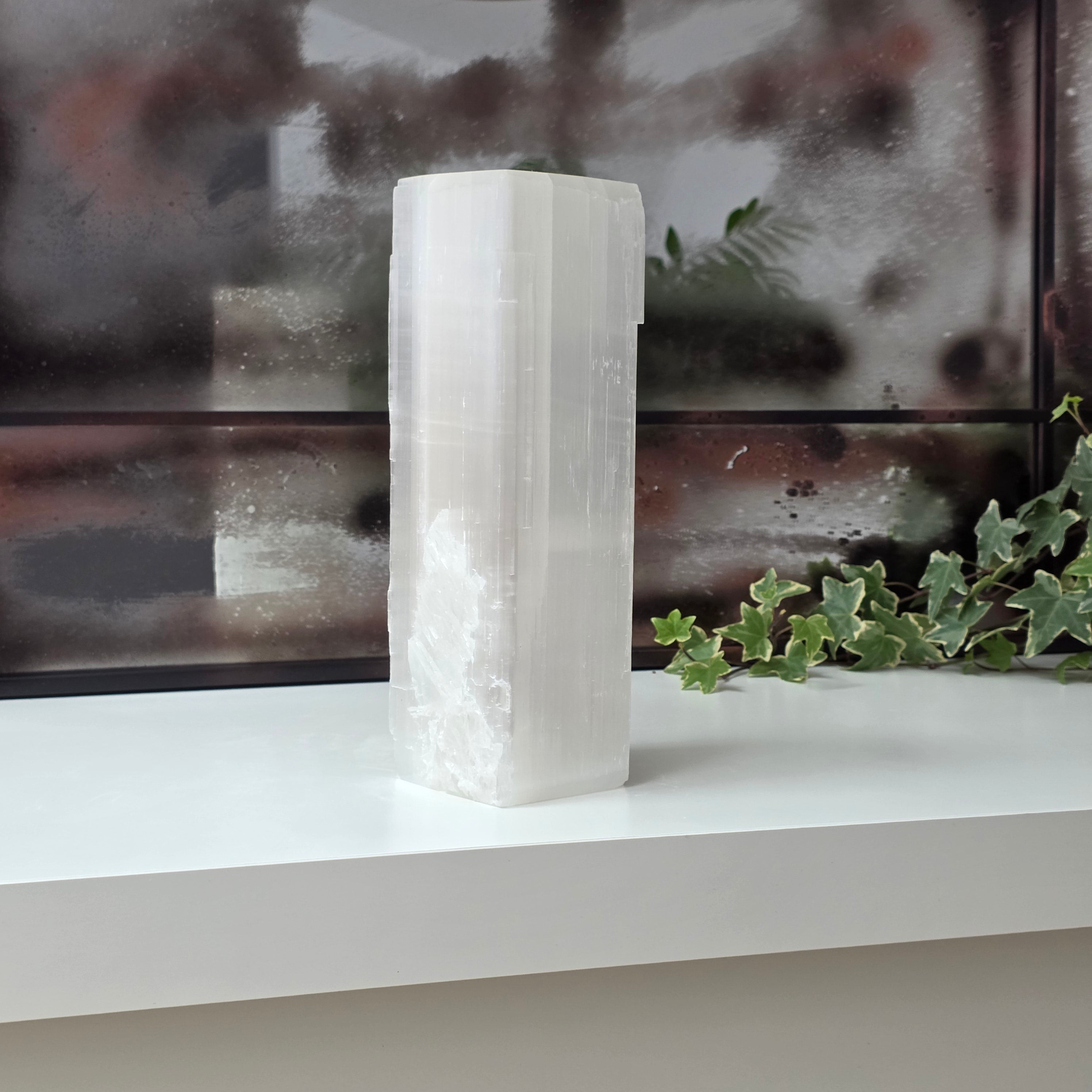 This cylinder tower-shaped candle holder, made of natural selenite, brings a touch of magic and light to any space. Selenite is considered the stone of purity and inner peace.