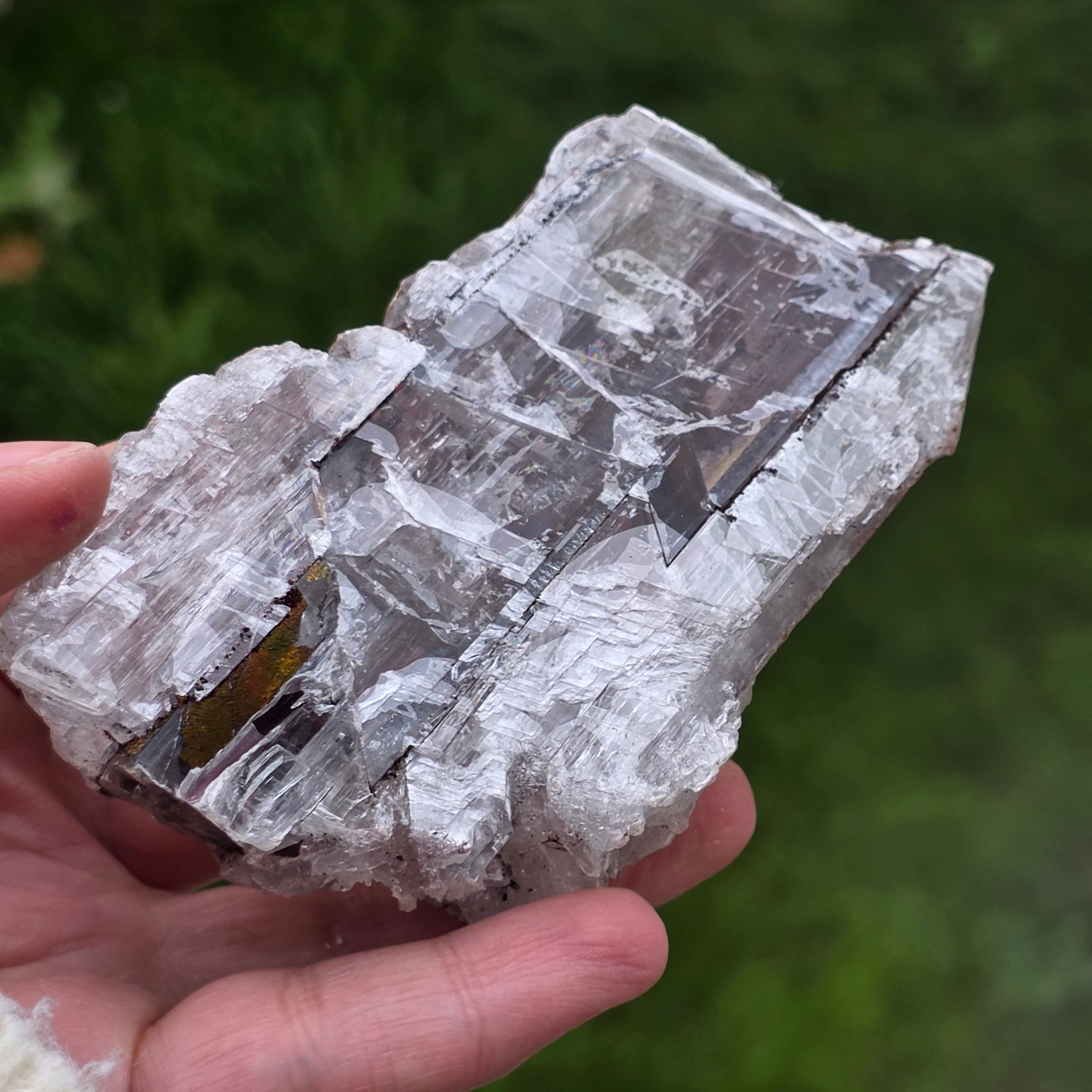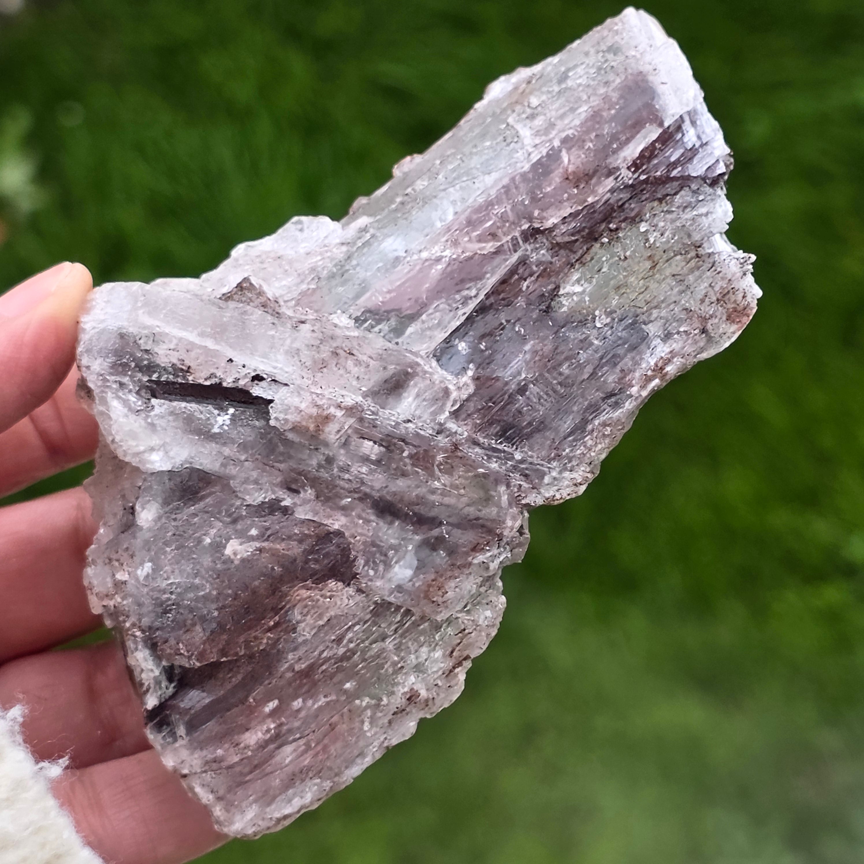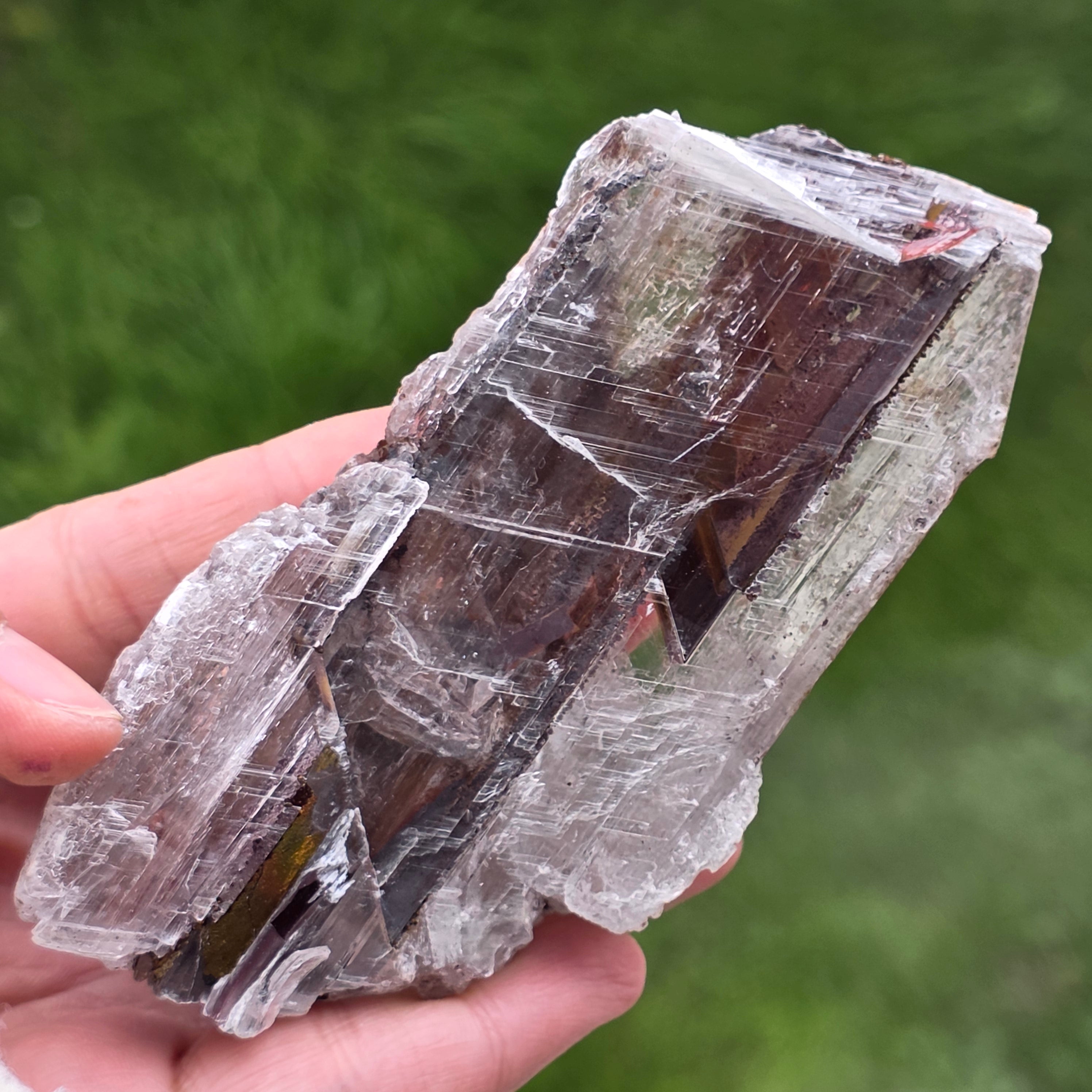 Selenite appears in the form of elongated crystals or translucent plates, with a silky luster and fine texture, while hematite is present in the form of inclusions, films, or natural deposits, which enhance the crystal's structure and give it visual depth.