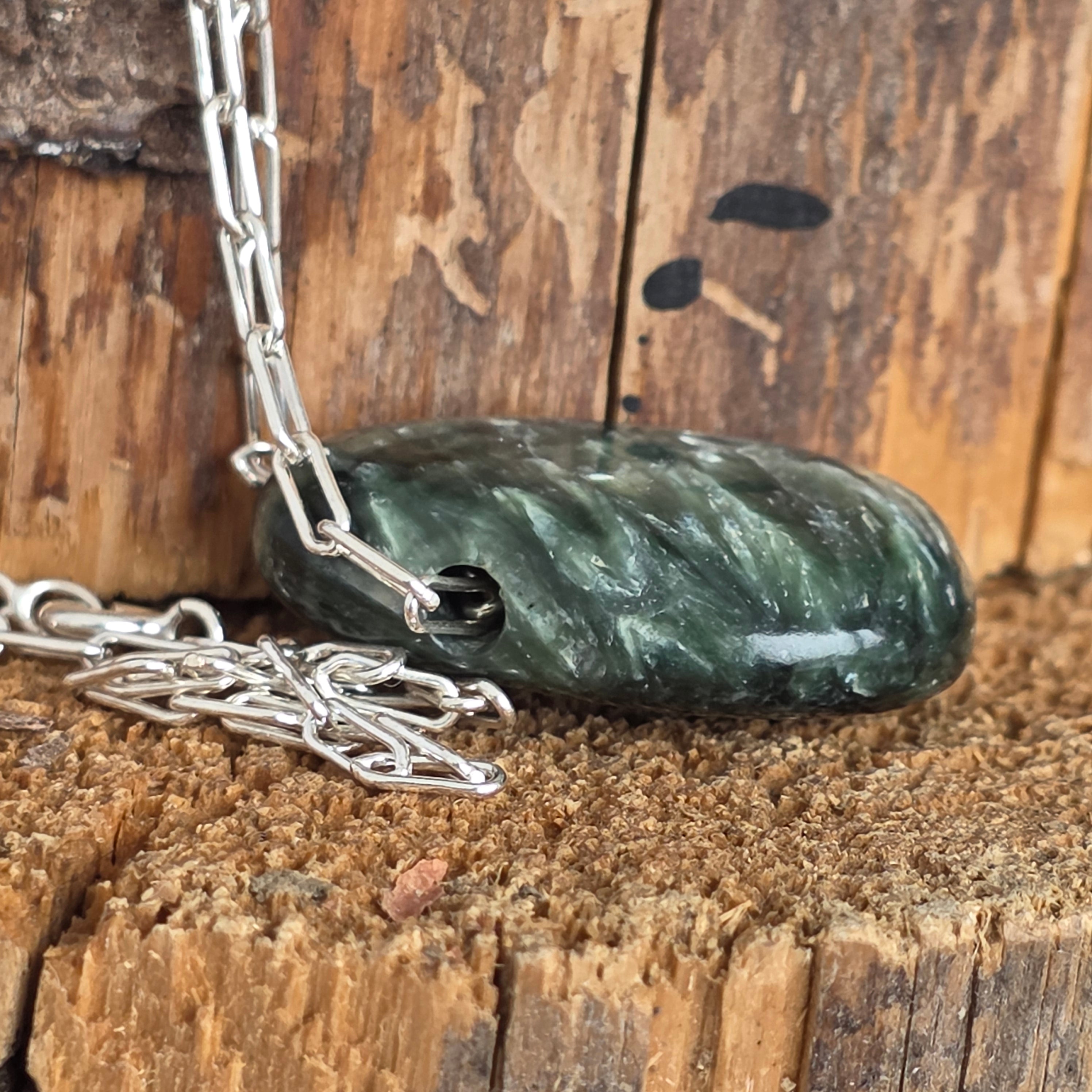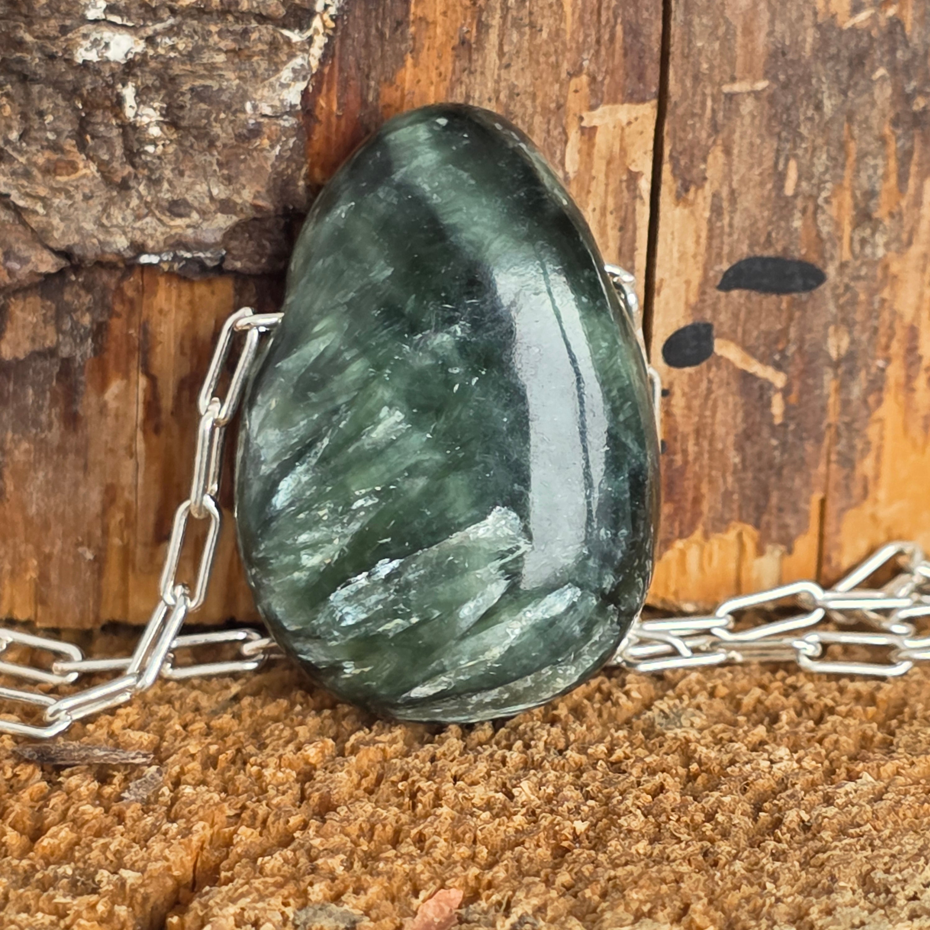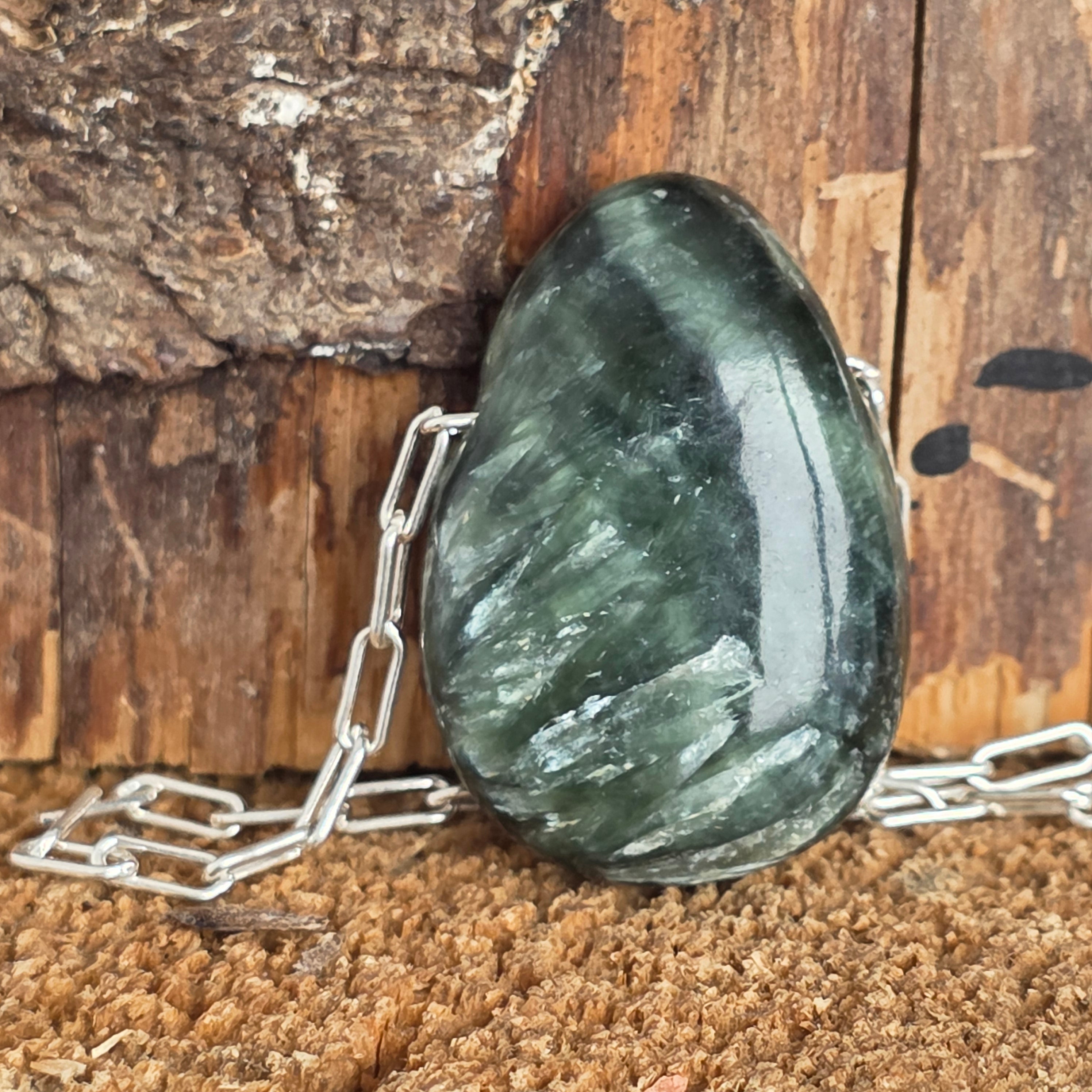 A necklace with a calm and expressive presence, built around a natural seraphinite pendant, cut in a drop shape, measuring 2.9 cm, left free on a fine silver chain. Without a setting, the stone fully reveals its characteristic texture, with silky iridescence in deep green shades and silvery reflections, creating a natural, almost vegetal pattern. The simplicity of the composition emphasizes the authentic beauty of the seraphinite, without elements that diminish its expression.