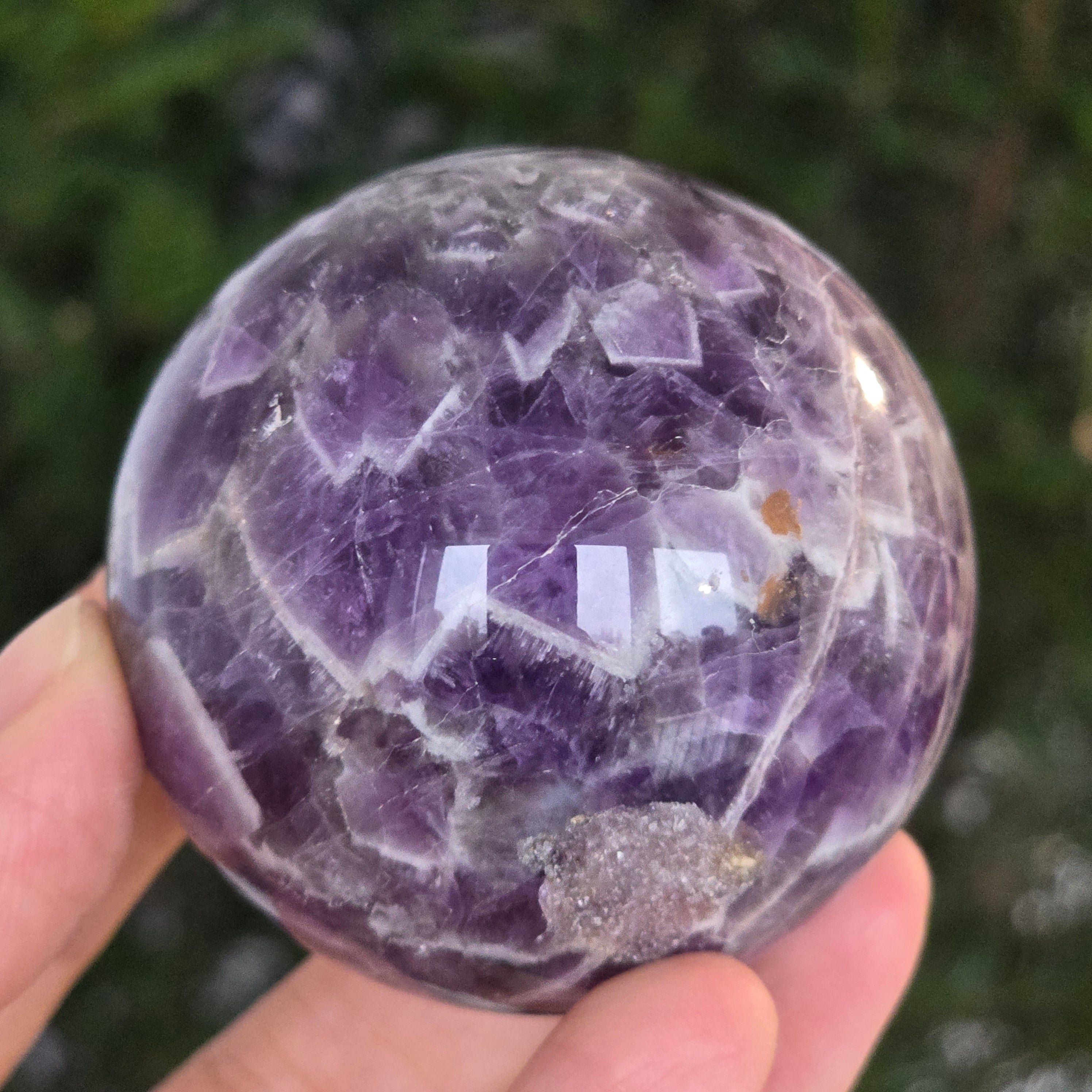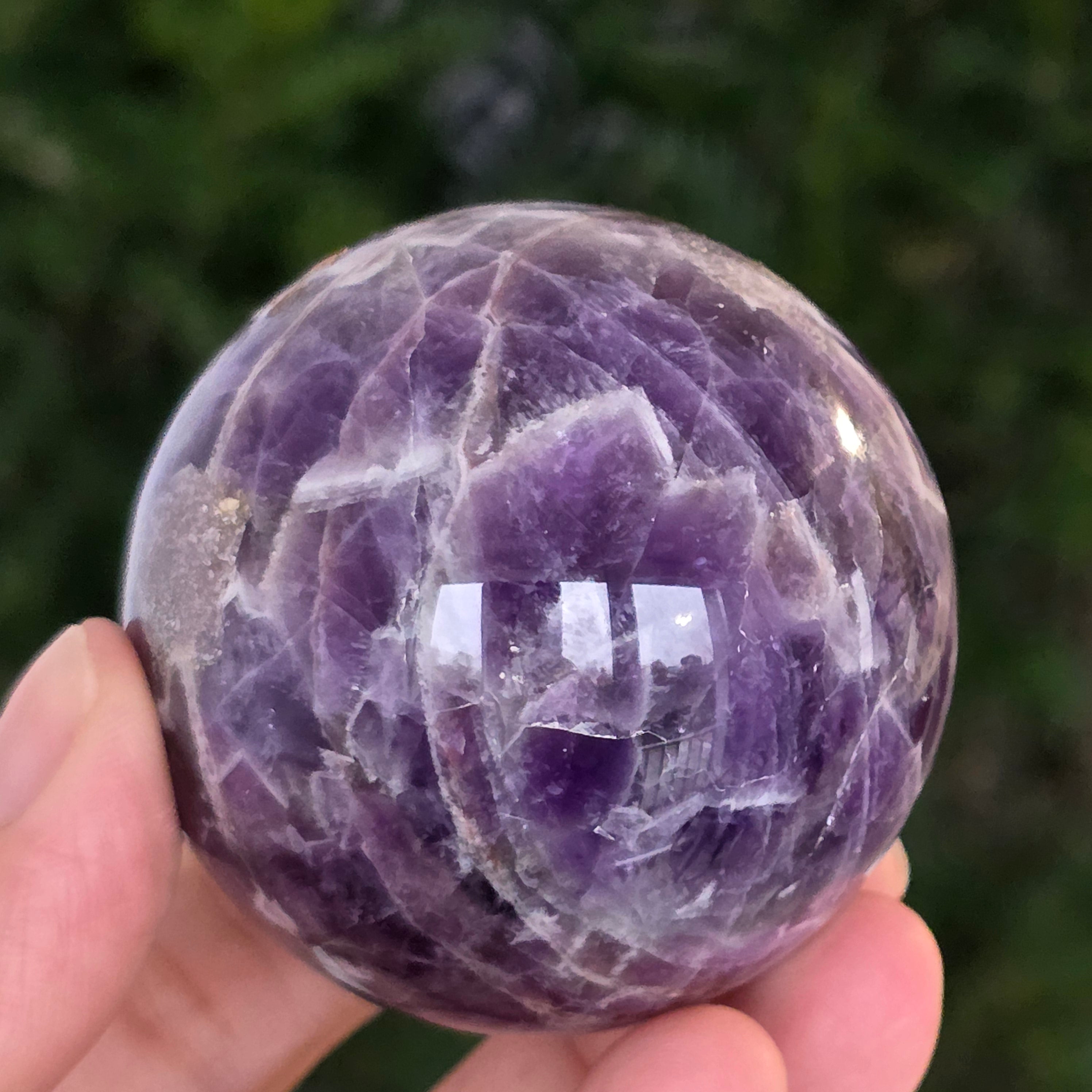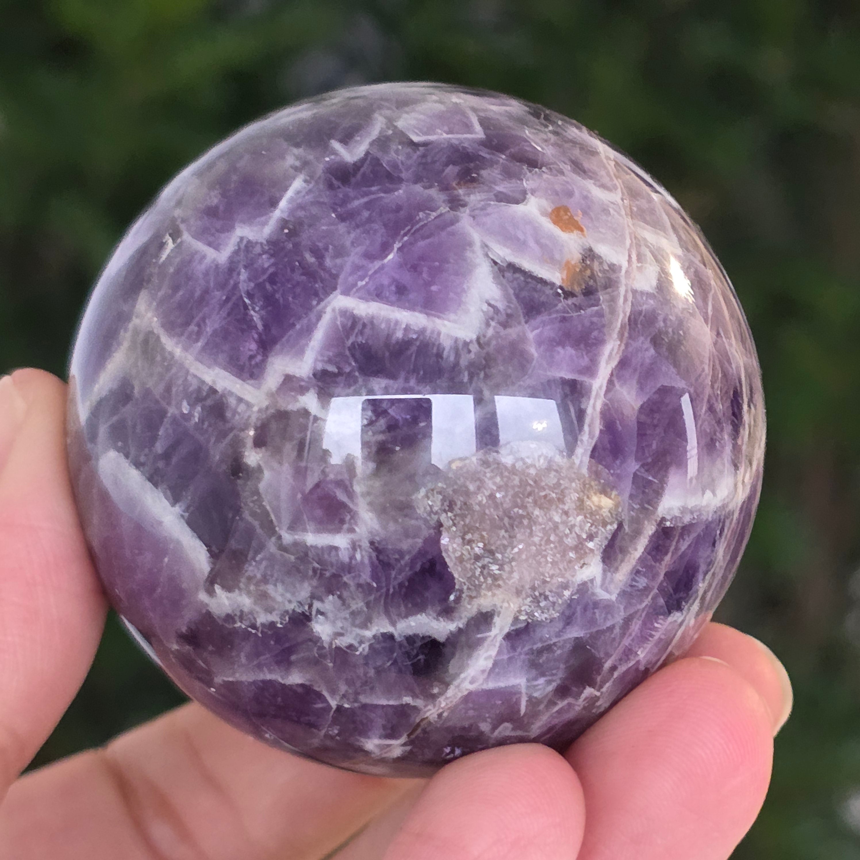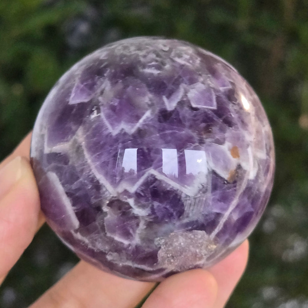 O sferă ce pare să concentreze în interior lumina unei nopți liliachii. Această piesă unicat din ametist chevron natural, dezvăluie straturi uimitoare de violet, alb și lavandă, dispuse în forme în V – semnul distinctiv al acestei varietăți rare de ametist. Suprafața perfect șlefuită, catifelată la atingere, oglindește lumina cu o finețe hipnotică, aducând liniște și rafinament în orice spațiu.