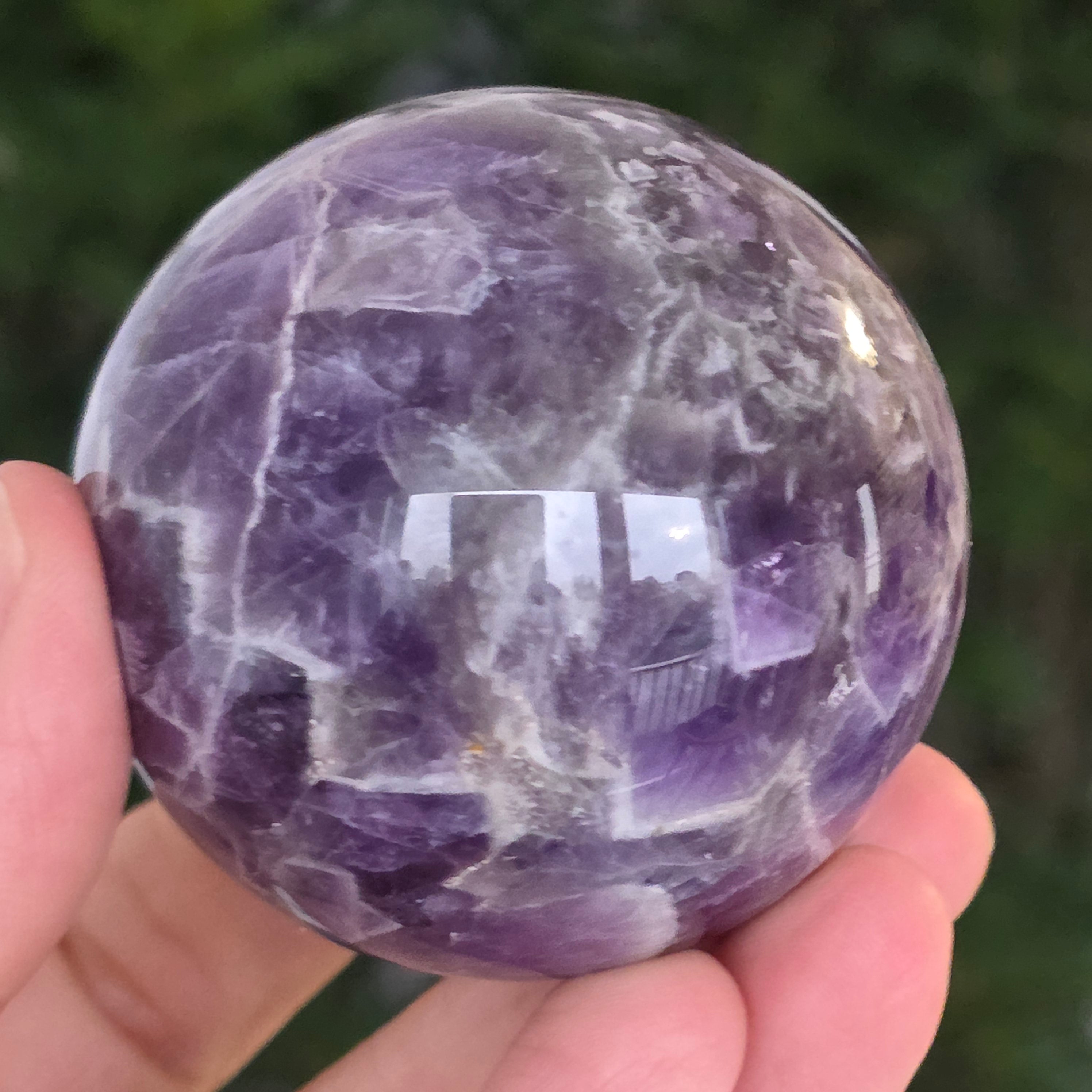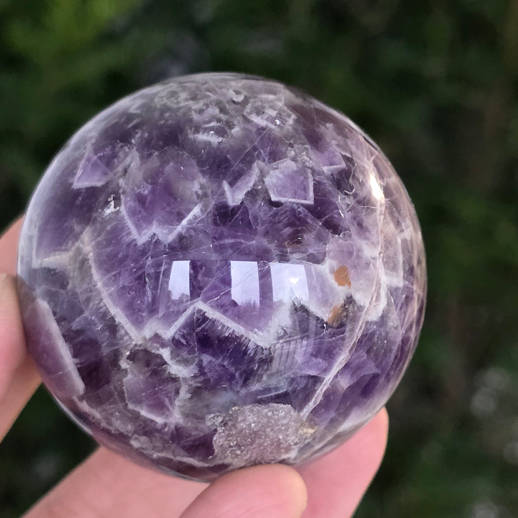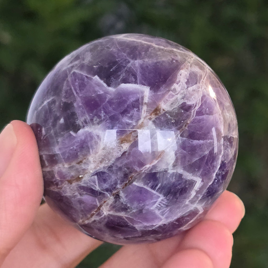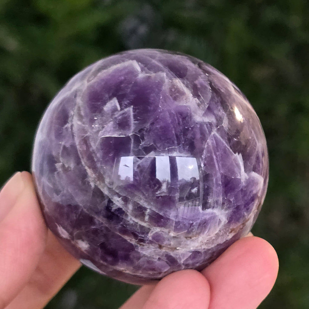 O sferă ce pare să concentreze în interior lumina unei nopți liliachii. Această piesă unicat din ametist chevron natural, dezvăluie straturi uimitoare de violet, alb și lavandă, dispuse în forme în V – semnul distinctiv al acestei varietăți rare de ametist. Suprafața perfect șlefuită, catifelată la atingere, oglindește lumina cu o finețe hipnotică, aducând liniște și rafinament în orice spațiu.