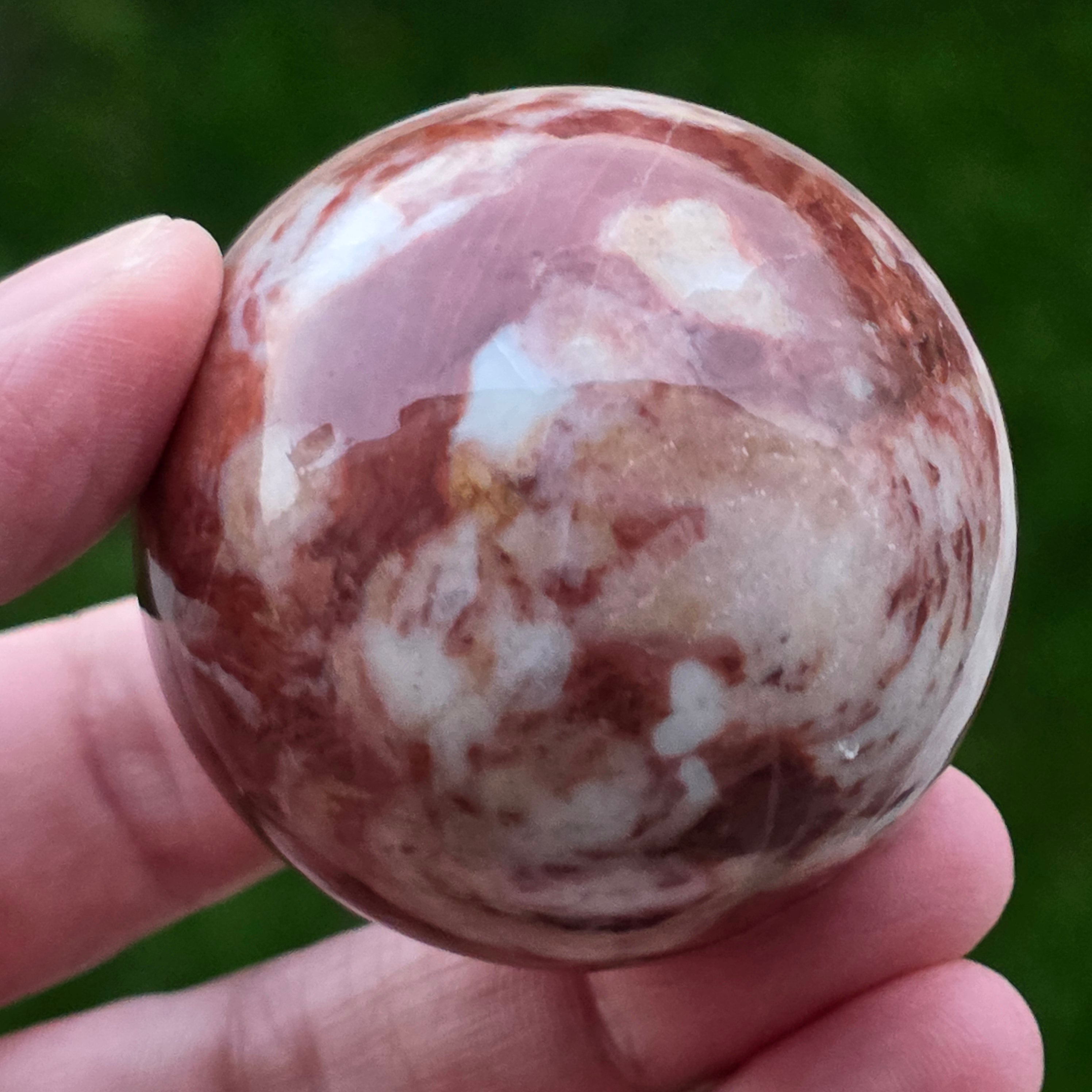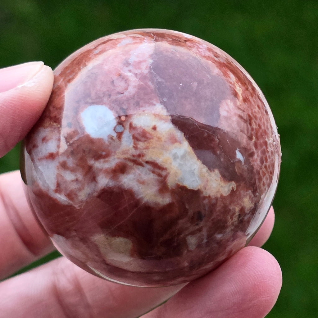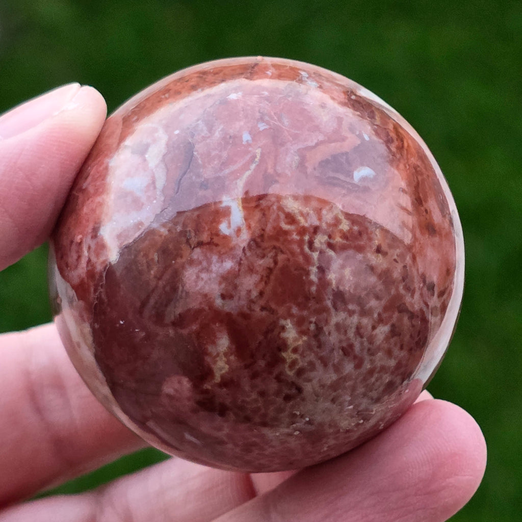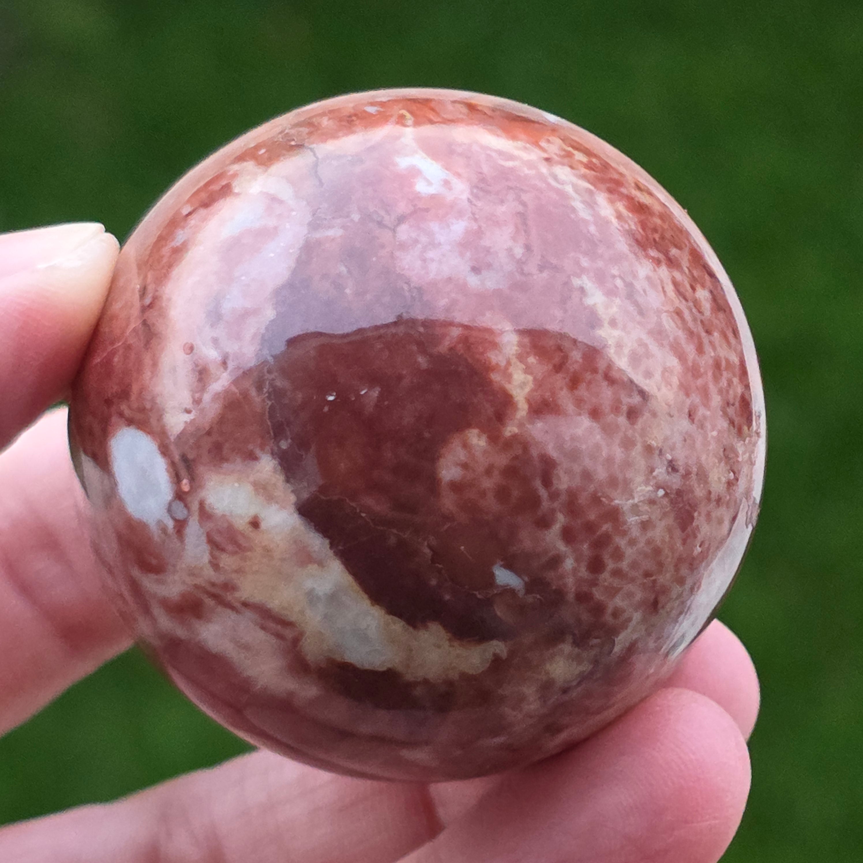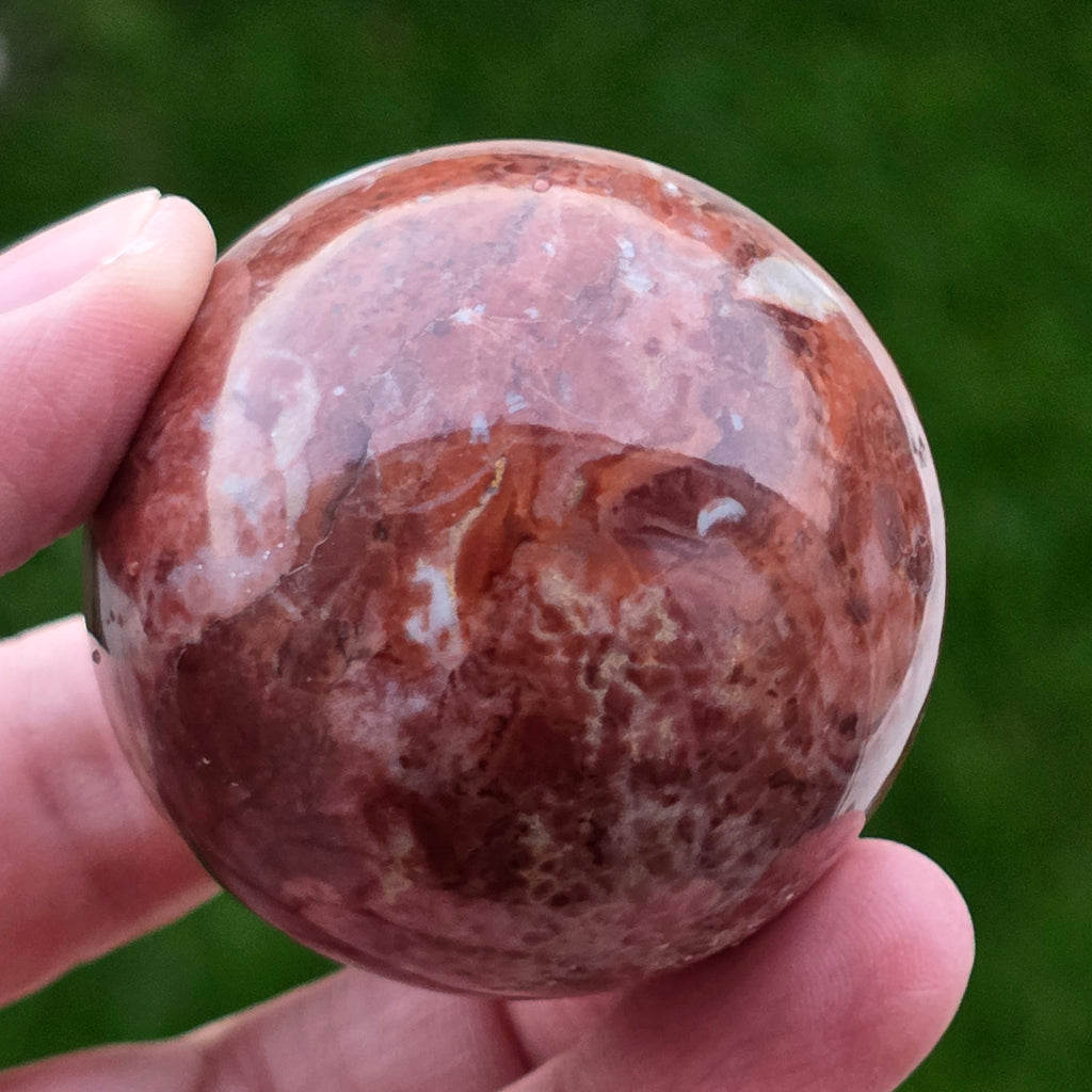 Sfera din Jasp Căpșună este o piesă vibrantă și expresivă, sculptată cu atenție pentru a evidenția nuanțele calde de roșu căpșună, texturile organice și desenul mineral specific acestei varietăți de jasp. Fiecare piesă este complet unică, cu modele naturale care se împletesc în forme fluide, evocând stratificarea rocilor și frumusețea lor brută.
