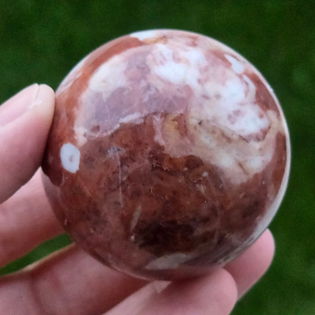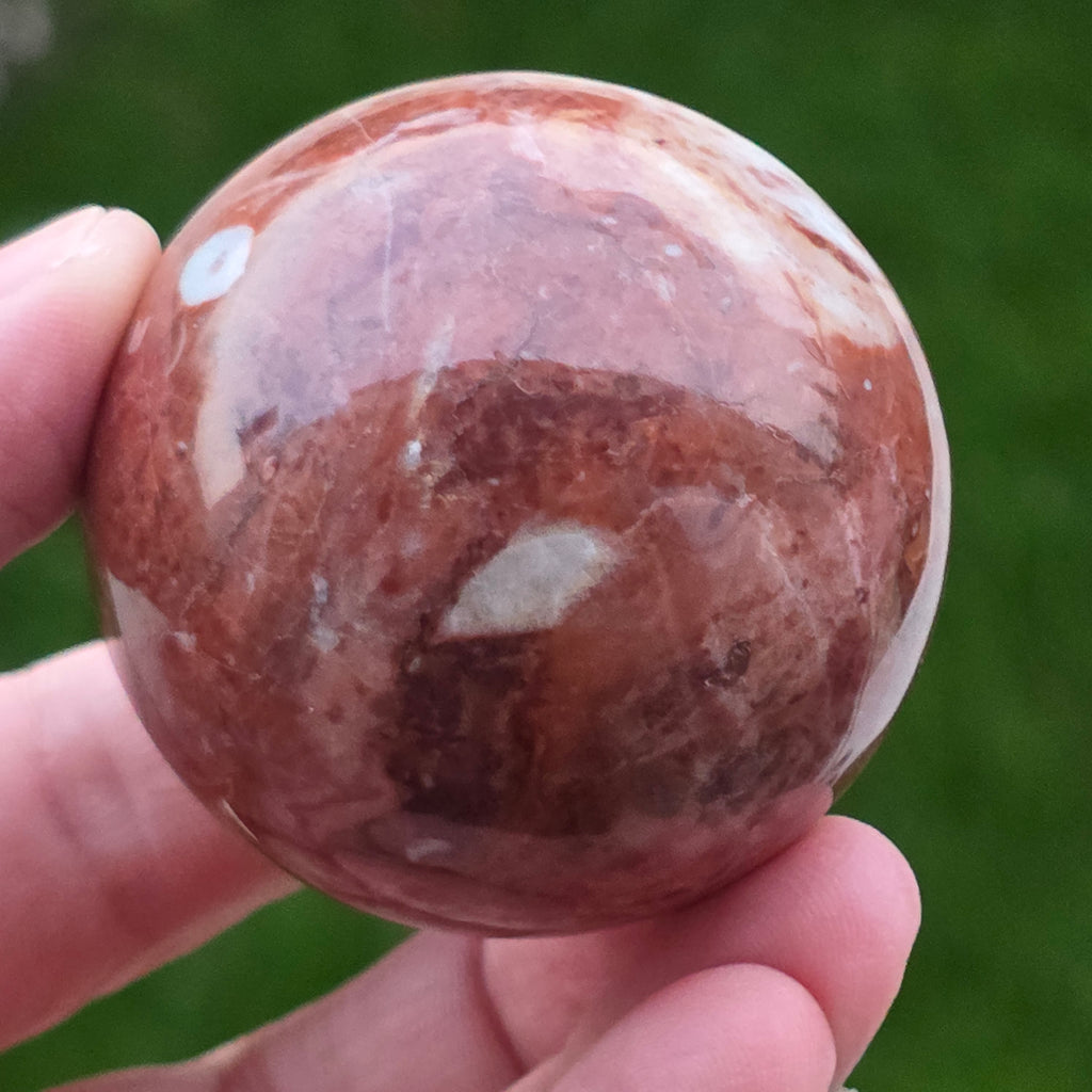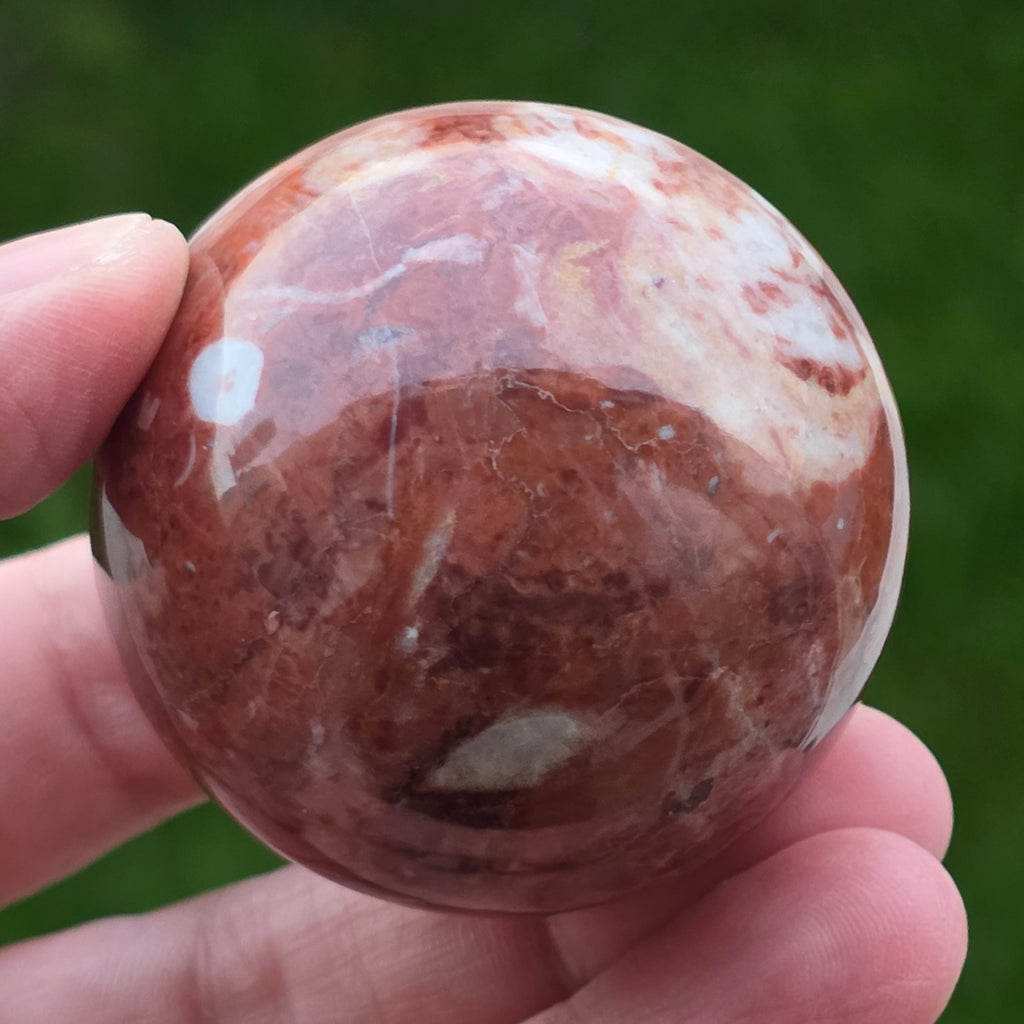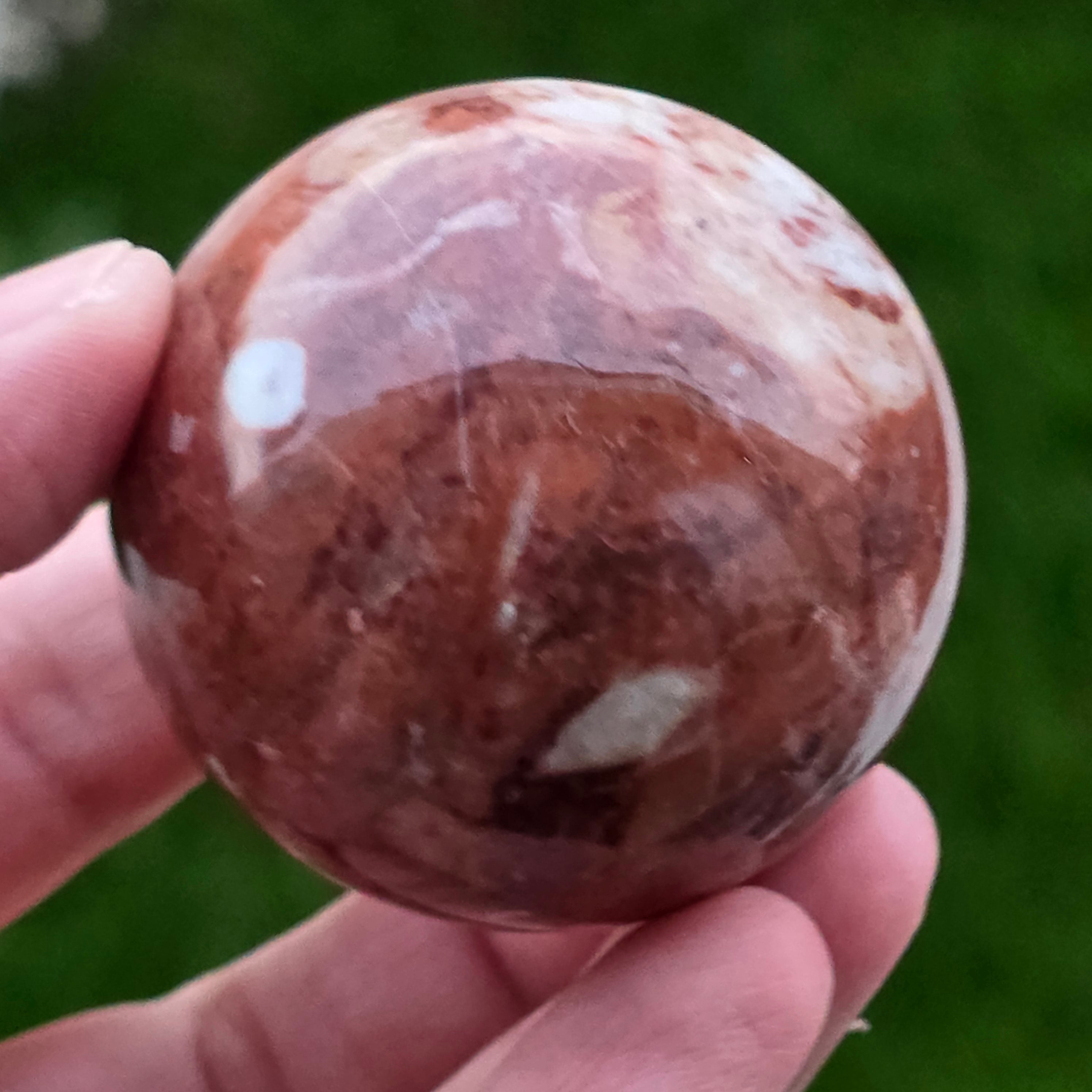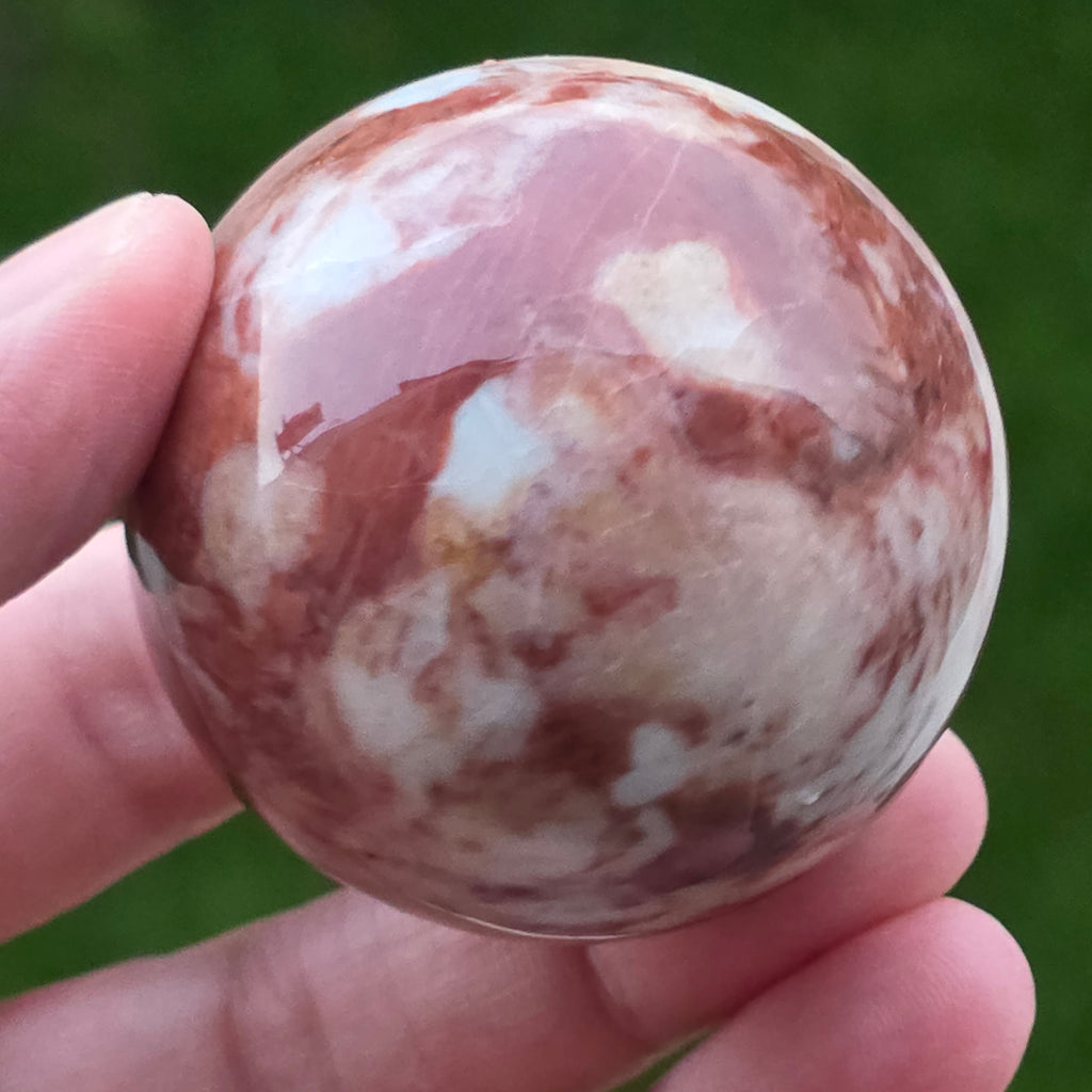 Sfera din Jasp Căpșună este o piesă vibrantă și expresivă, sculptată cu atenție pentru a evidenția nuanțele calde de roșu căpșună, texturile organice și desenul mineral specific acestei varietăți de jasp. Fiecare piesă este complet unică, cu modele naturale care se împletesc în forme fluide, evocând stratificarea rocilor și frumusețea lor brută.