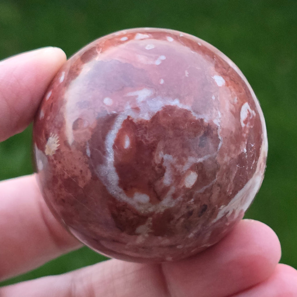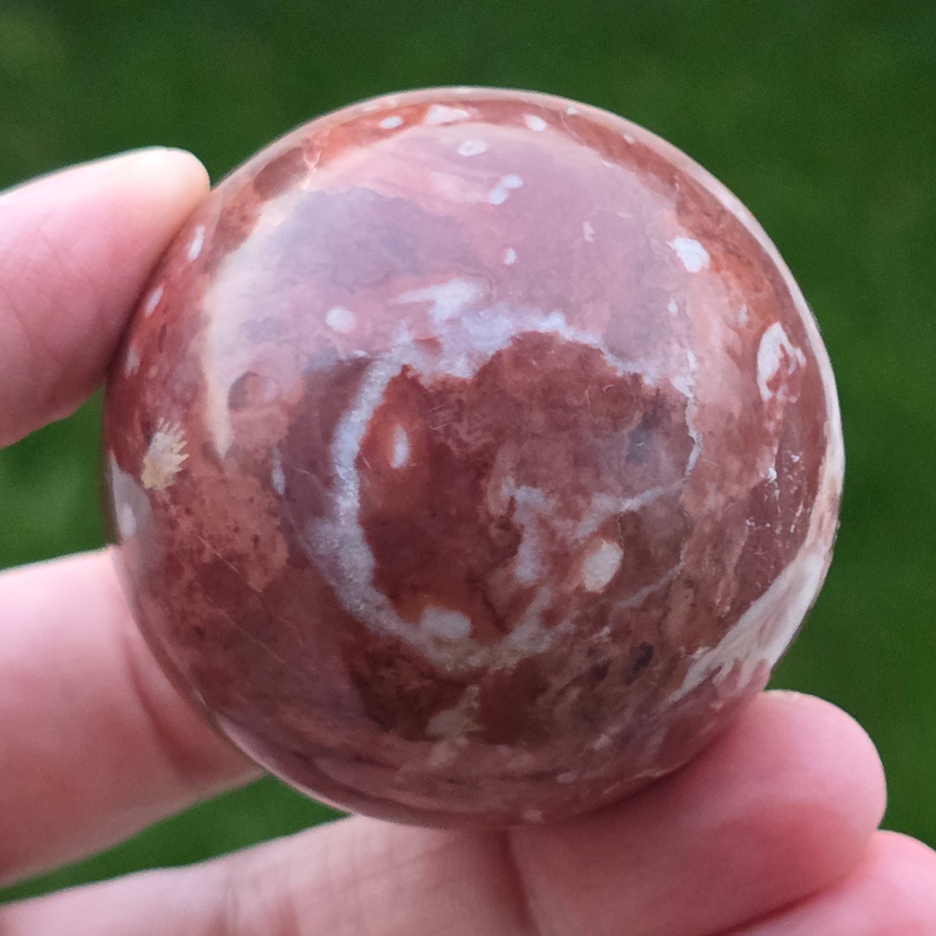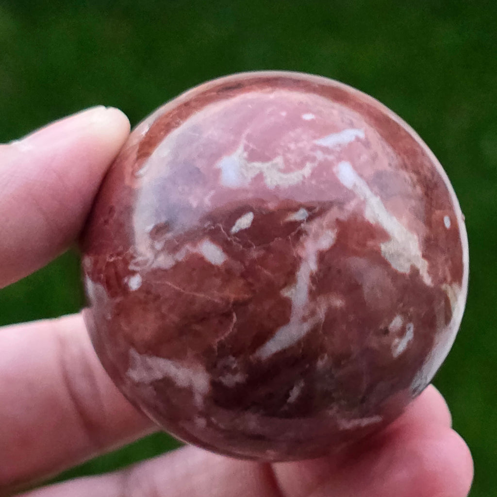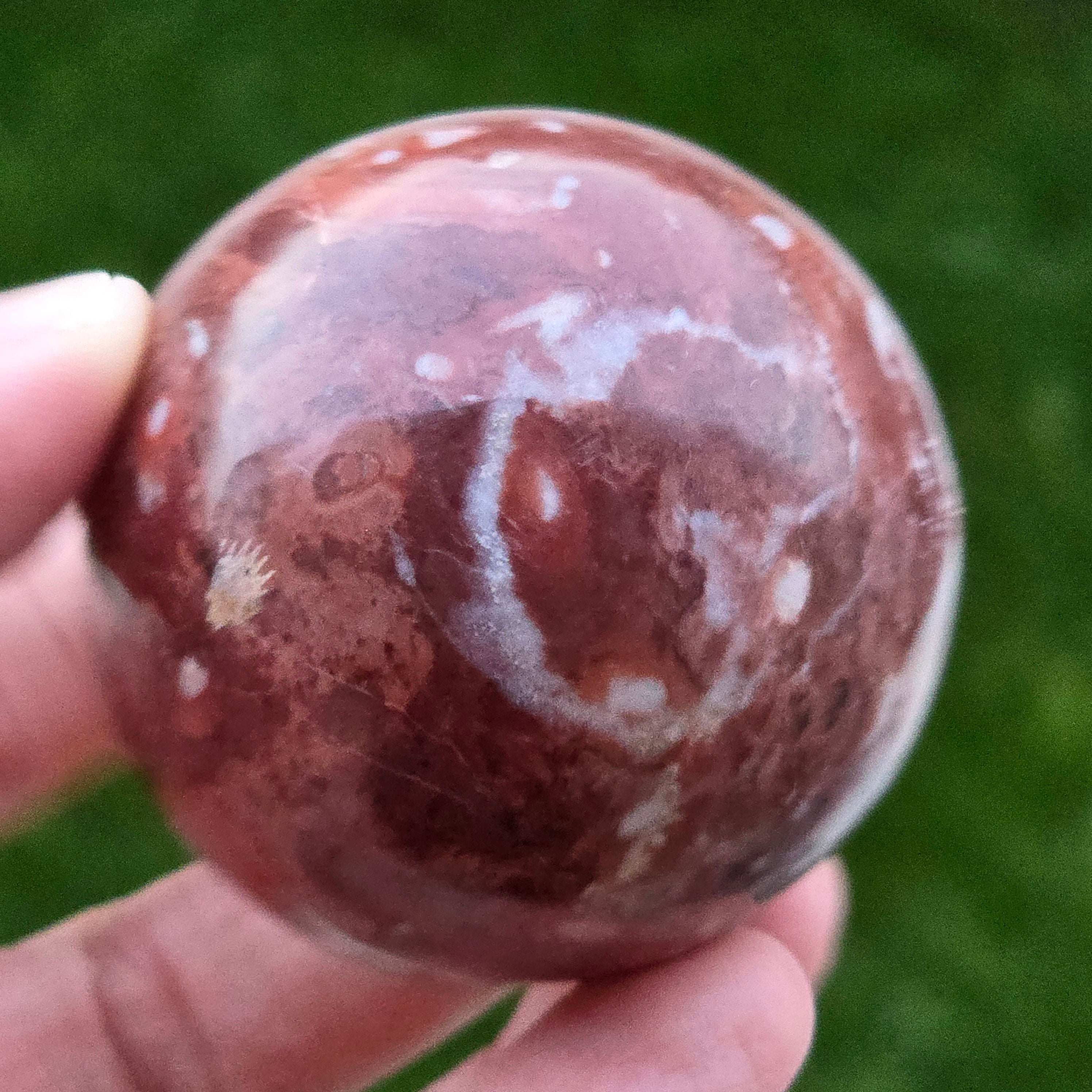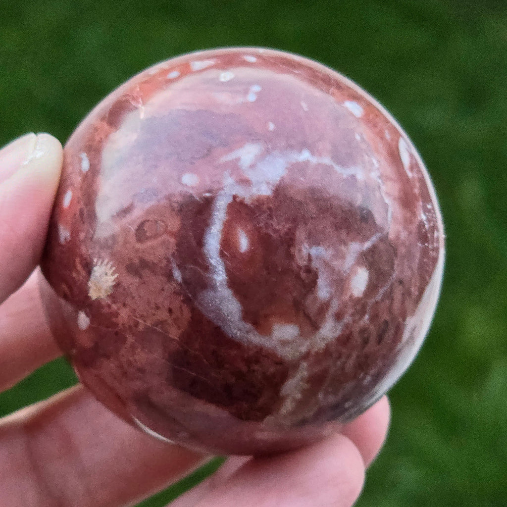 Sfera din Jasp Căpșună este o piesă vibrantă și expresivă, sculptată cu atenție pentru a evidenția nuanțele calde de roșu căpșună, texturile organice și desenul mineral specific acestei varietăți de jasp. Fiecare piesă este complet unică, cu modele naturale care se împletesc în forme fluide, evocând stratificarea rocilor și frumusețea lor brută.