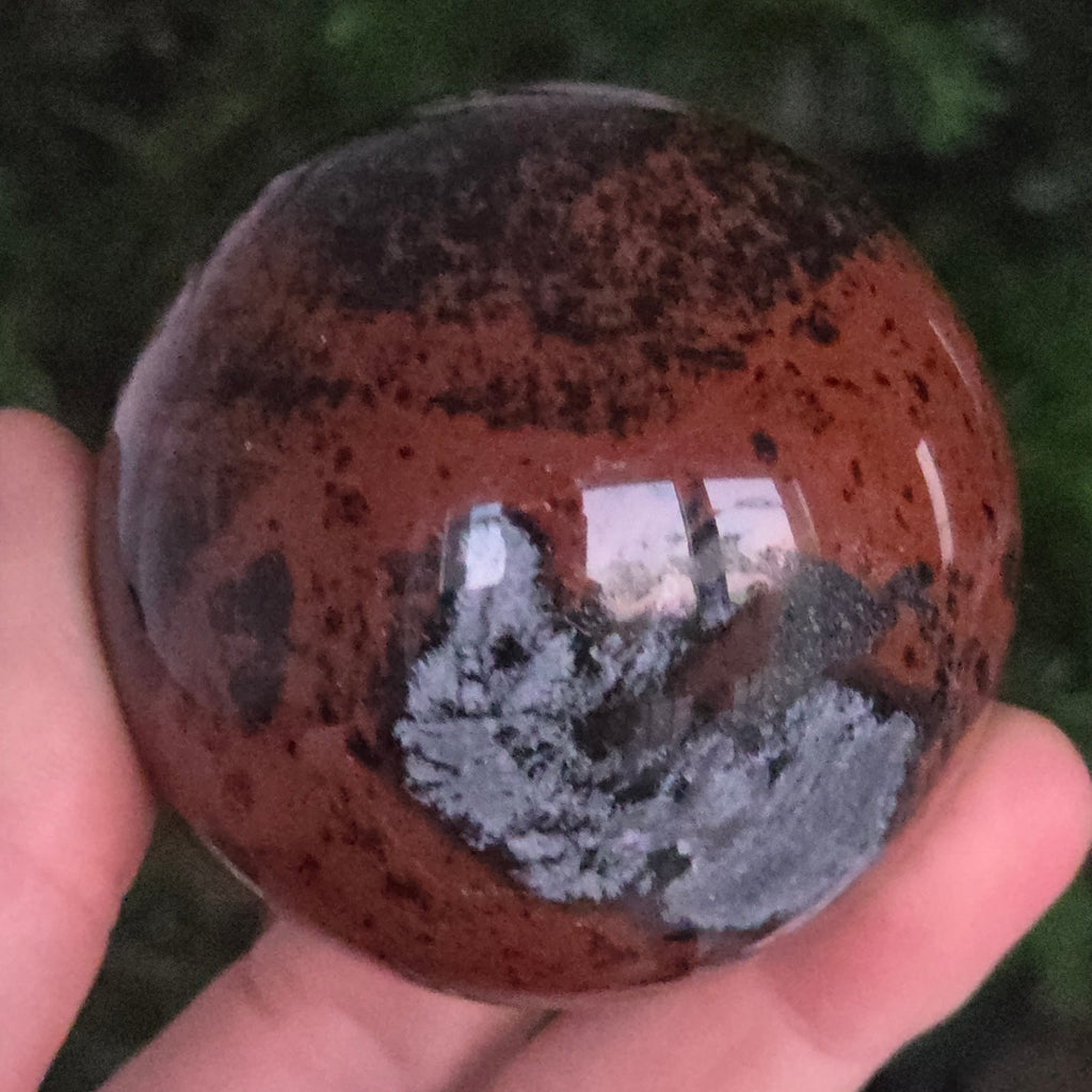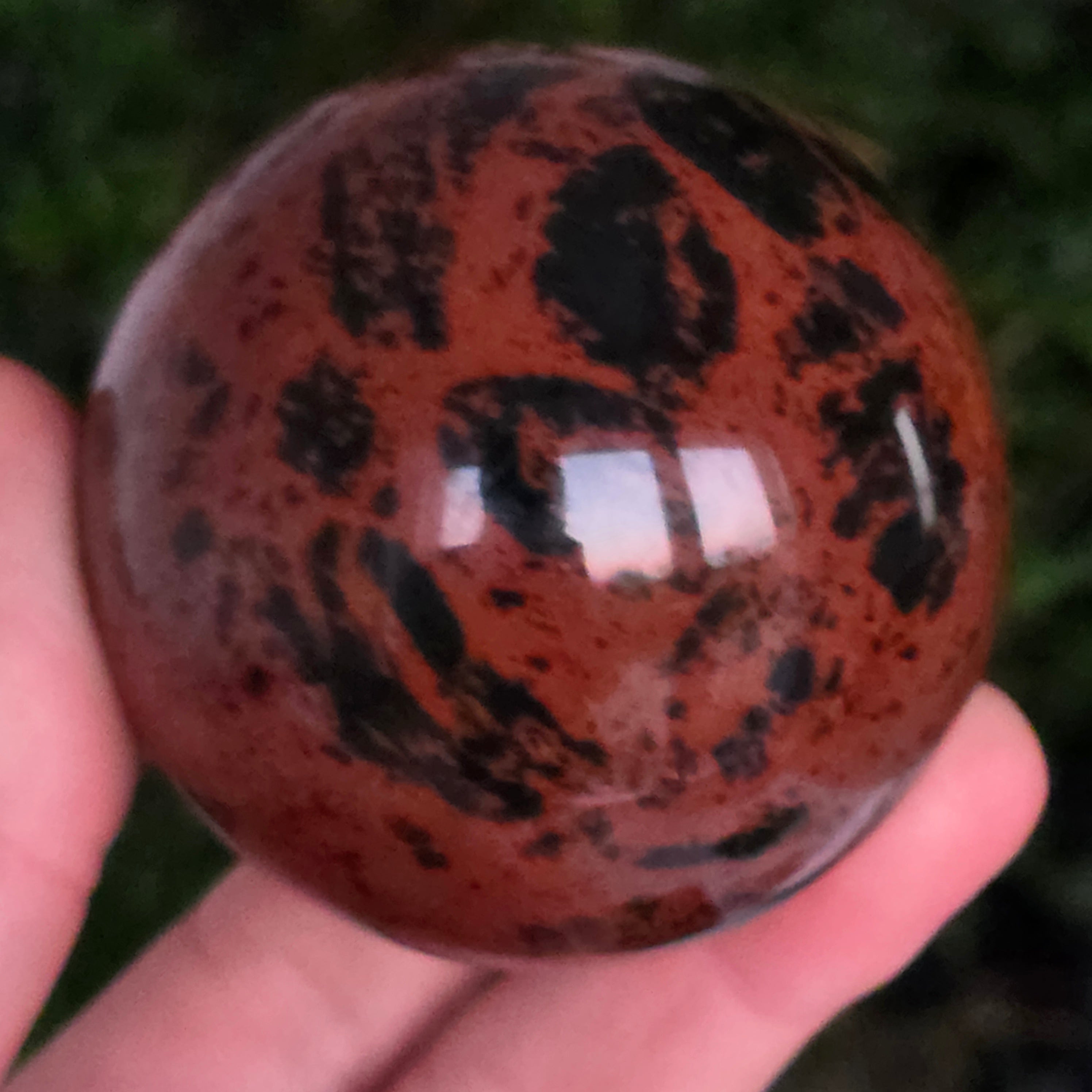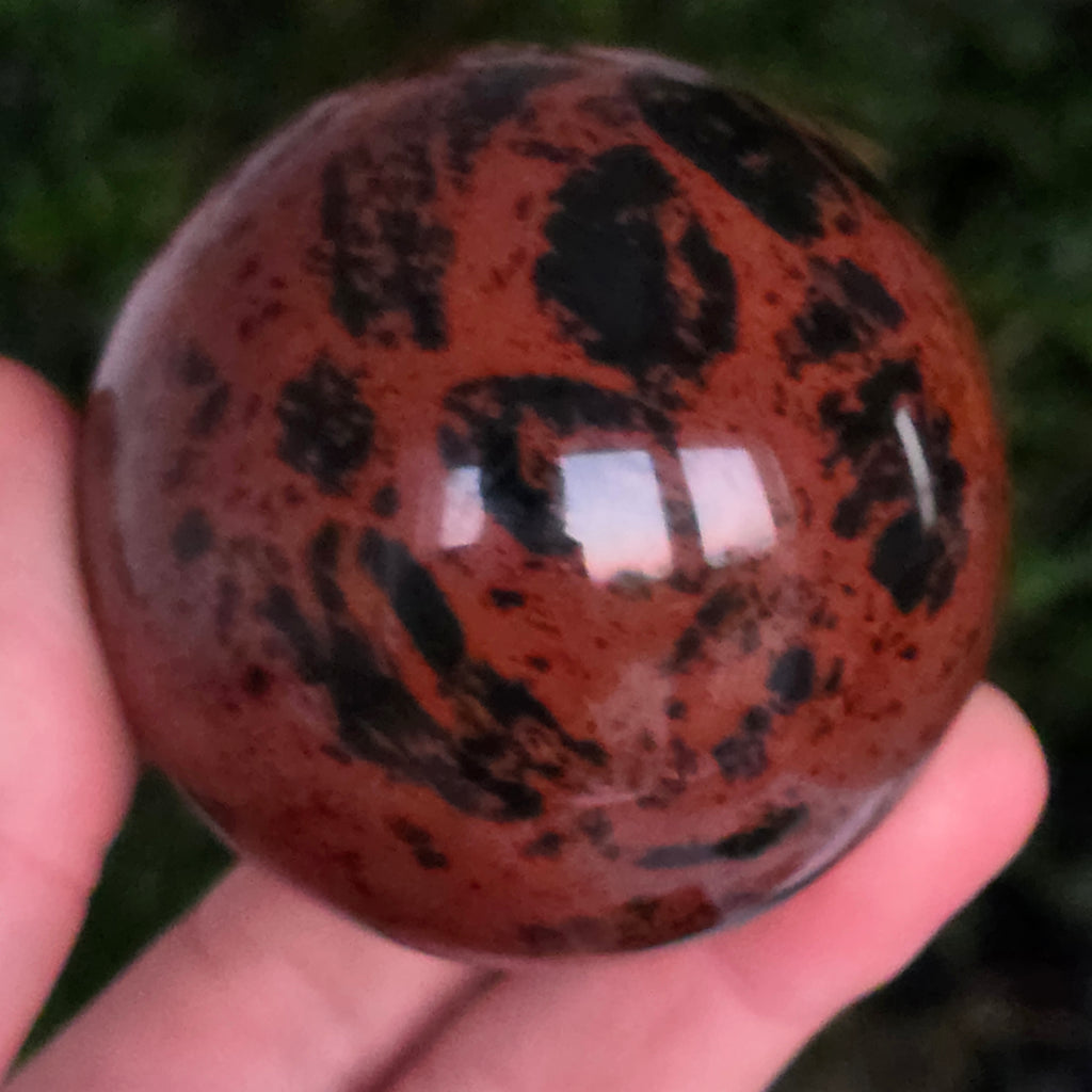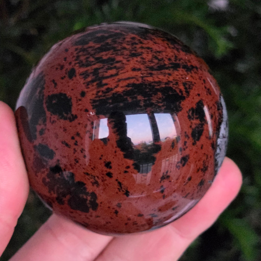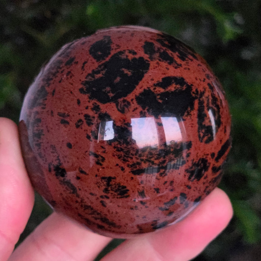 Această sferă din obsidian mahon este o întrupare a forței primordiale a Pământului — o piatră a rădăcinilor, a siguranței și a transformării interioare.
