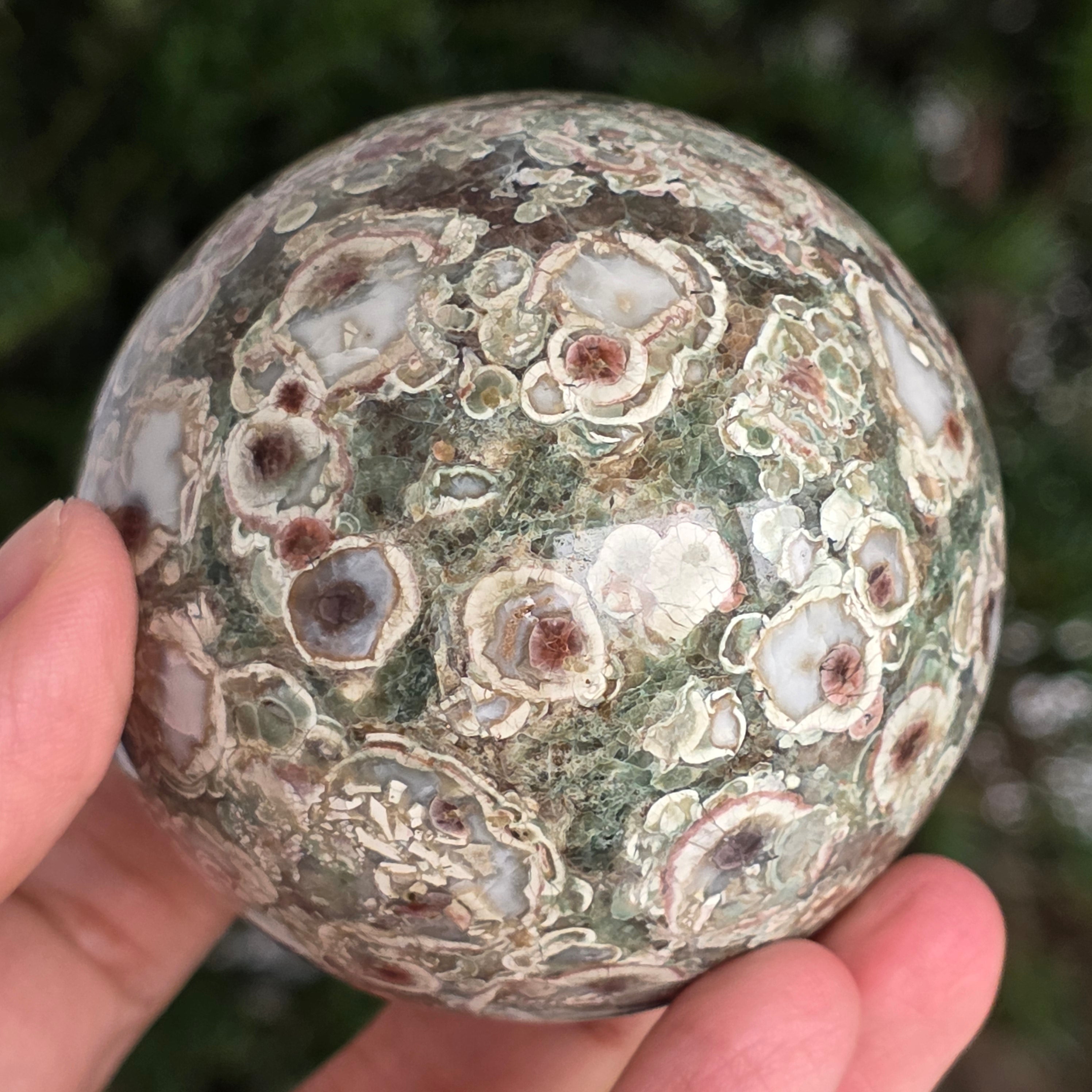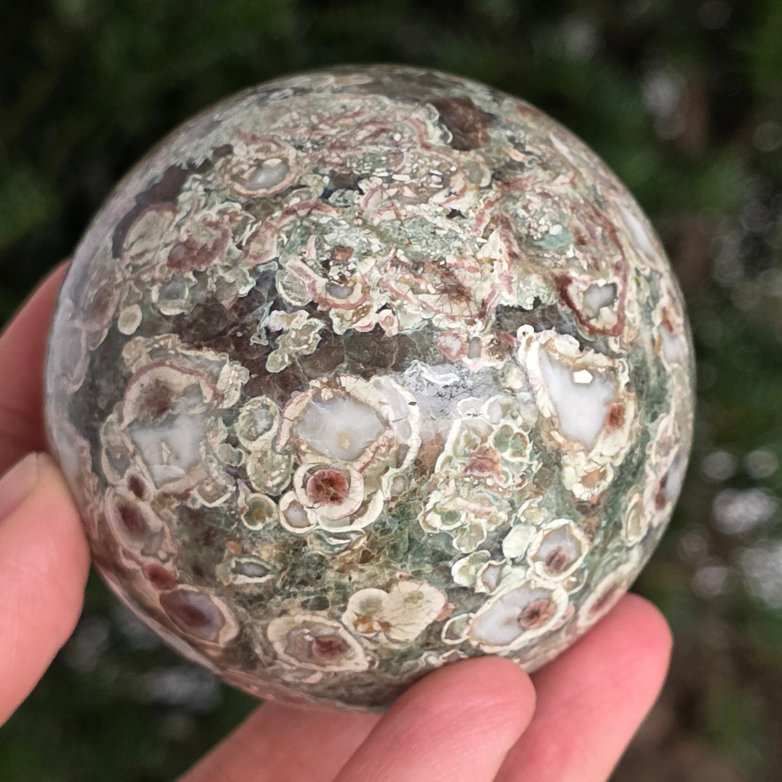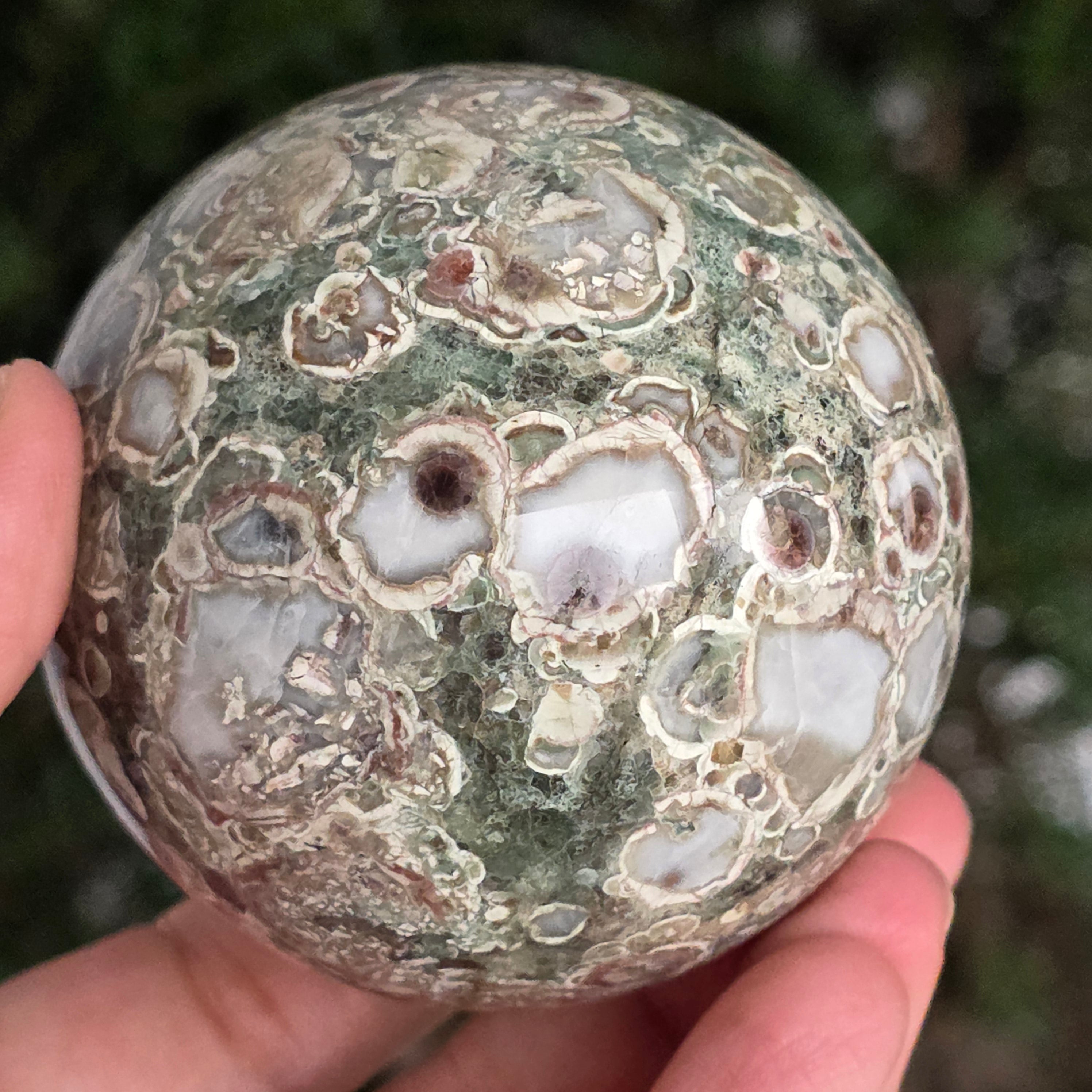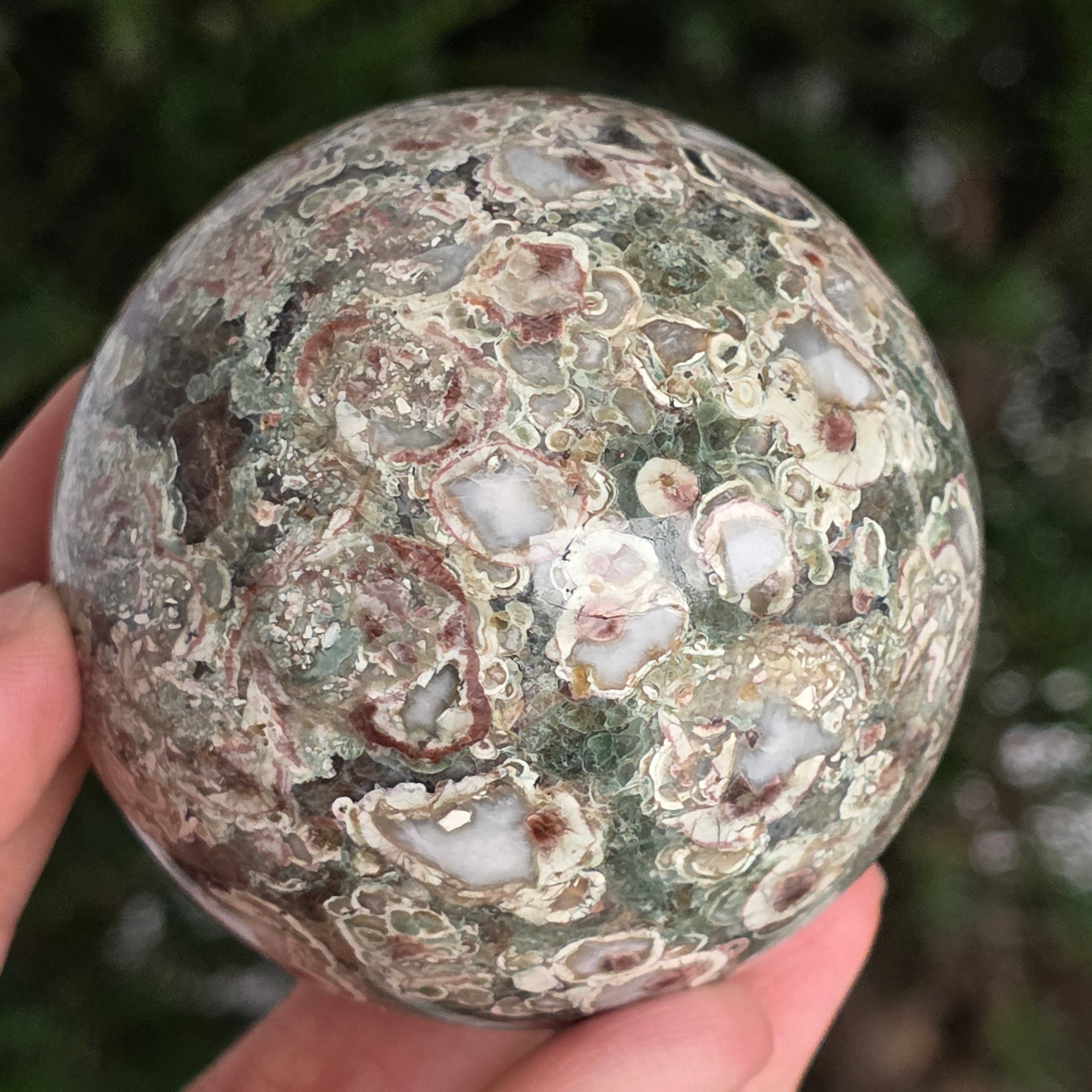 O sferă care poartă în ea urmele unei planete în formare. Texturile vii și culorile pământii ale riolitului natural – nuanțe de verde mușchi, bej, brun și gri vulcanic – se împletesc într-un dans hipnotic de forme și linii, ca o hartă minerală a lumii interioare.