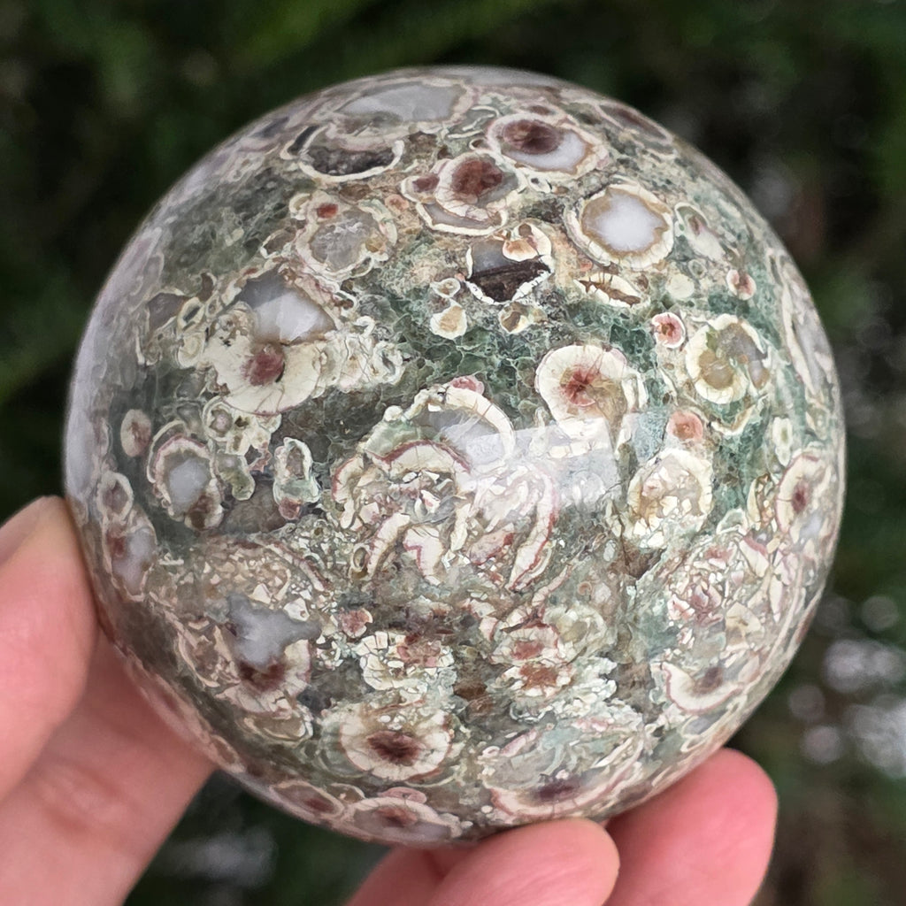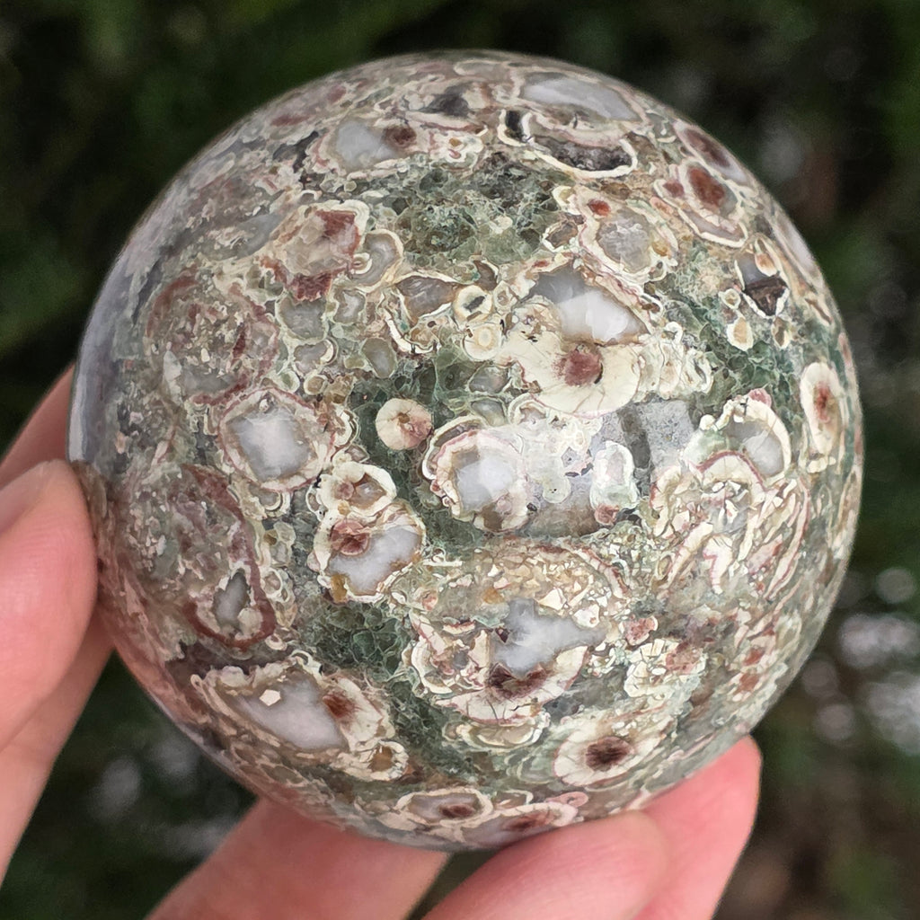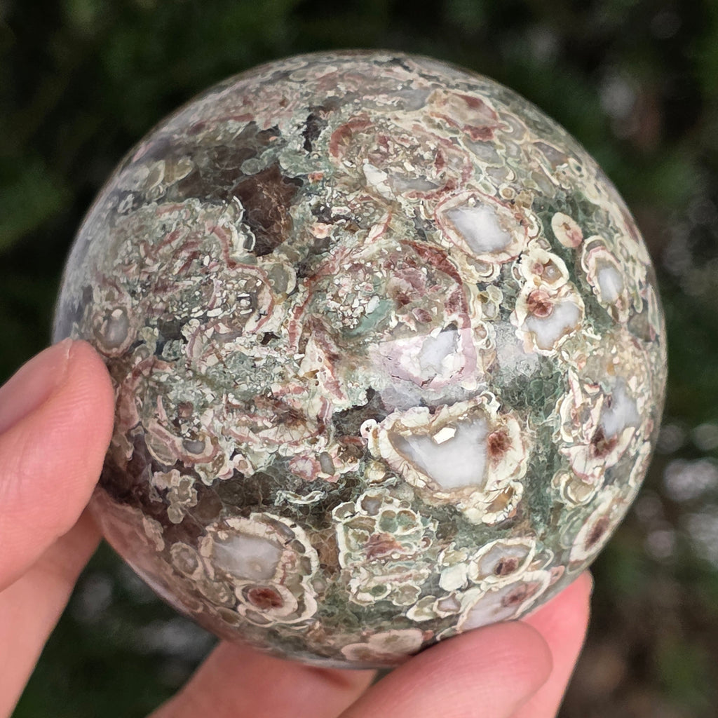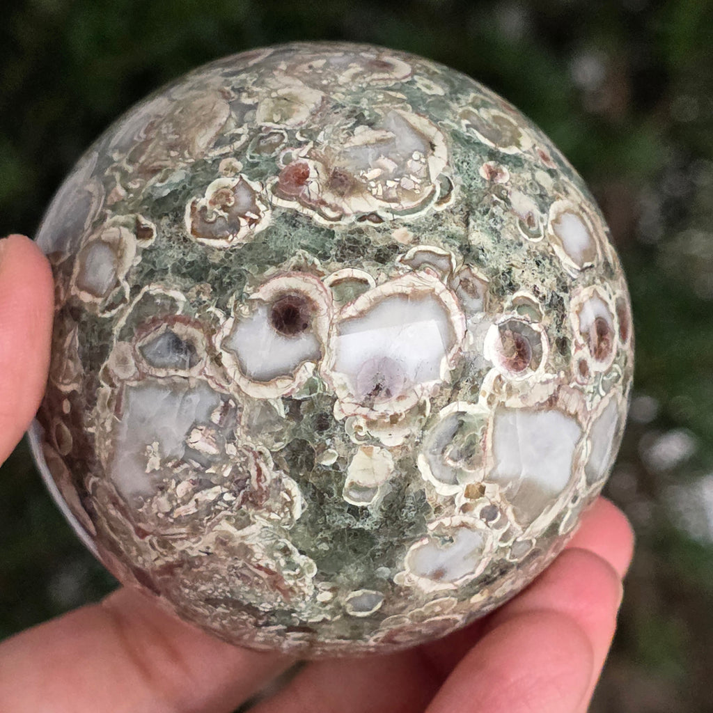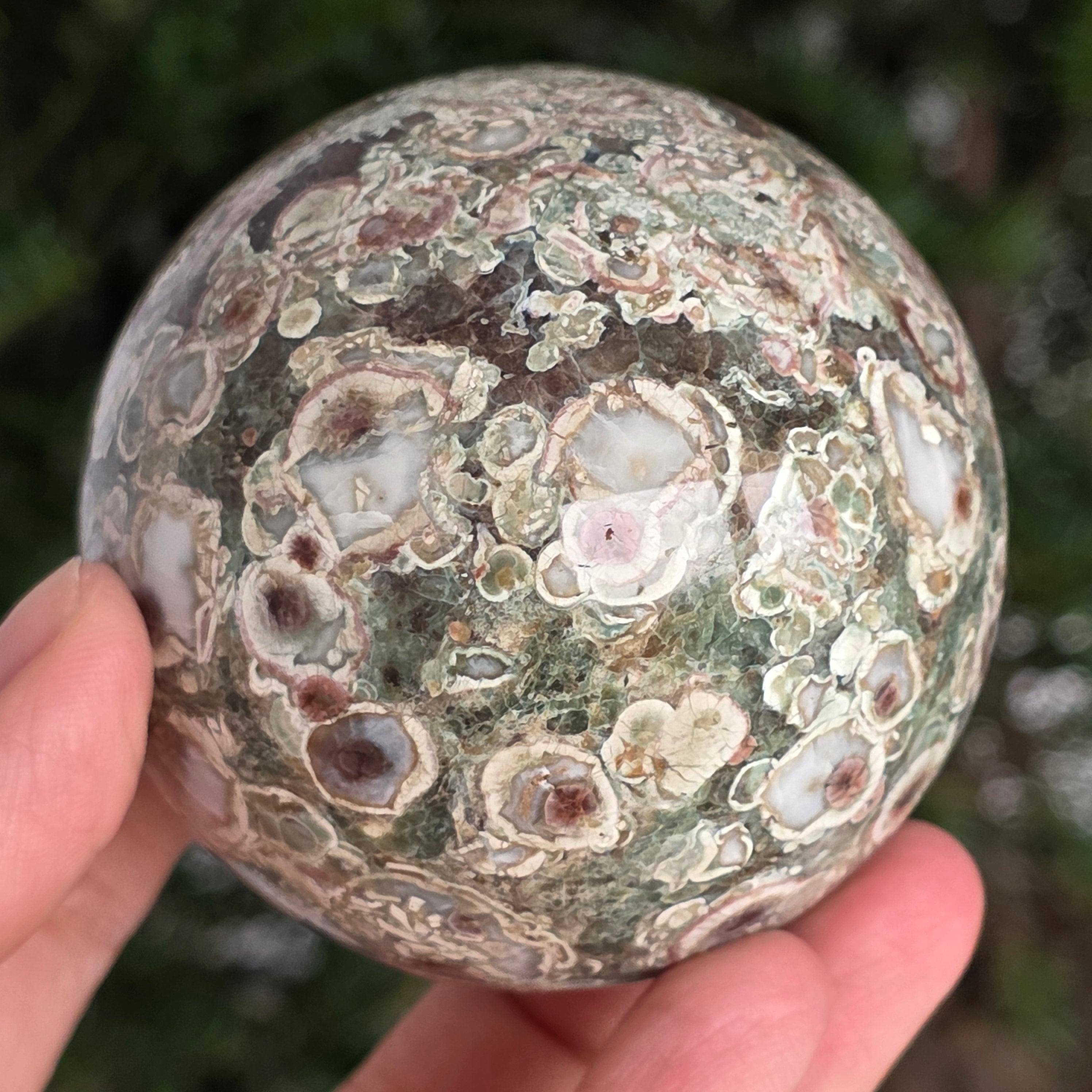 O sferă care poartă în ea urmele unei planete în formare. Texturile vii și culorile pământii ale riolitului natural – nuanțe de verde mușchi, bej, brun și gri vulcanic – se împletesc într-un dans hipnotic de forme și linii, ca o hartă minerală a lumii interioare.