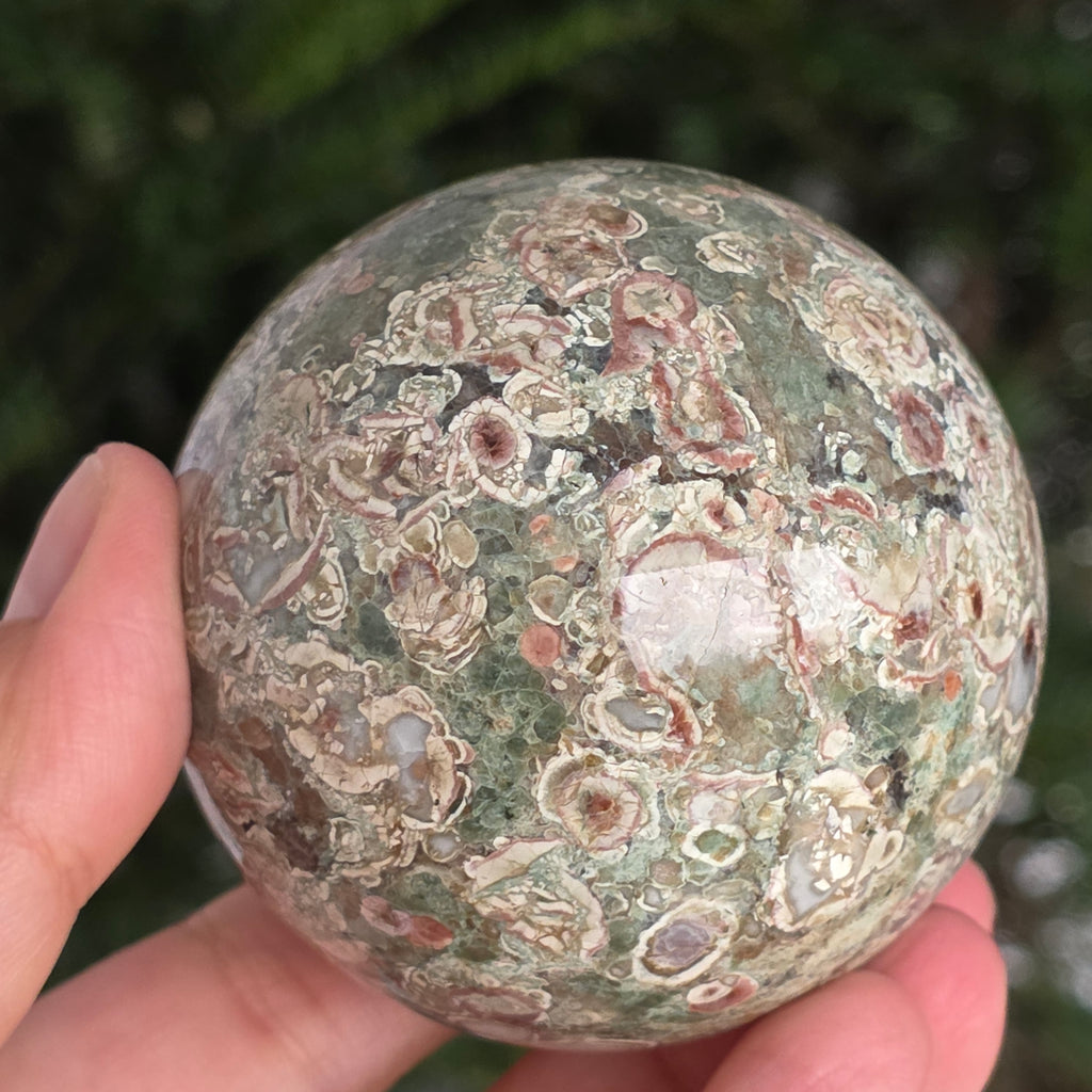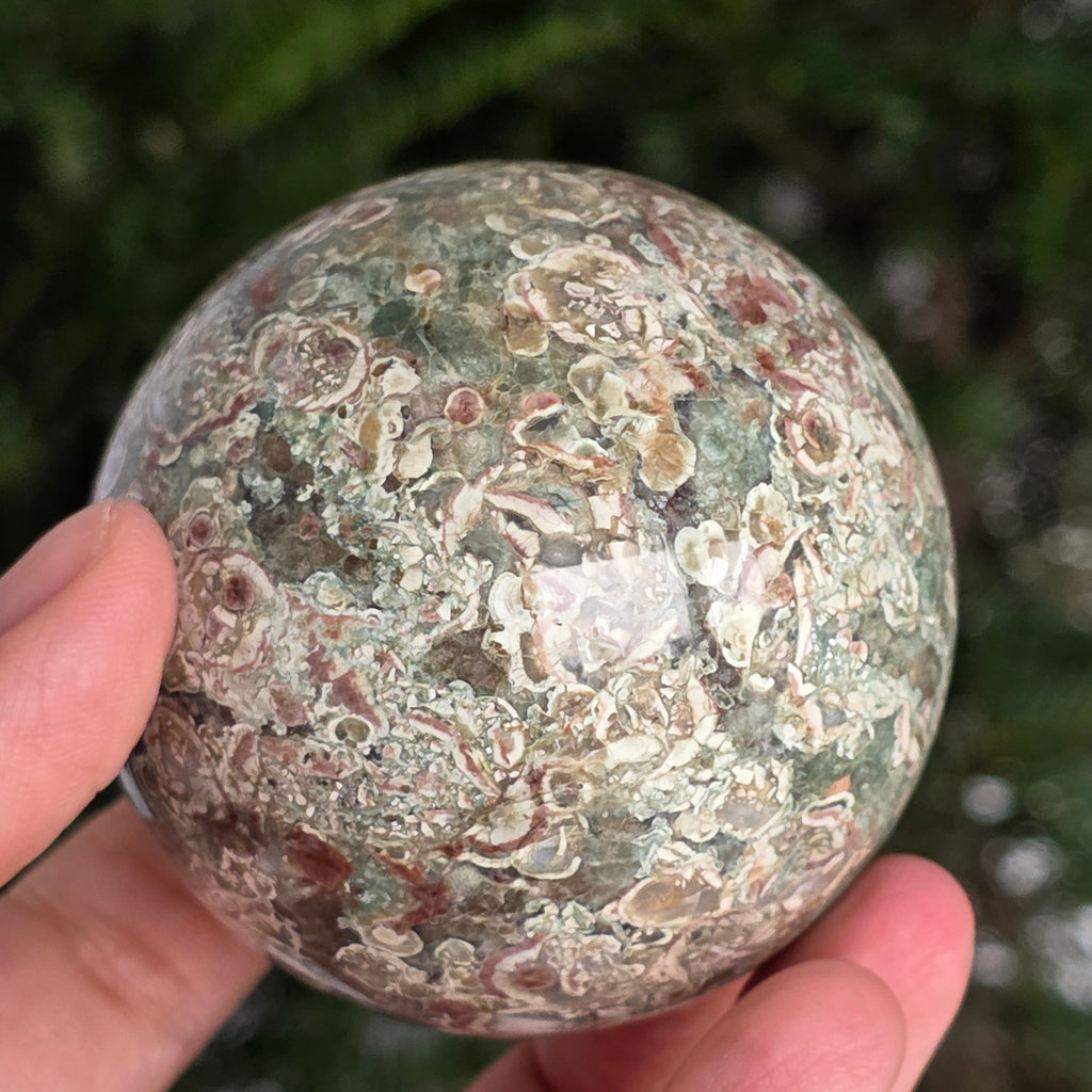 O sferă care poartă în ea urmele unei planete în formare. Texturile vii și culorile pământii ale riolitului natural – nuanțe de verde mușchi, bej, brun și gri vulcanic – se împletesc într-un dans hipnotic de forme și linii, ca o hartă minerală a lumii interioare.