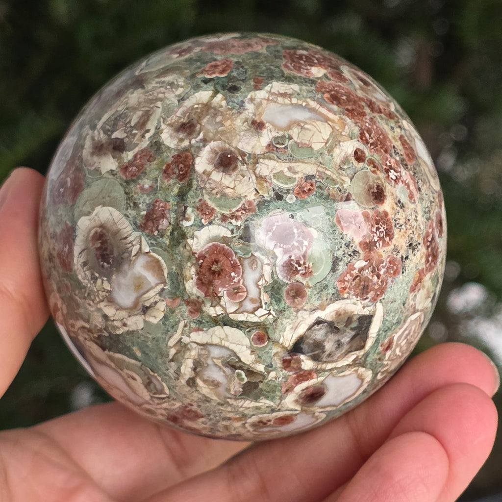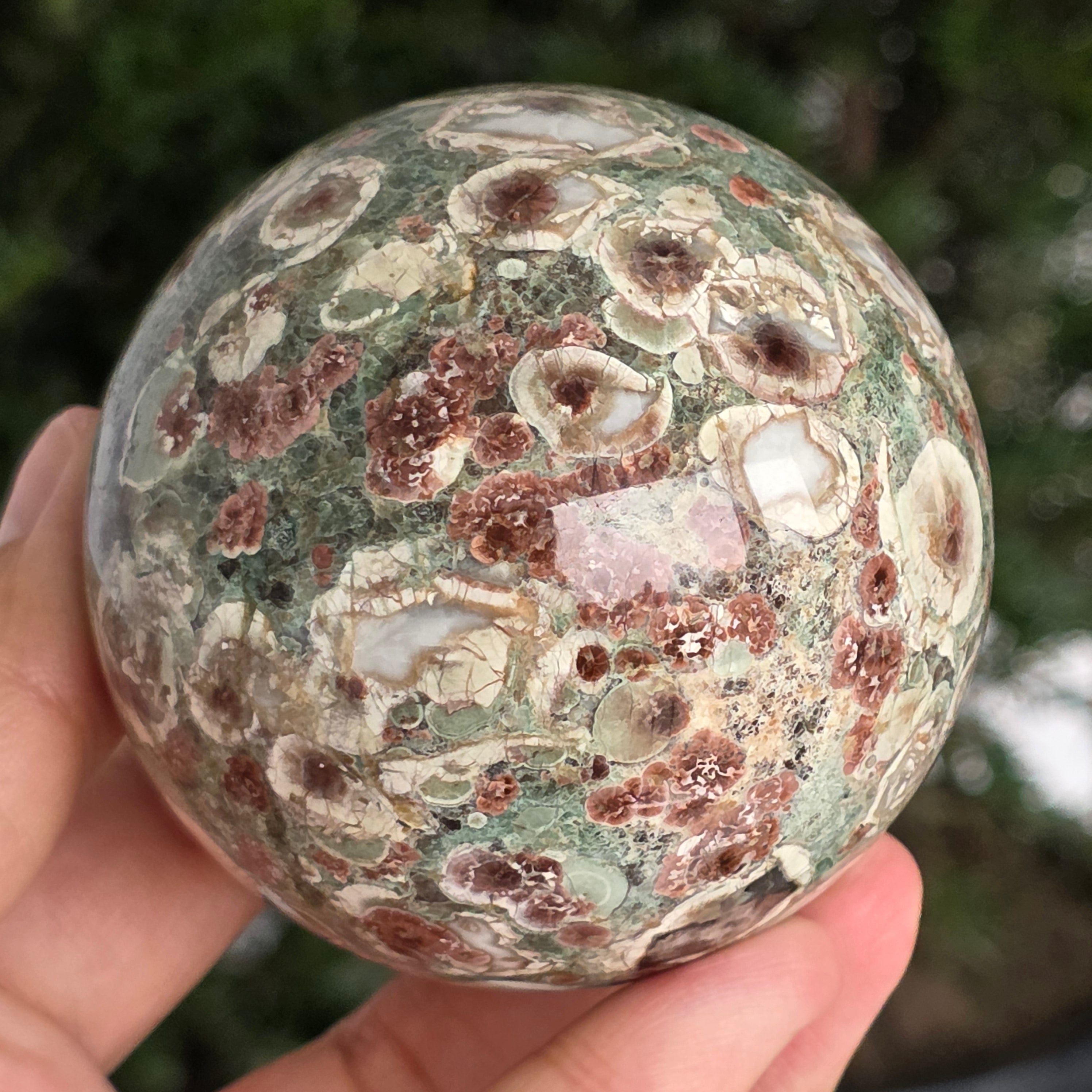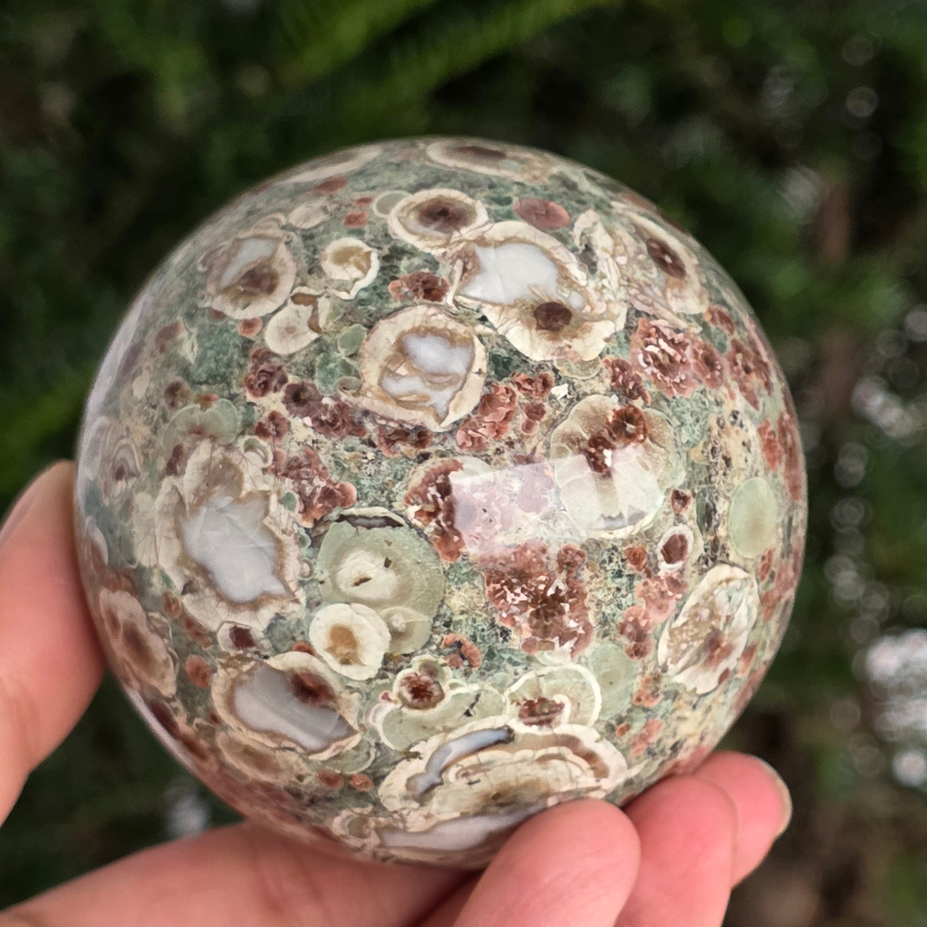 O sferă care poartă în ea urmele unei planete în formare. Texturile vii și culorile pământii ale riolitului natural – nuanțe de verde mușchi, bej, brun și gri vulcanic – se împletesc într-un dans hipnotic de forme și linii, ca o hartă minerală a lumii interioare.
