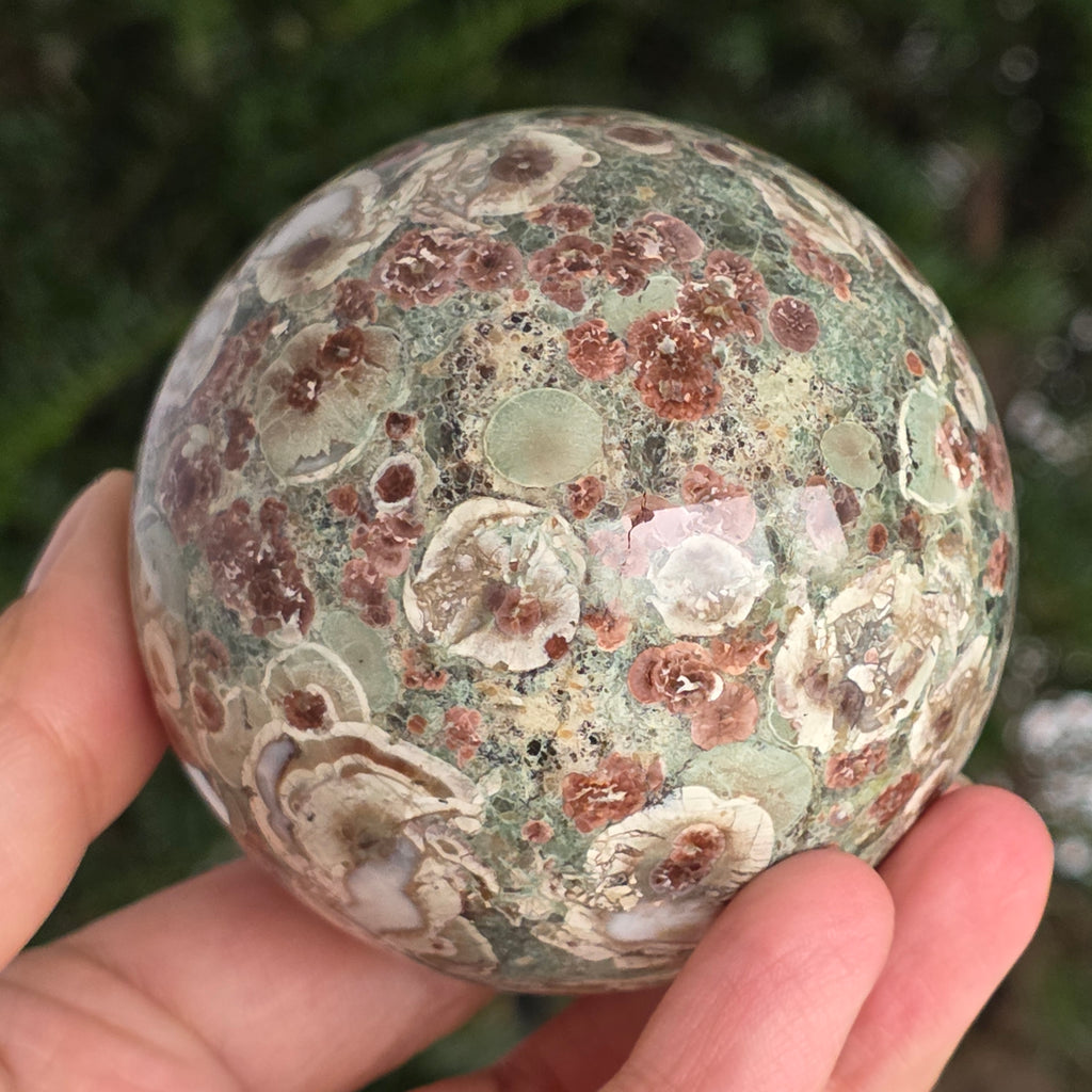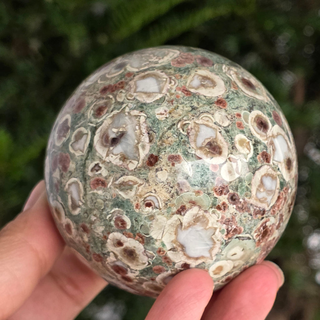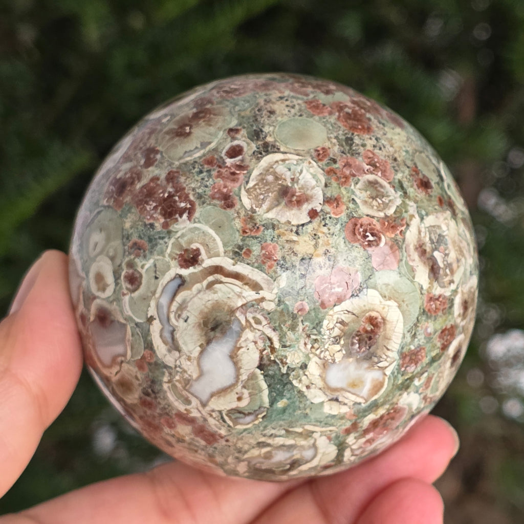O sferă care poartă în ea urmele unei planete în formare. Texturile vii și culorile pământii ale riolitului natural – nuanțe de verde mușchi, bej, brun și gri vulcanic – se împletesc într-un dans hipnotic de forme și linii, ca o hartă minerală a lumii interioare.