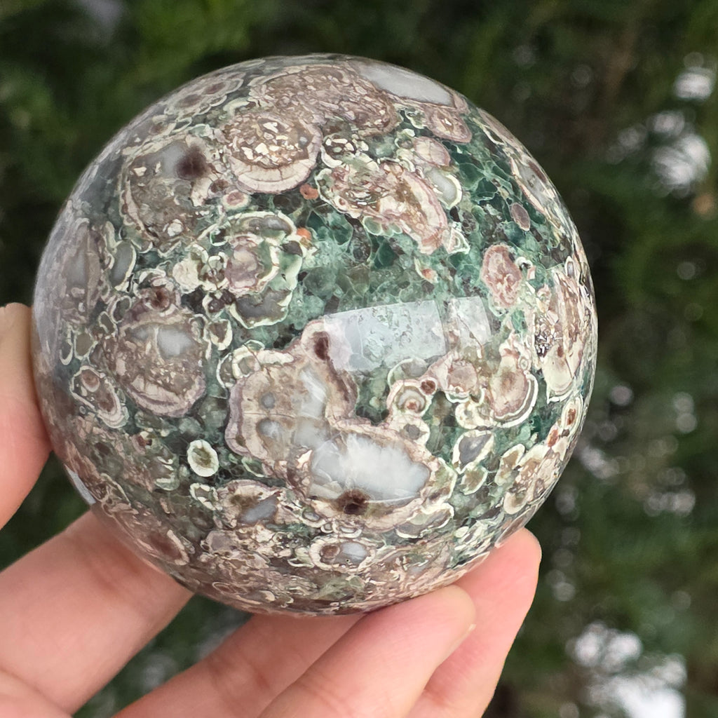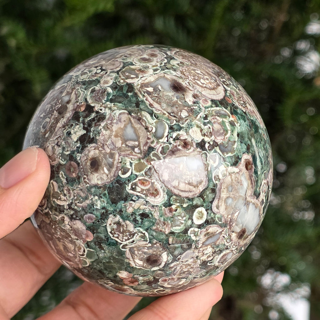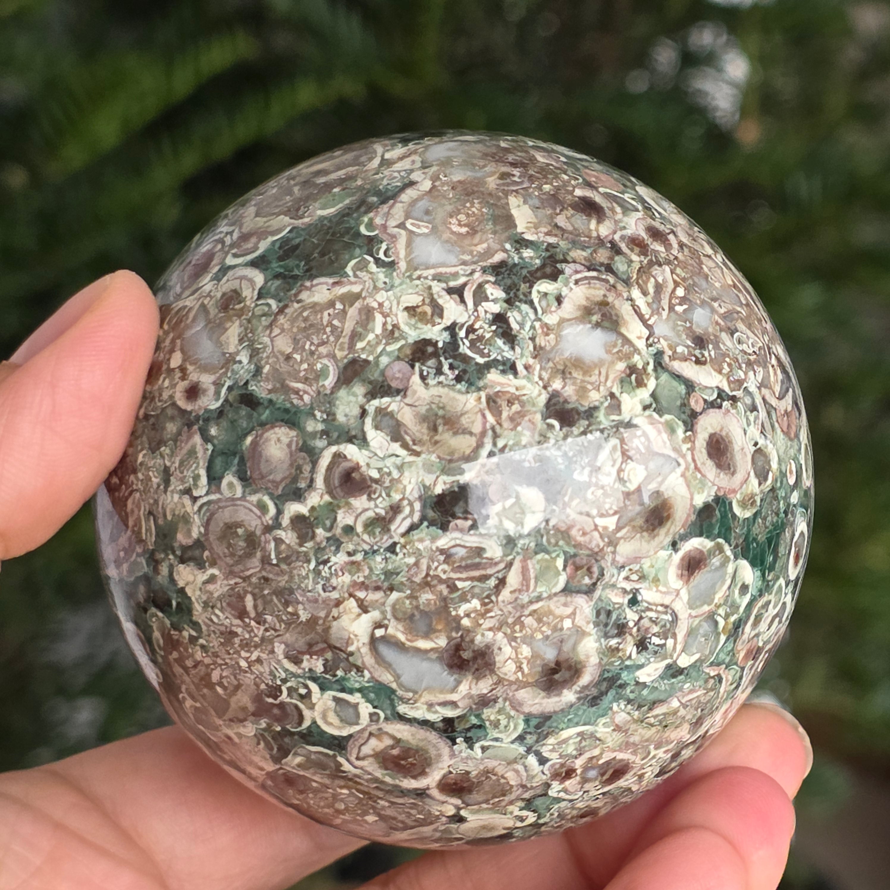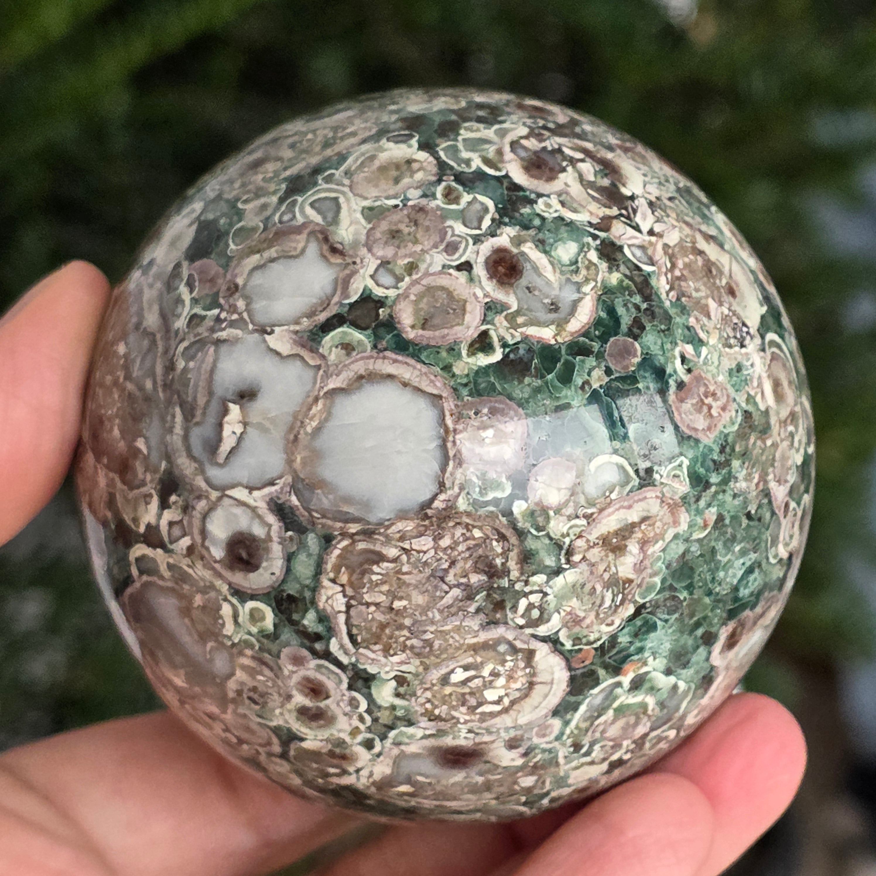 O sferă care poartă în ea urmele unei planete în formare. Texturile vii și culorile pământii ale riolitului natural – nuanțe de verde mușchi, bej, brun și gri vulcanic – se împletesc într-un dans hipnotic de forme și linii, ca o hartă minerală a lumii interioare.