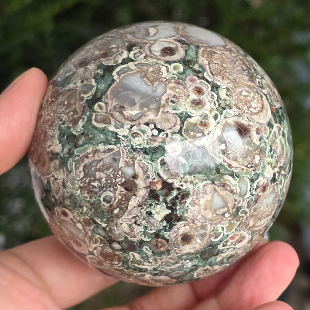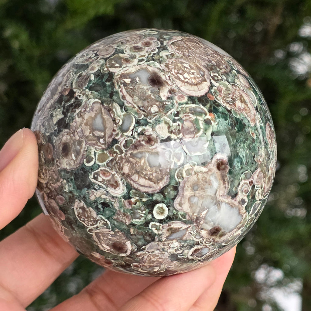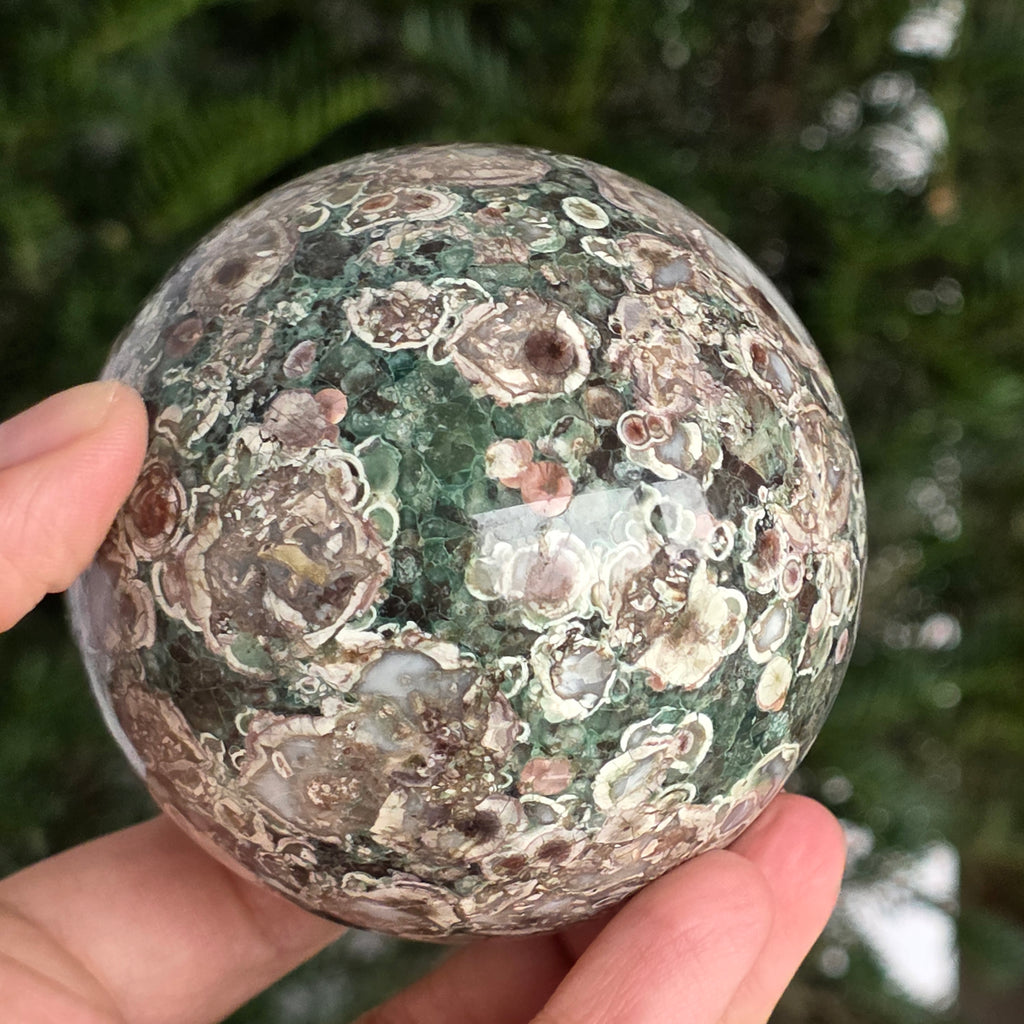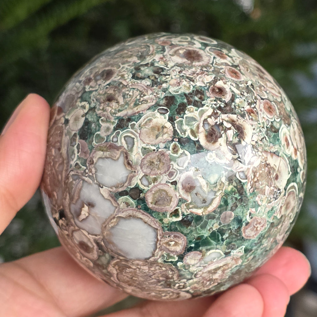 O sferă care poartă în ea urmele unei planete în formare. Texturile vii și culorile pământii ale riolitului natural – nuanțe de verde mușchi, bej, brun și gri vulcanic – se împletesc într-un dans hipnotic de forme și linii, ca o hartă minerală a lumii interioare.