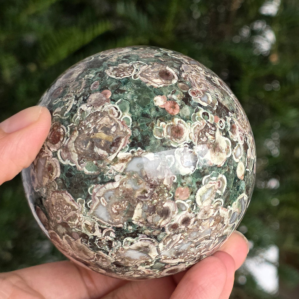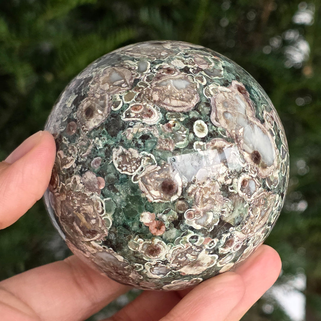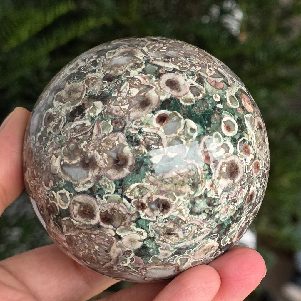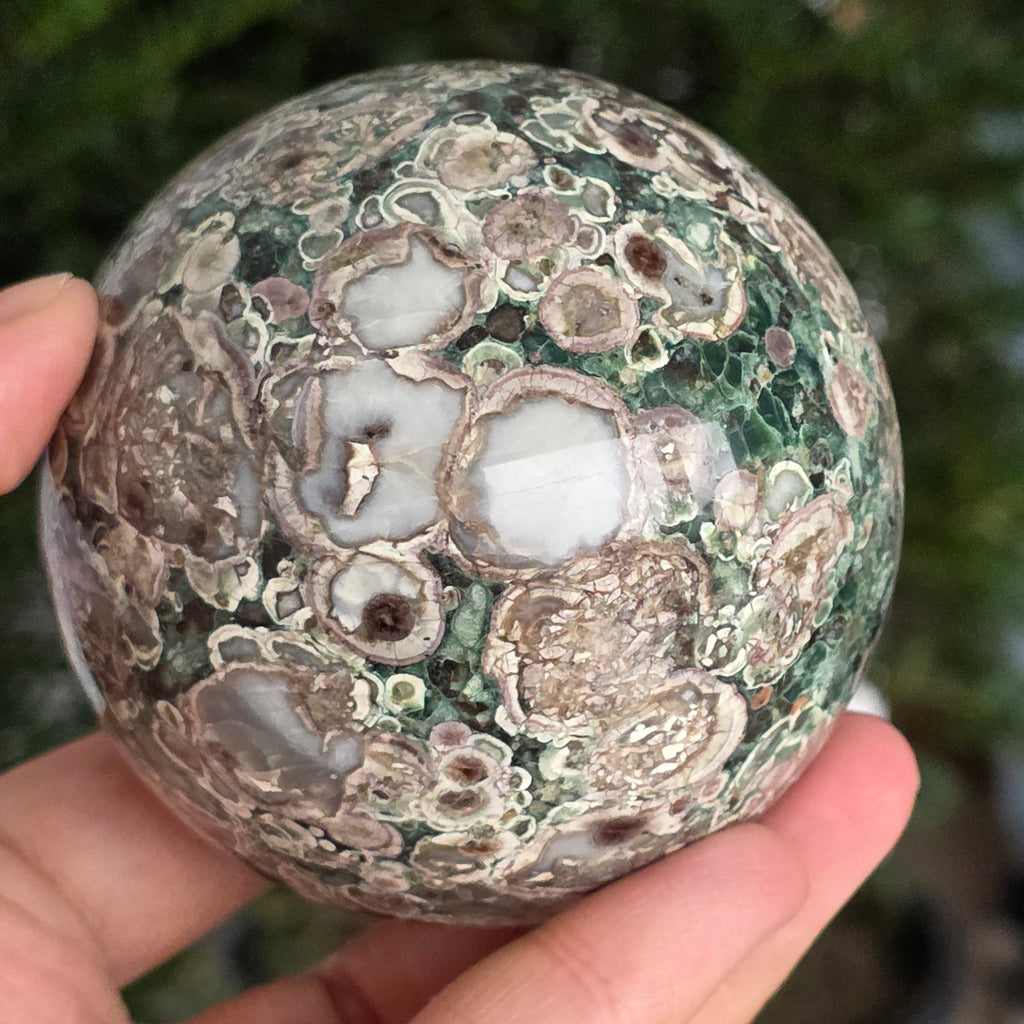 O sferă care poartă în ea urmele unei planete în formare. Texturile vii și culorile pământii ale riolitului natural – nuanțe de verde mușchi, bej, brun și gri vulcanic – se împletesc într-un dans hipnotic de forme și linii, ca o hartă minerală a lumii interioare.
