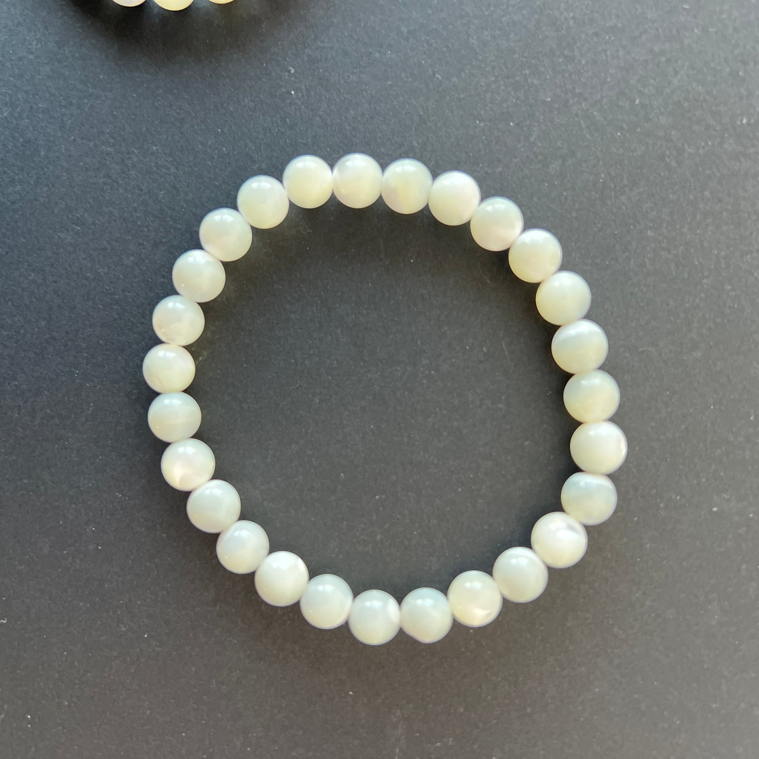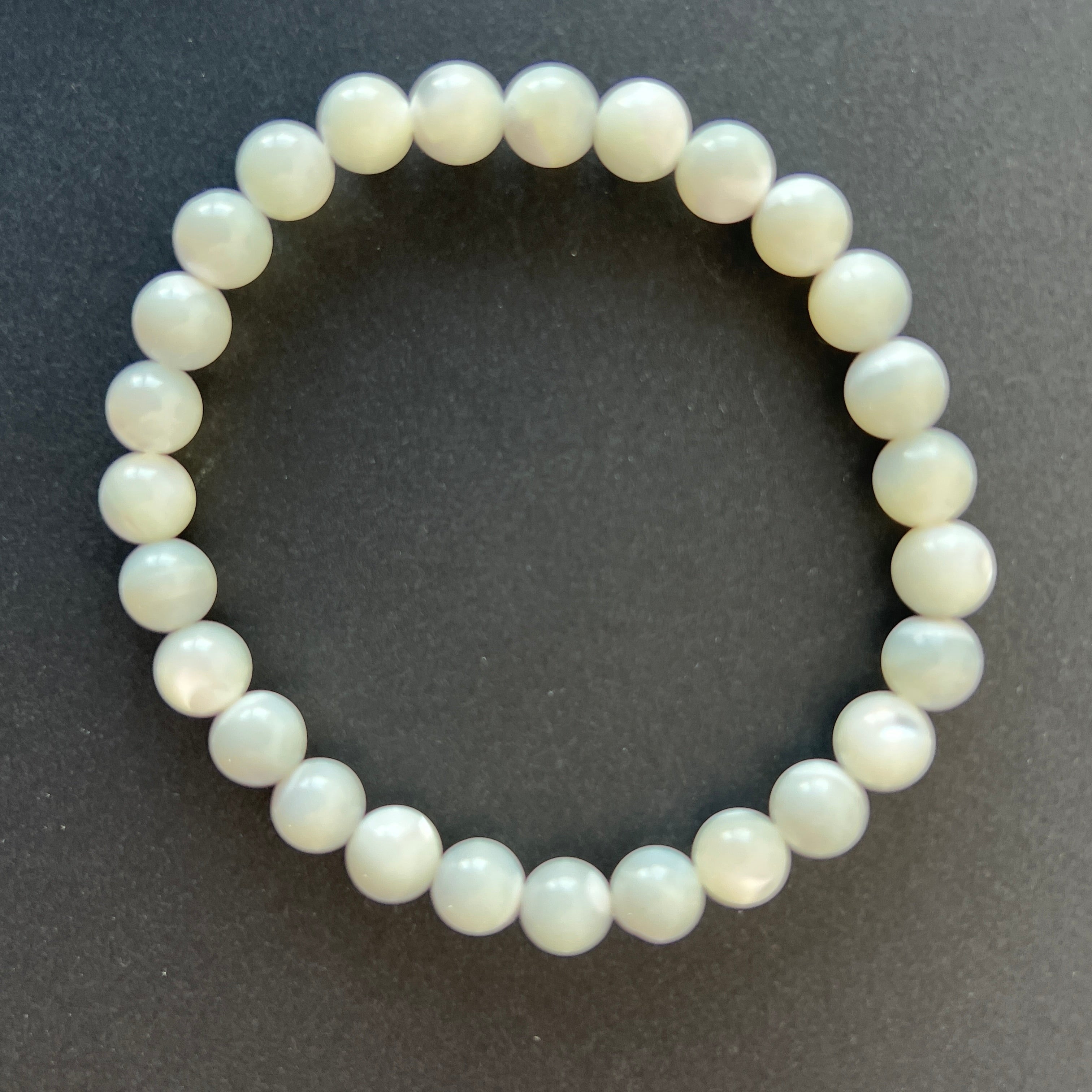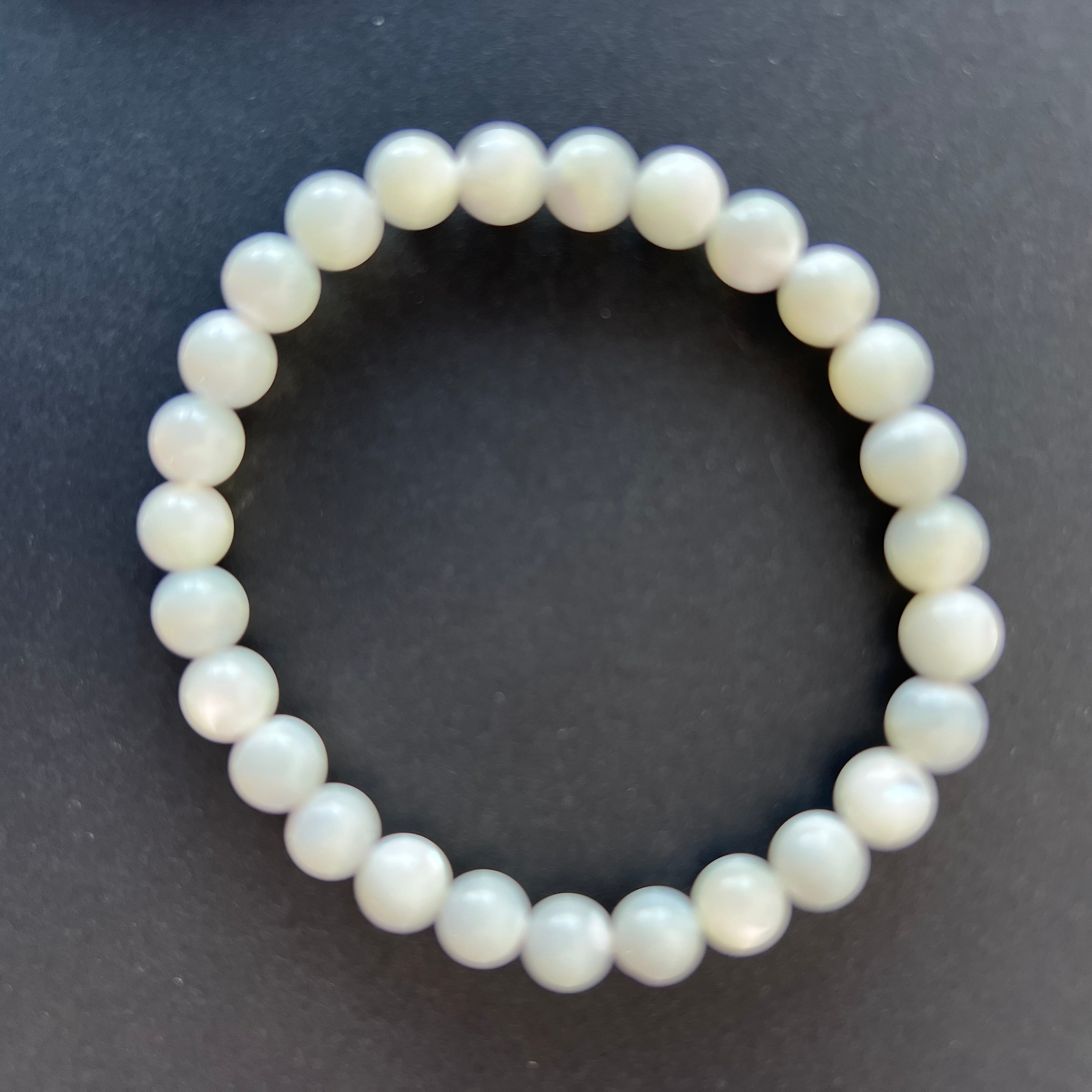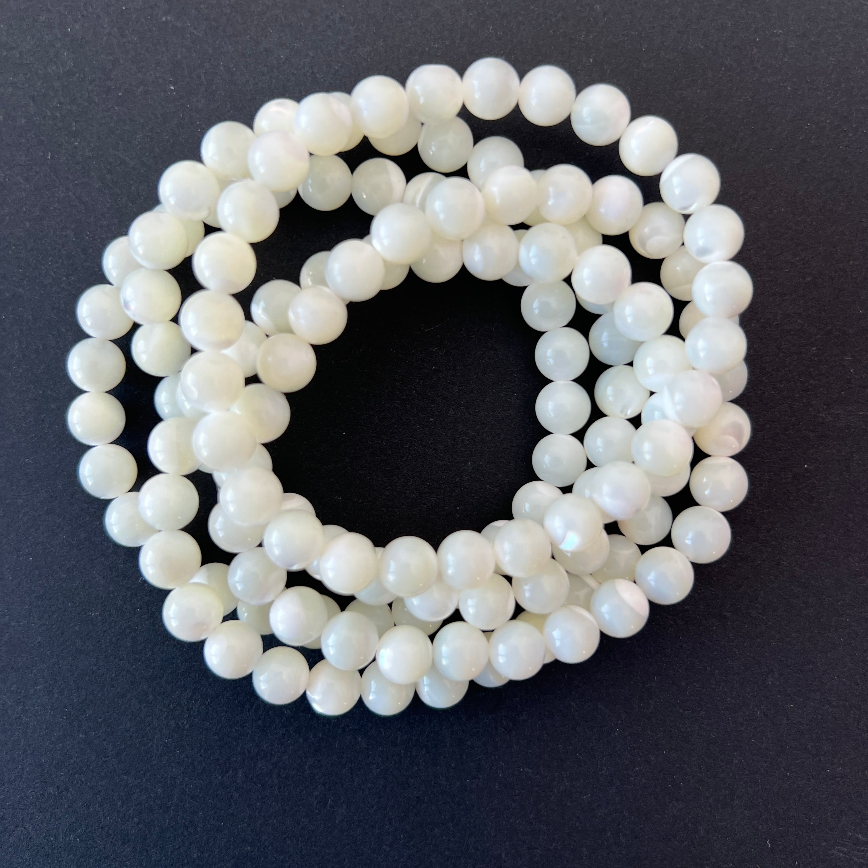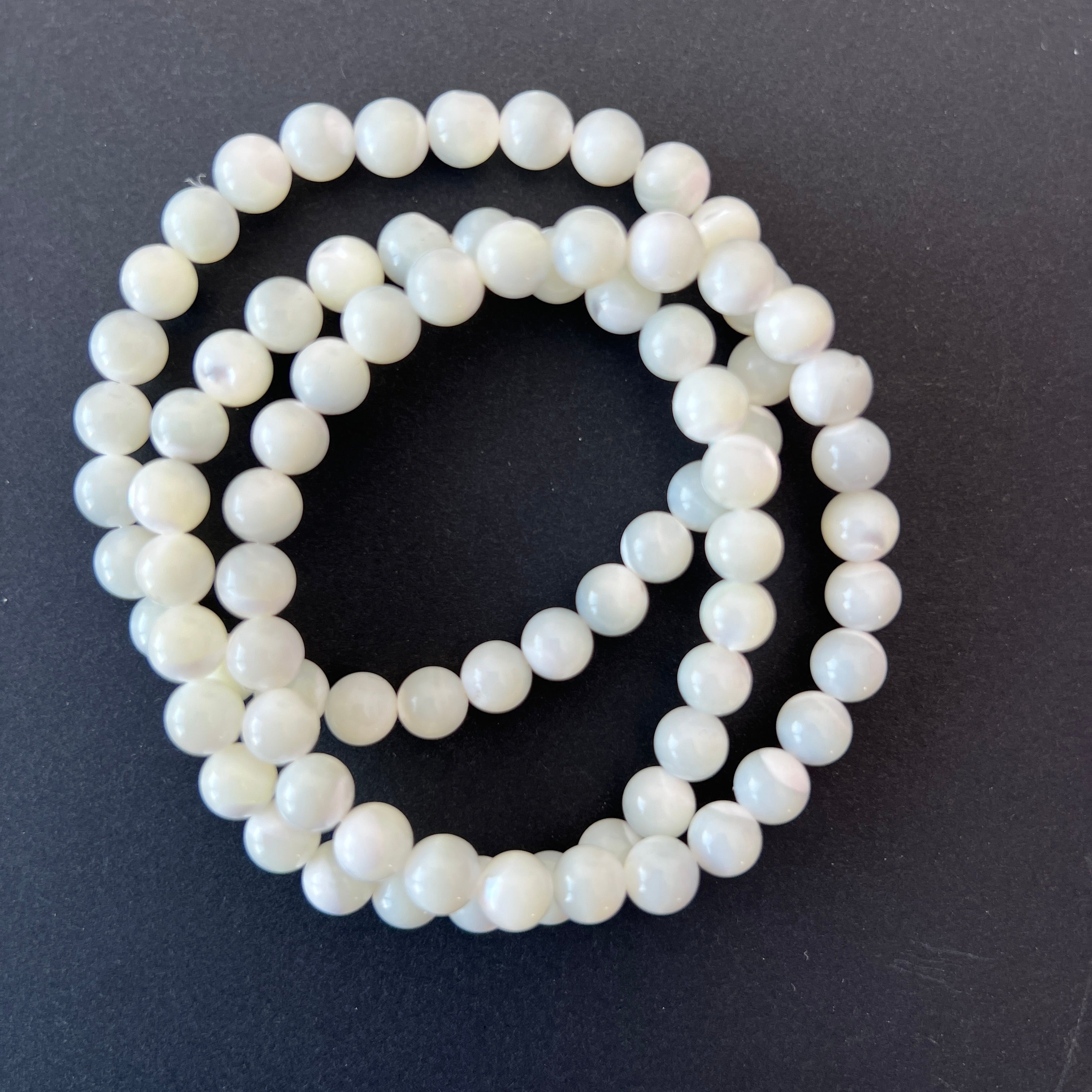 This mother-of-pearl bracelet, made of 6-7 mm spherical beads, captivates with its delicate shine and pearly reflections reminiscent of the sea's beauty. Each piece is unique, with subtle variations in shades and iridescence.