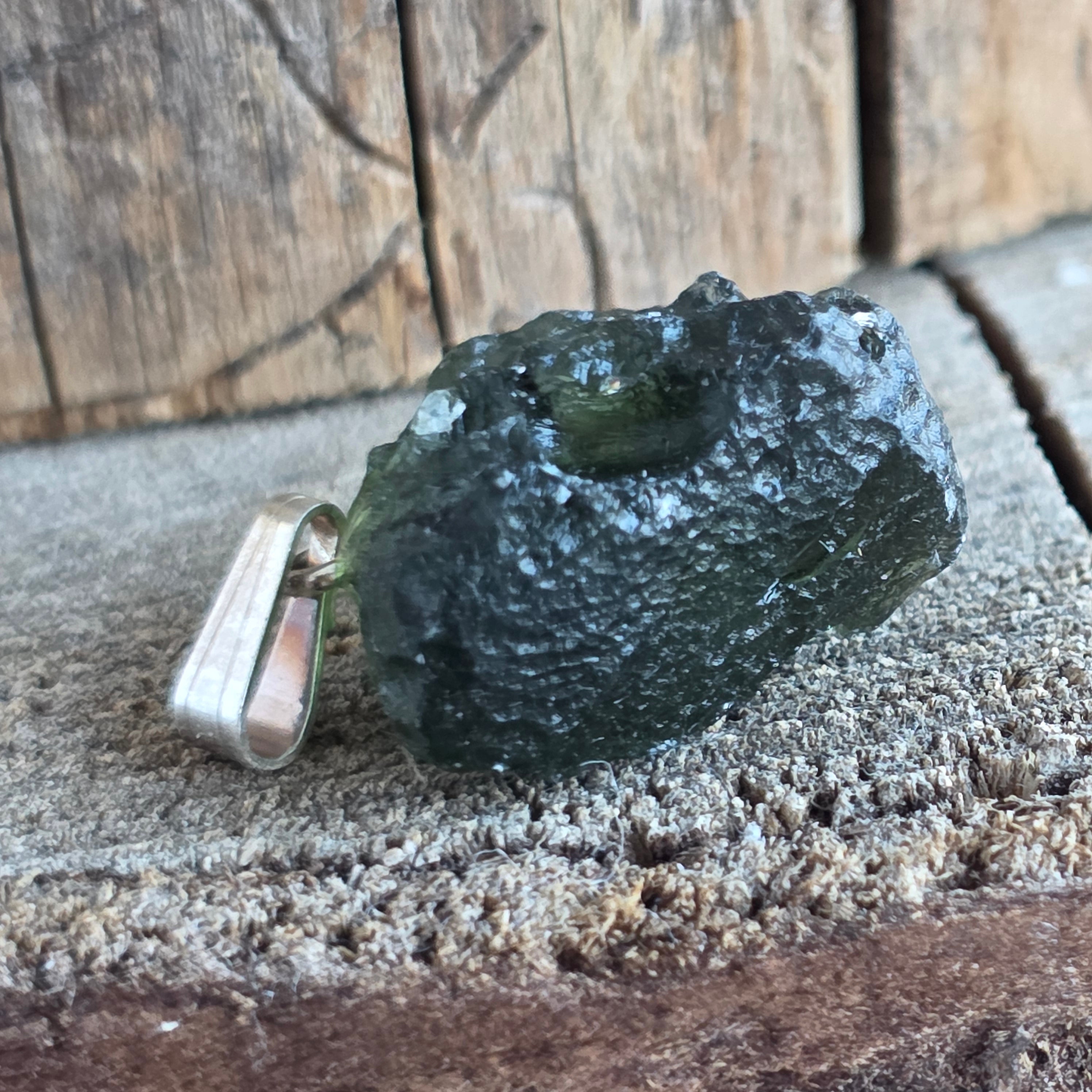 A rare and authentic pendant made with raw moldavite, elegantly mounted in 925 silver.