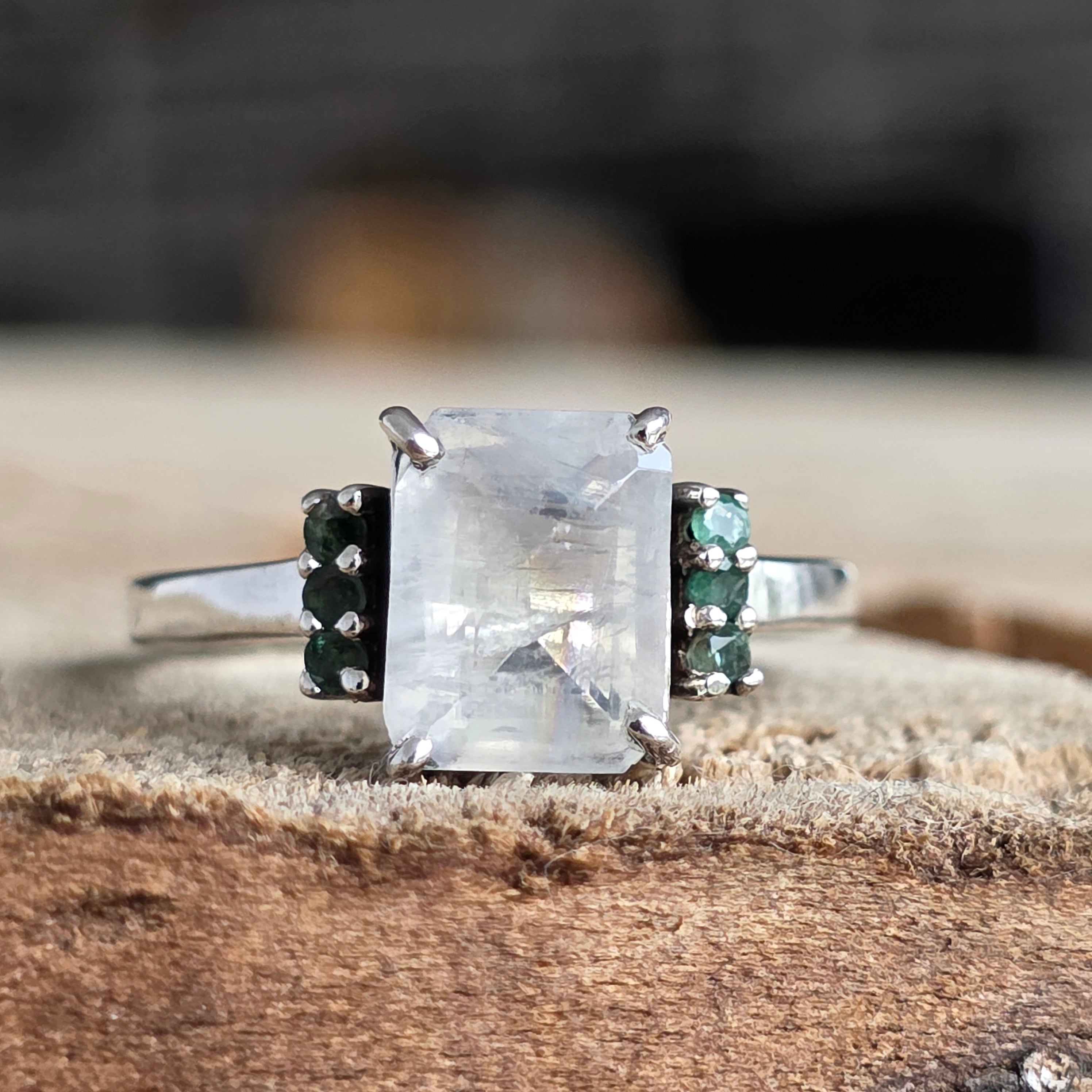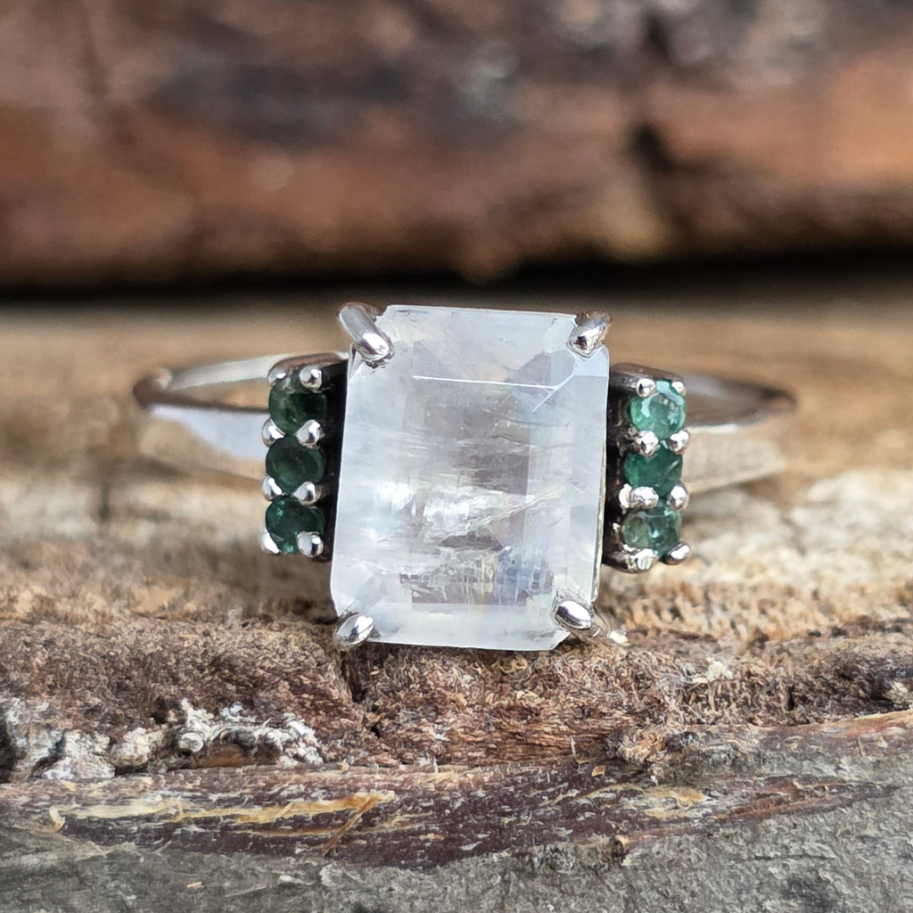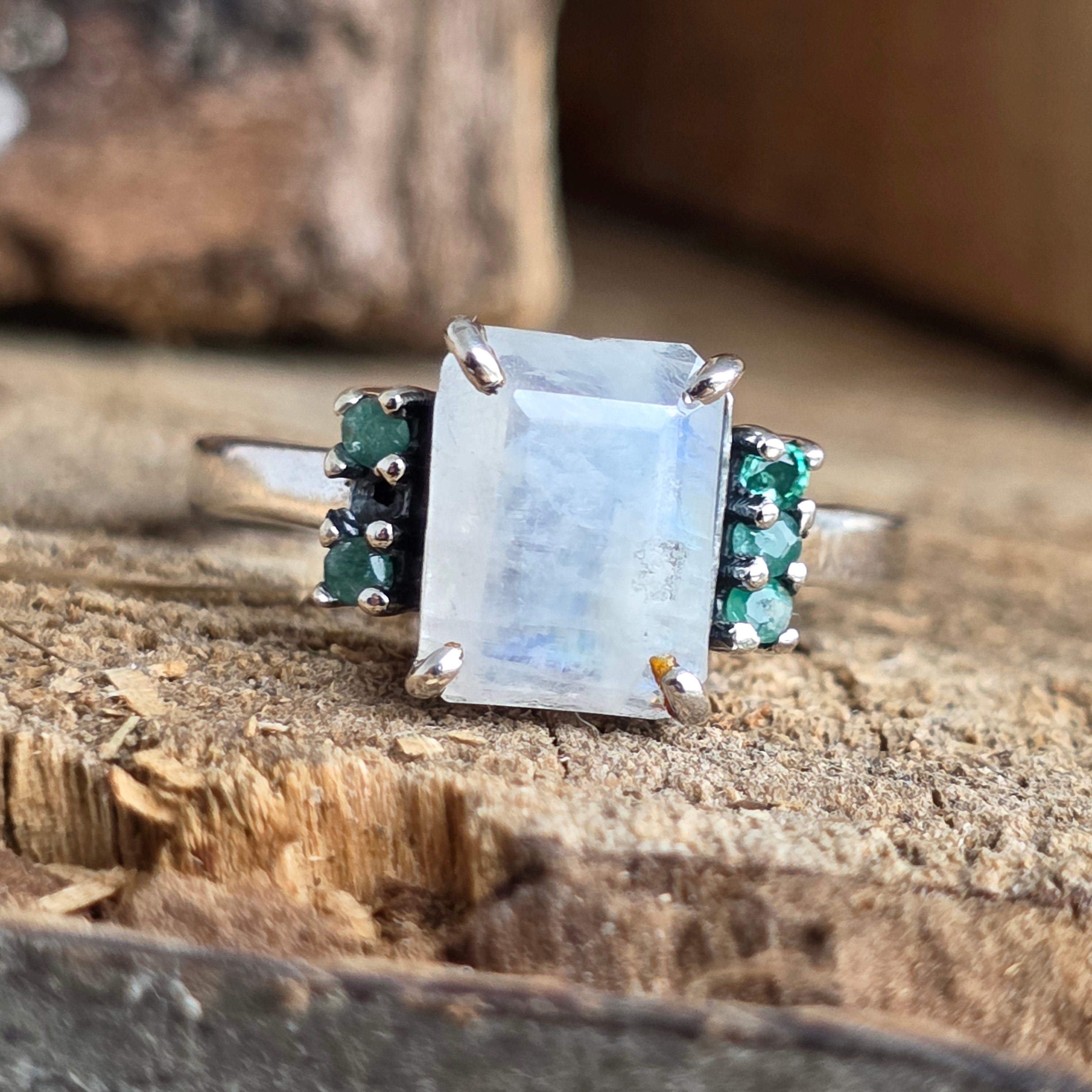 • Stones: Rainbow Moonstone – rectangular, faceted cut; natural emerald – round cut