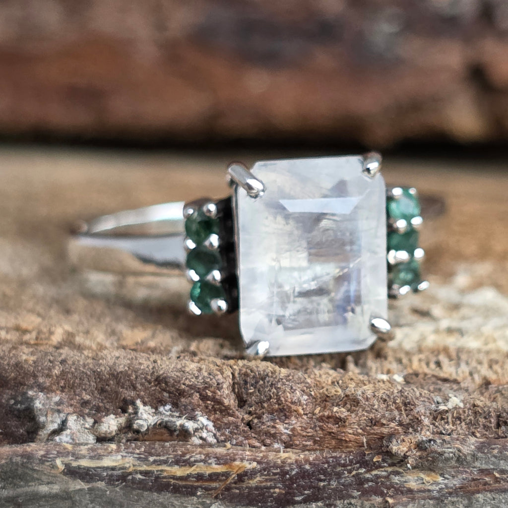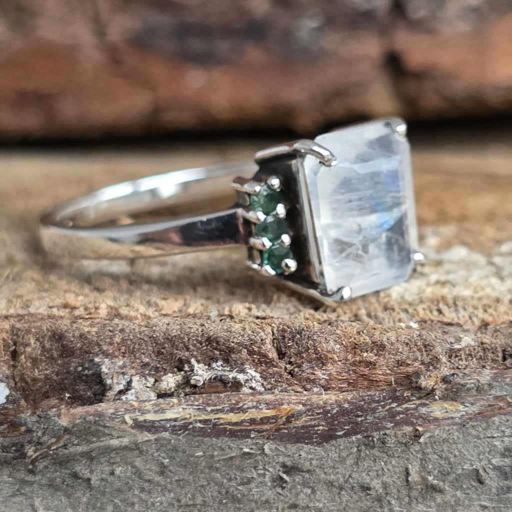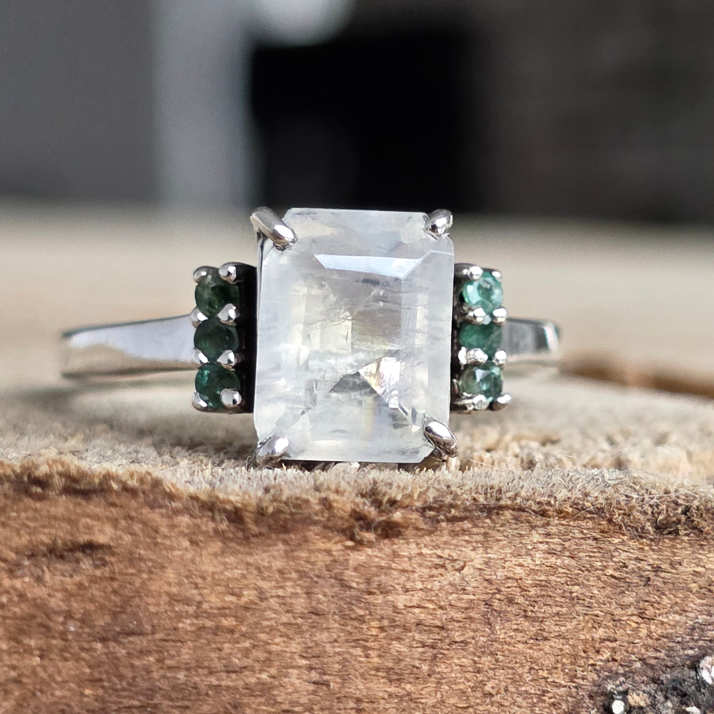 • Stones: Rainbow Moonstone – rectangular, faceted cut; natural emerald – round cut