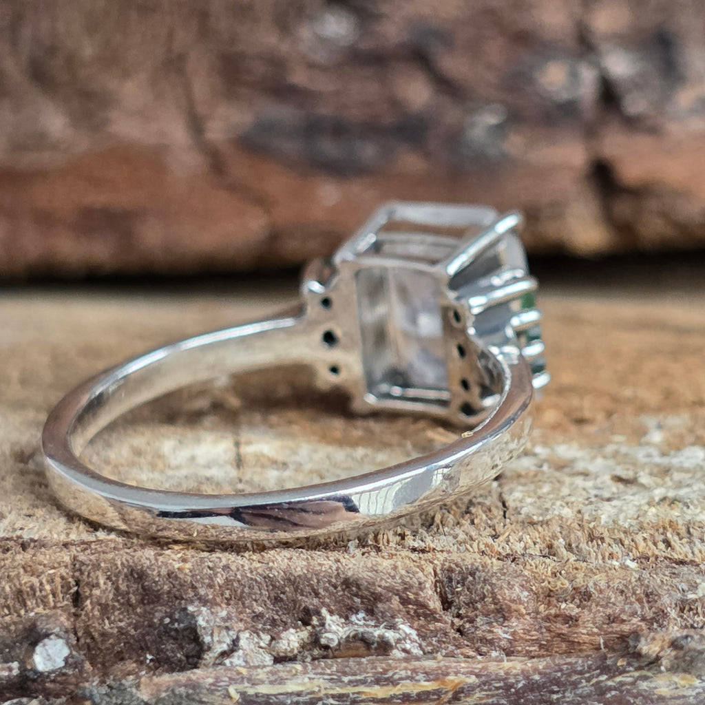 Delicate mount from 925 silver it highlights the contrast between the translucent brightness of the central stone and the vivid green of the side stones.