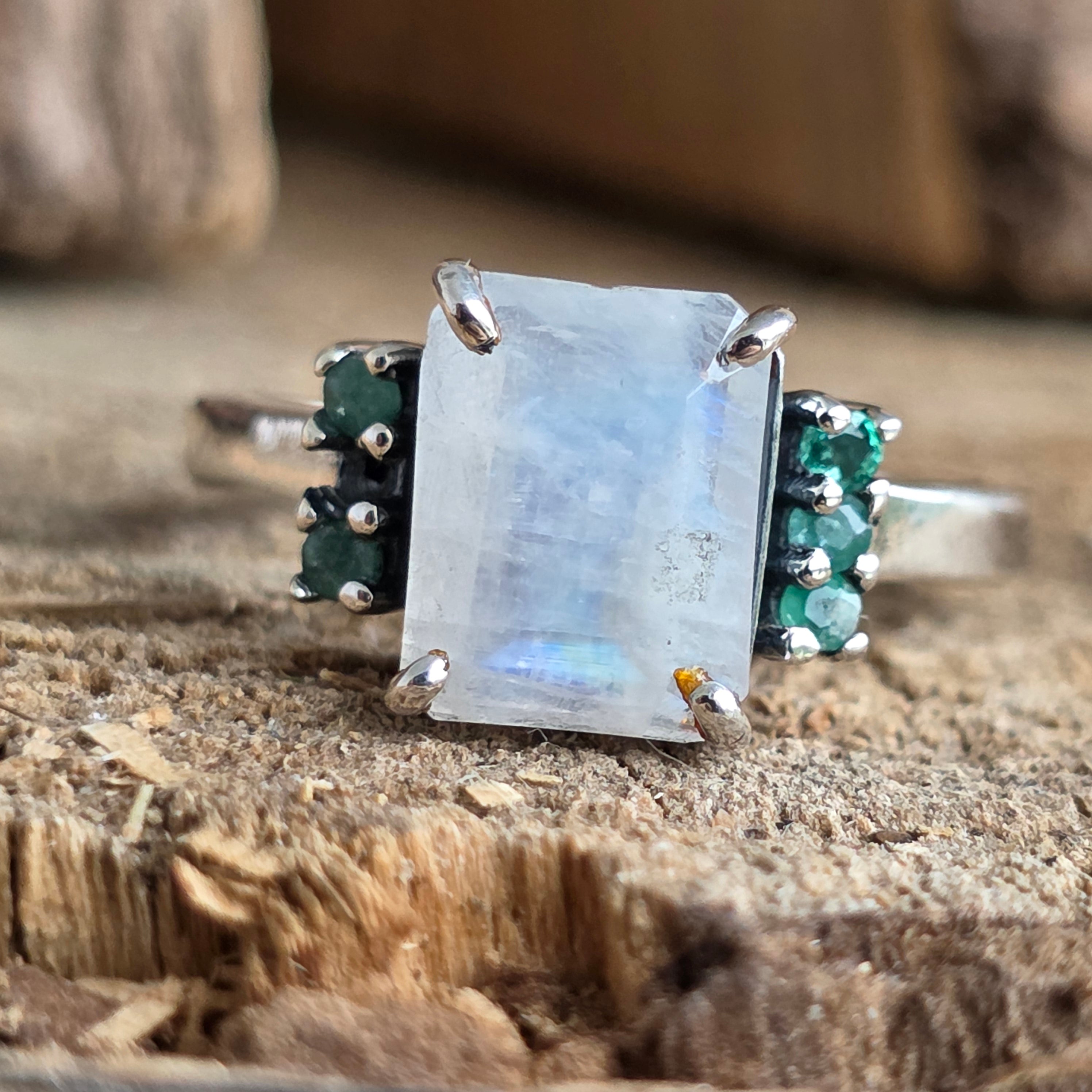 A ring that seems detached from the moonlight— Rainbow Moonstone, with its blue and silver reflections, is accentuated by the deep glow of natural emeralds, symbol of regeneration and balance.