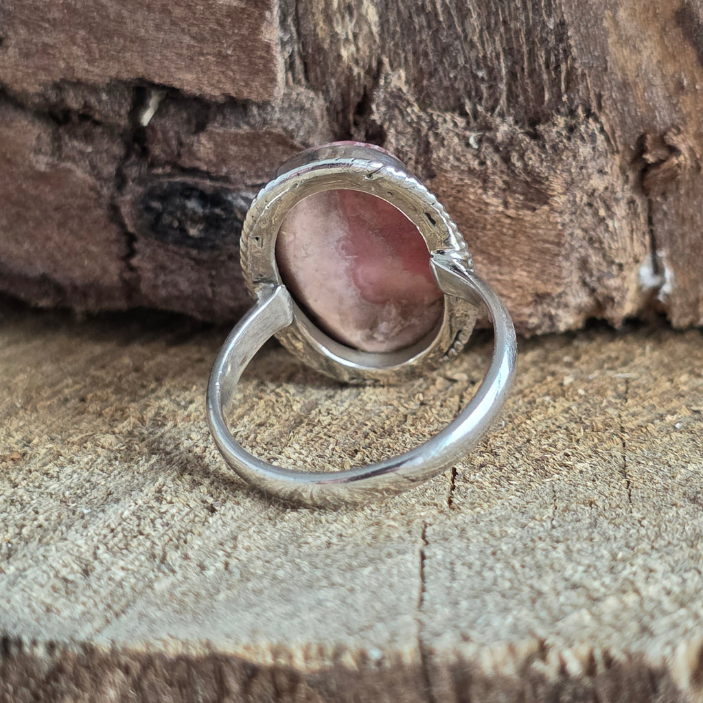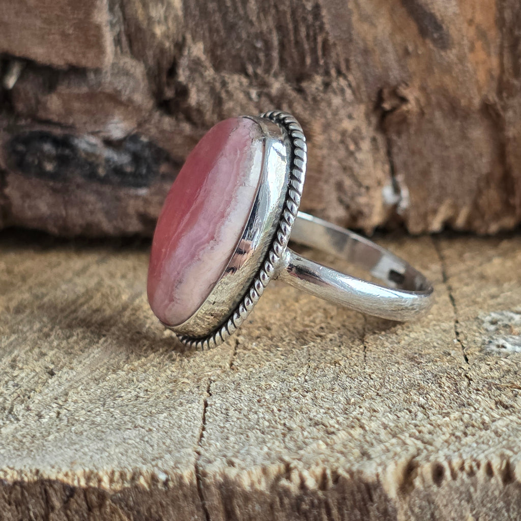 •An elegant and feminine ring in 925 silver with oval-cut natural rhodochrosite, revealing its fine layers of pink and white. The design twisted wire work, handmade, gives the jewel a vintage and refined air, suitable for lovers of genuine natural stones.