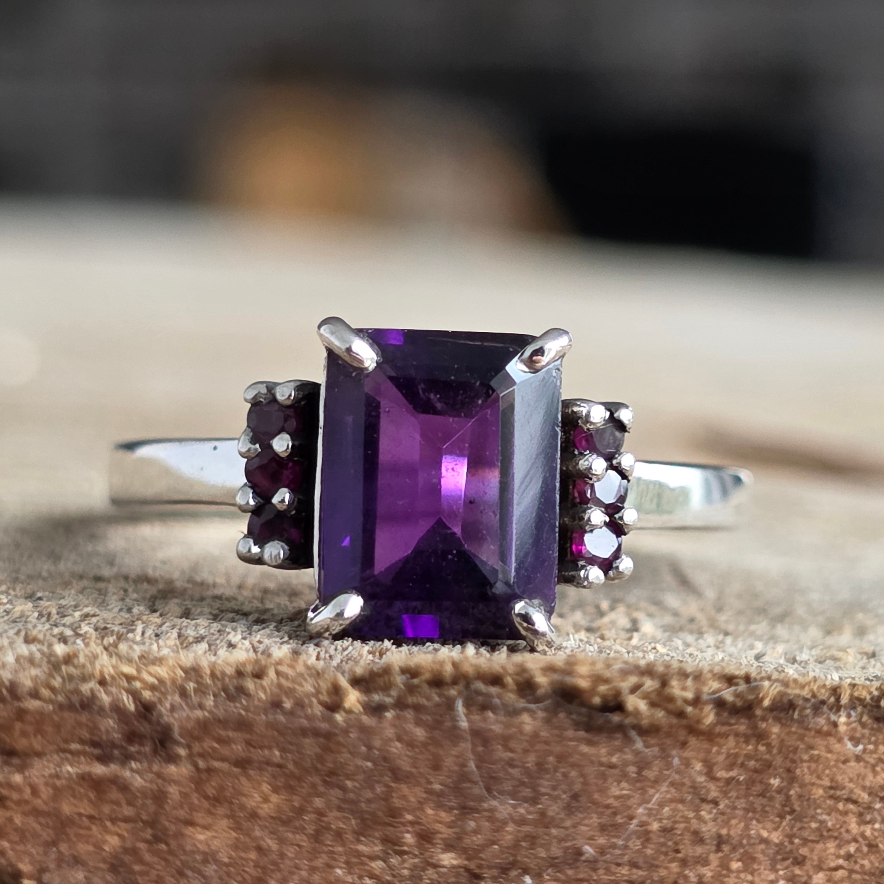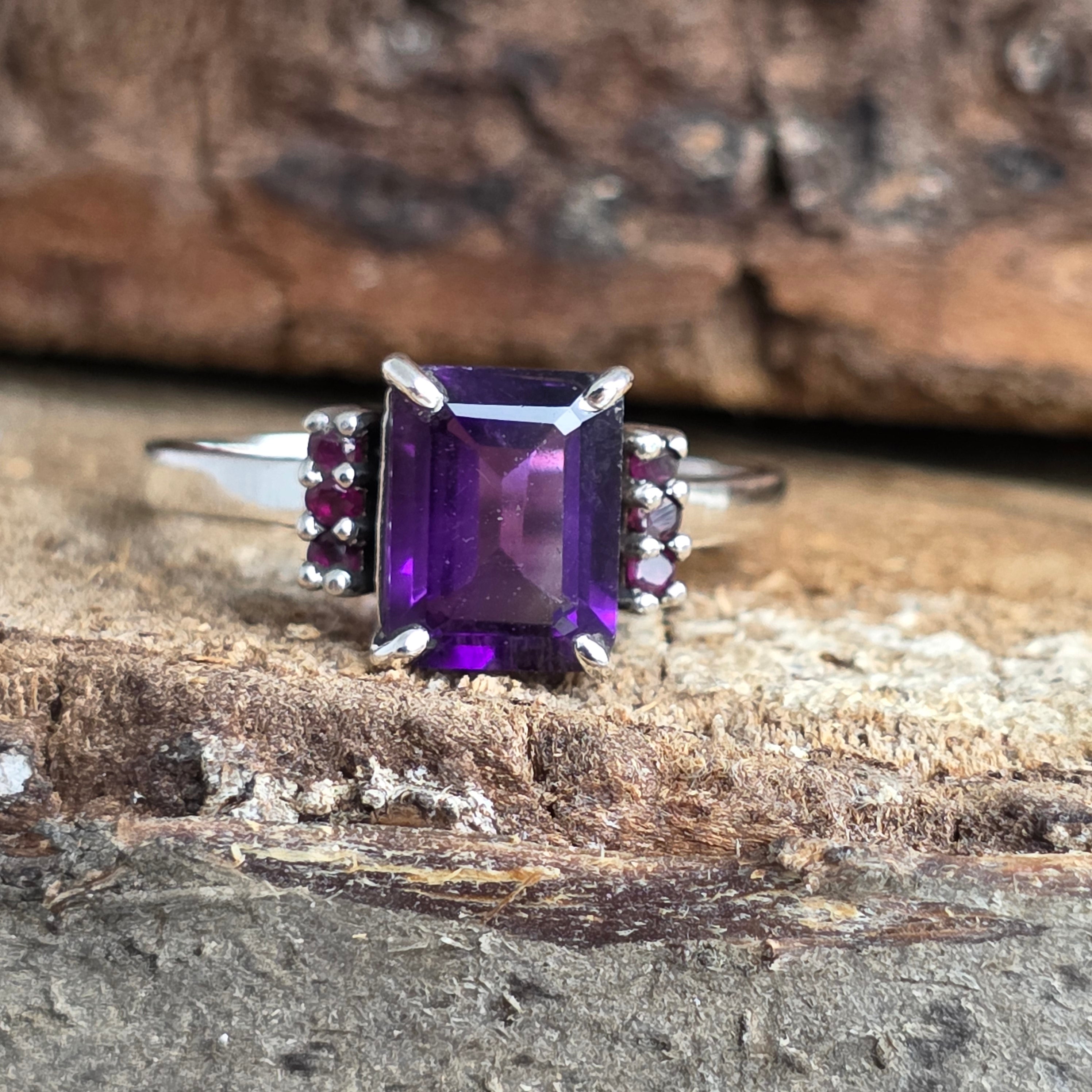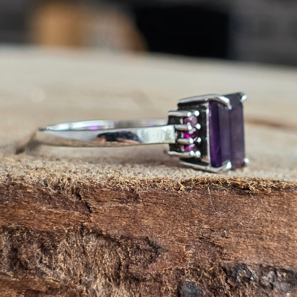 The rectangular cut of the amethyst reflects light with geometric precision, while the round rubies on the sides add a royal and profound touch.
