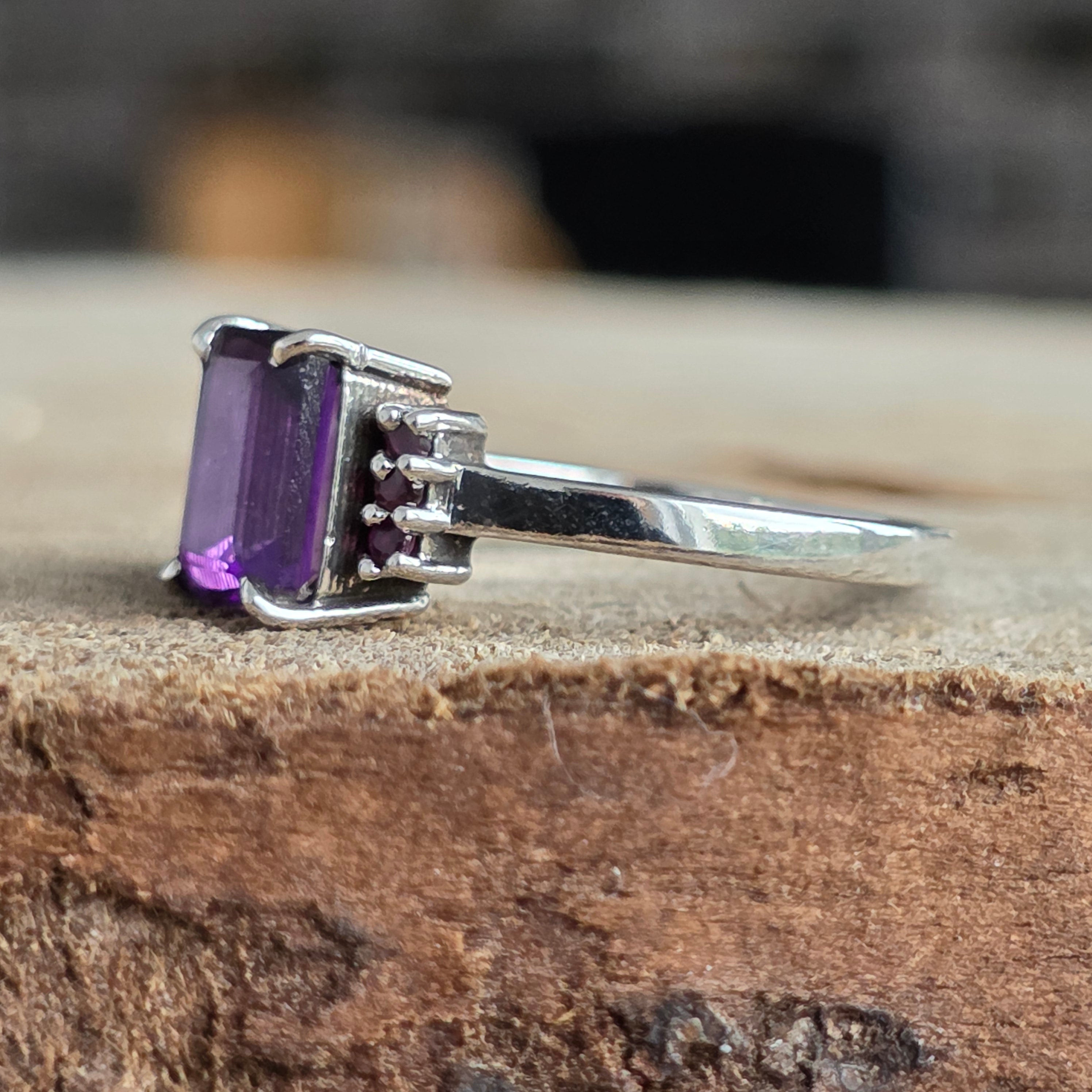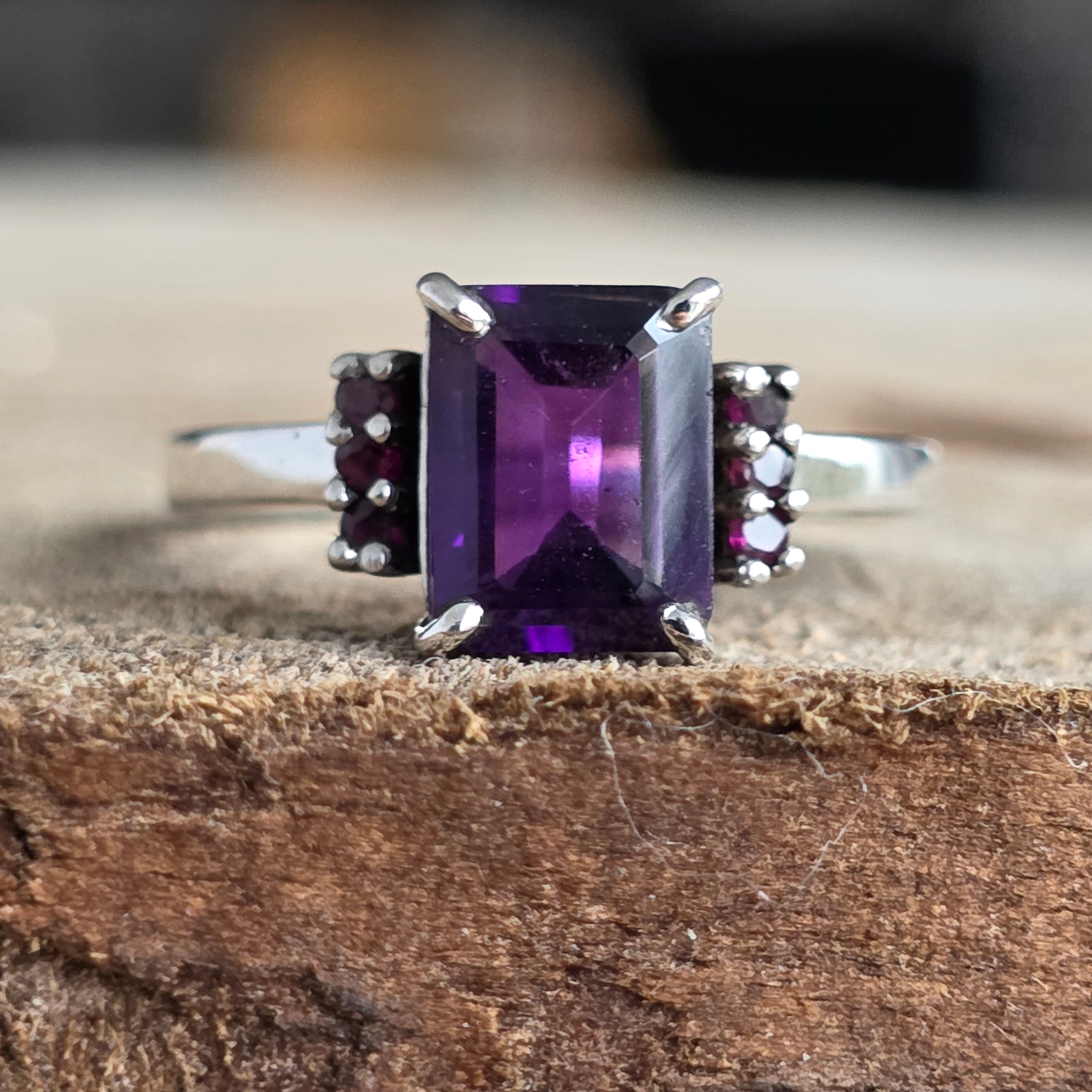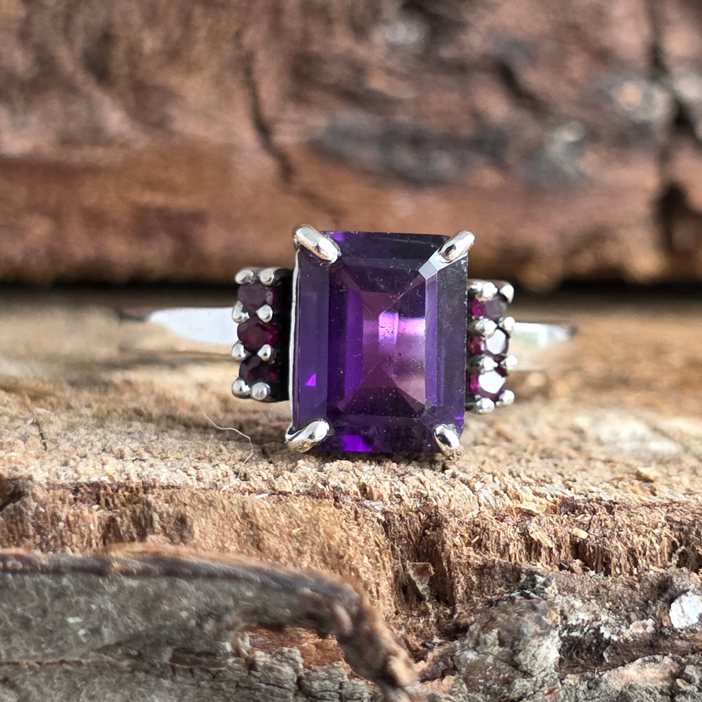 The rectangular cut of the amethyst reflects light with geometric precision, while the round rubies on the sides add a royal and profound touch.