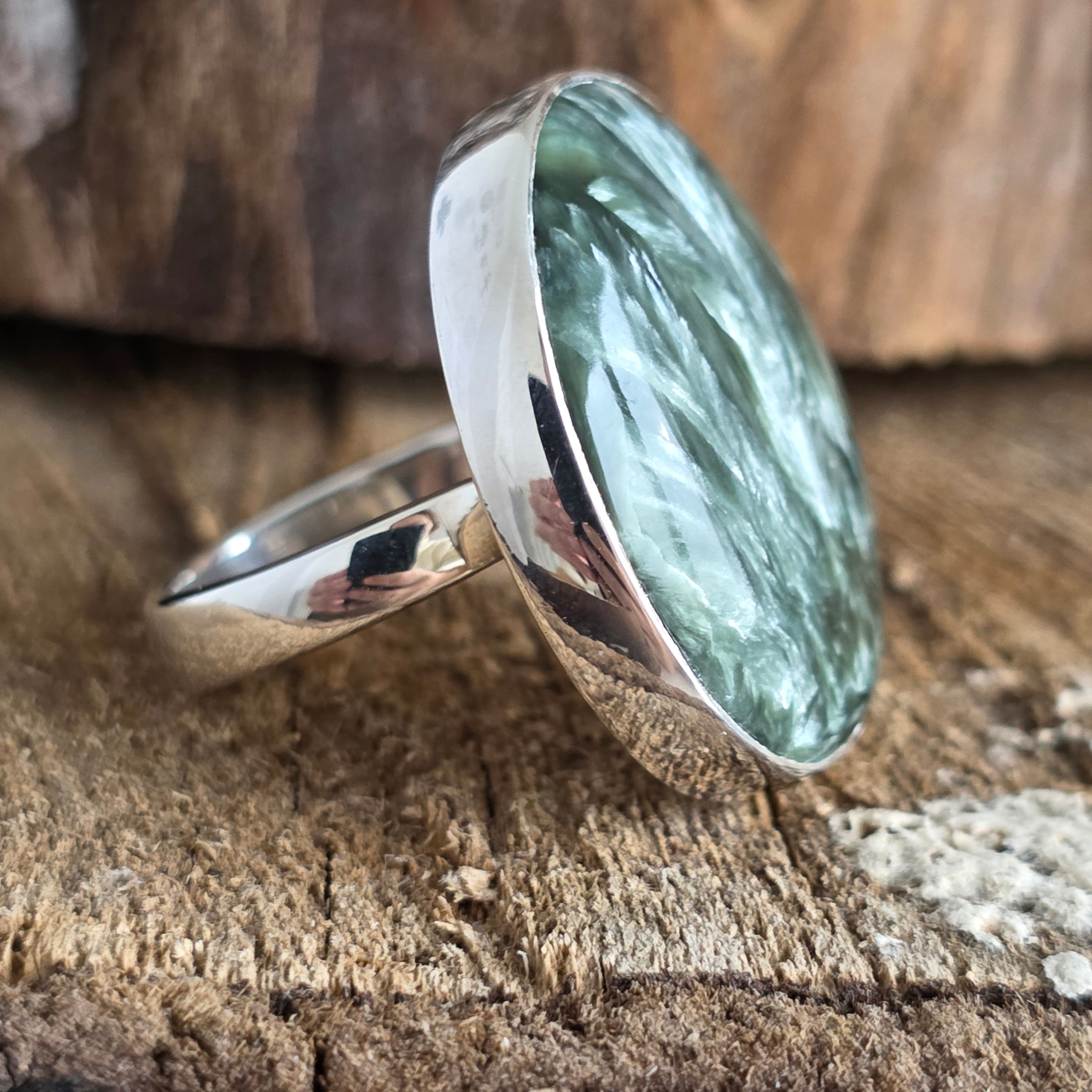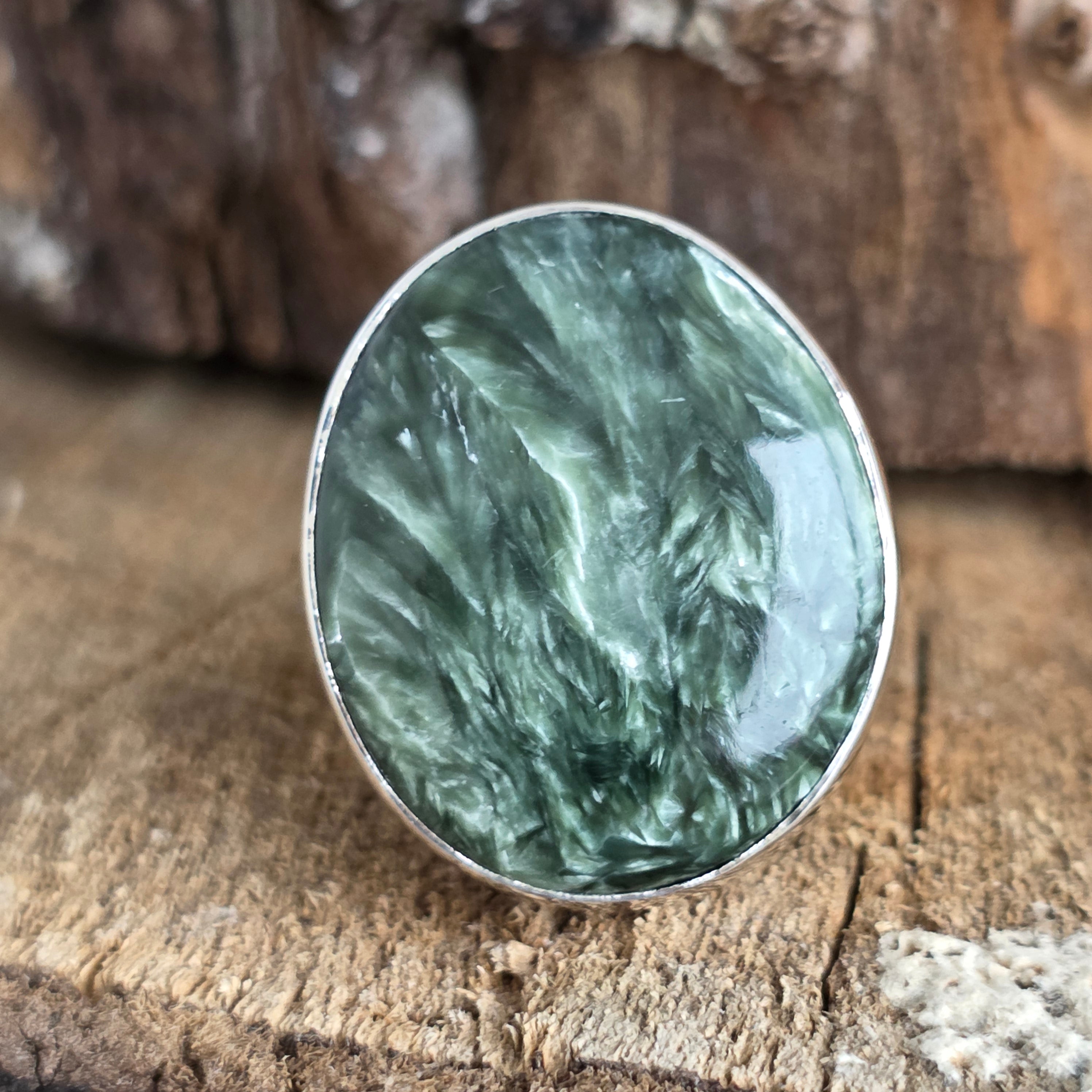 - A jewel that seems to have been touched by the wings of angels—this ring with natural seraphinite it emits a special light, with green-silver reflections reminiscent of the feathers of the seraphim, the pure spirits of light.