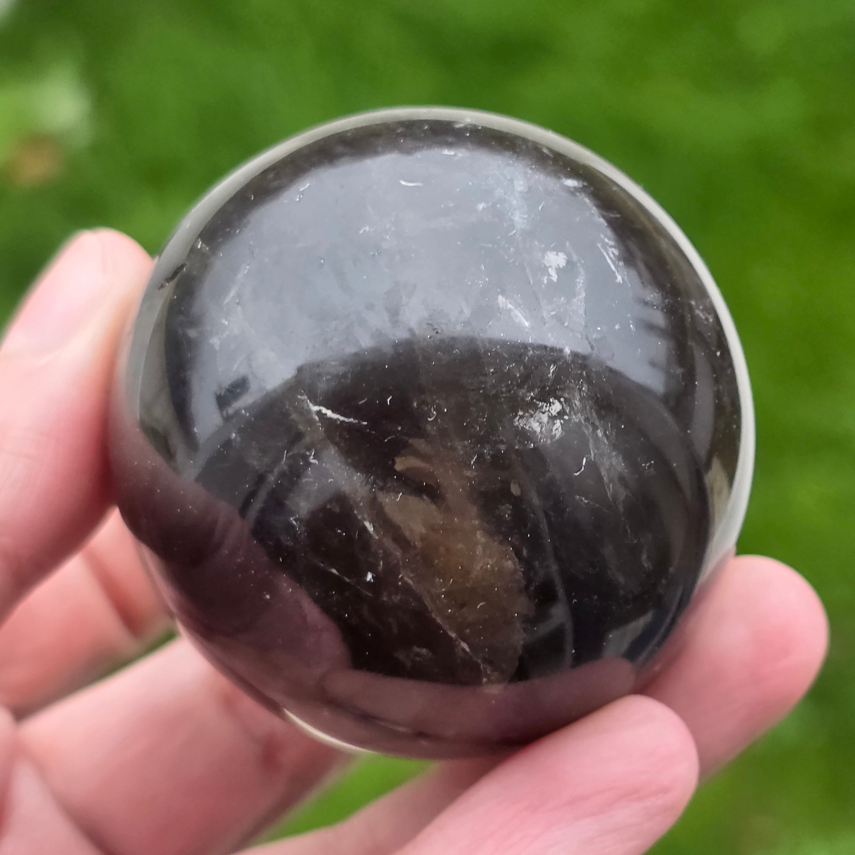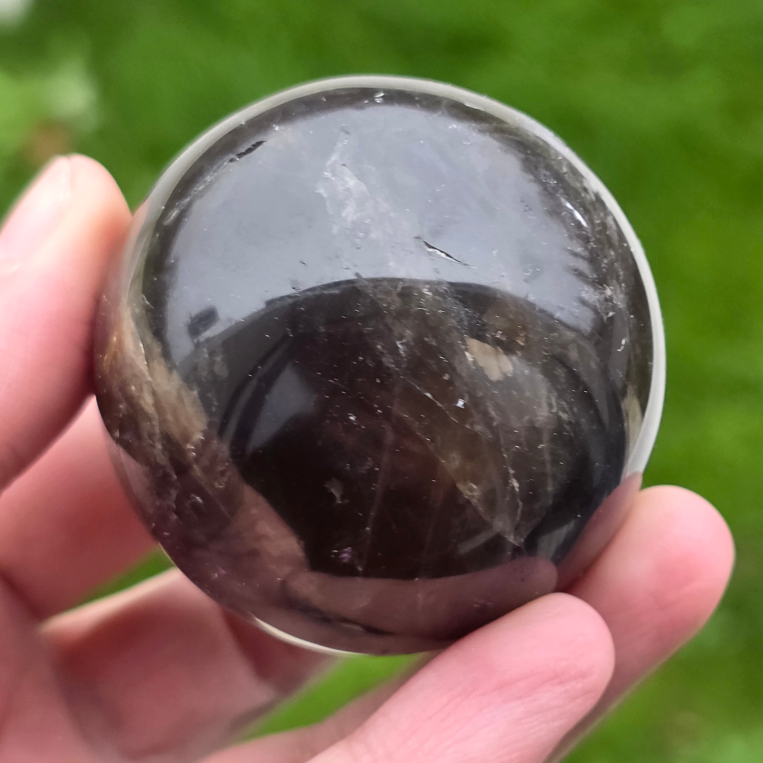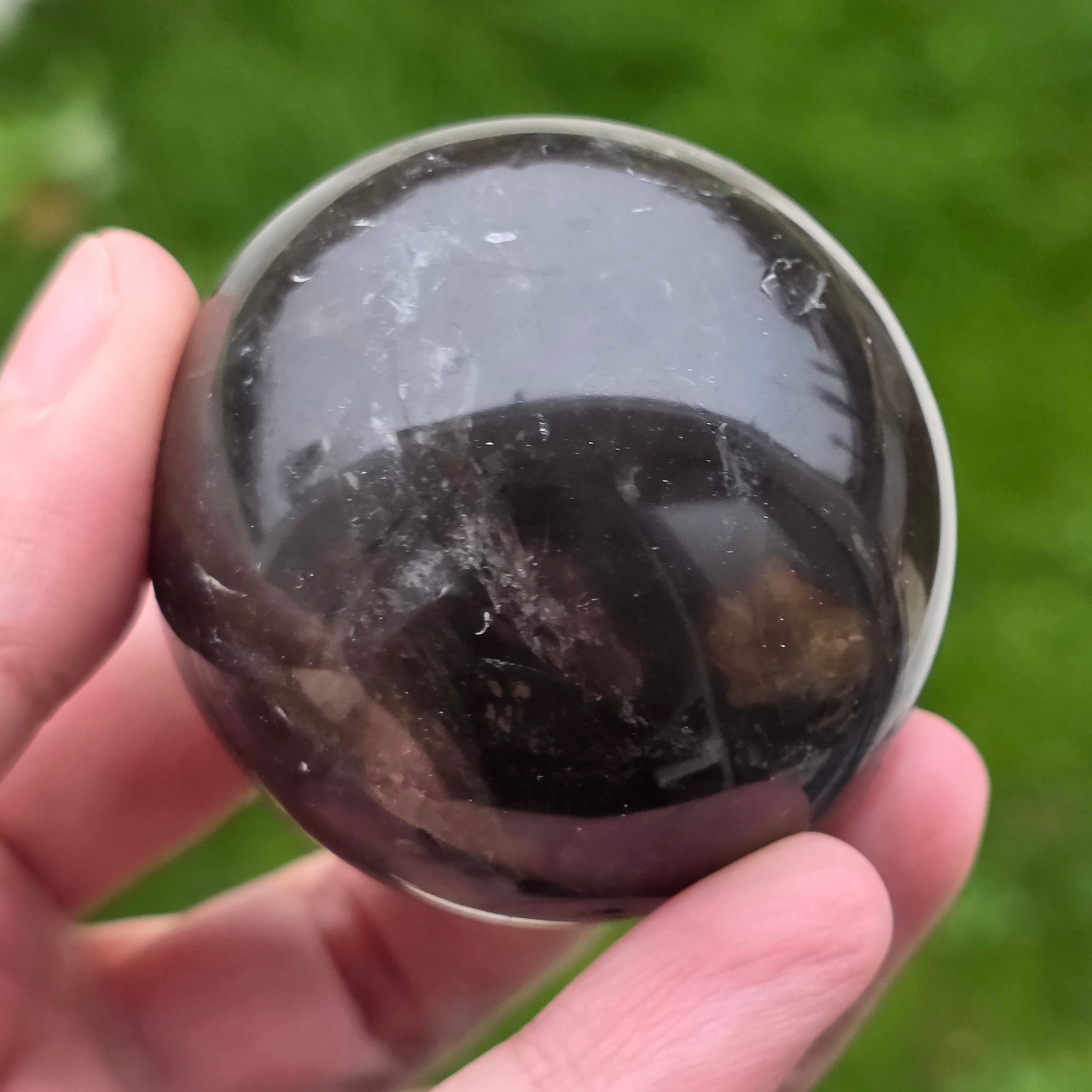 The morion quartz sphere is a powerful and elegant piece, known for its deep shade, resembling dense smoke or transparent obsidian. Morion is the darkest variety of smoky quartz, and in this perfectly round form, it reveals subtle reflections, fine internal details, and a truly sophisticated visual presence.