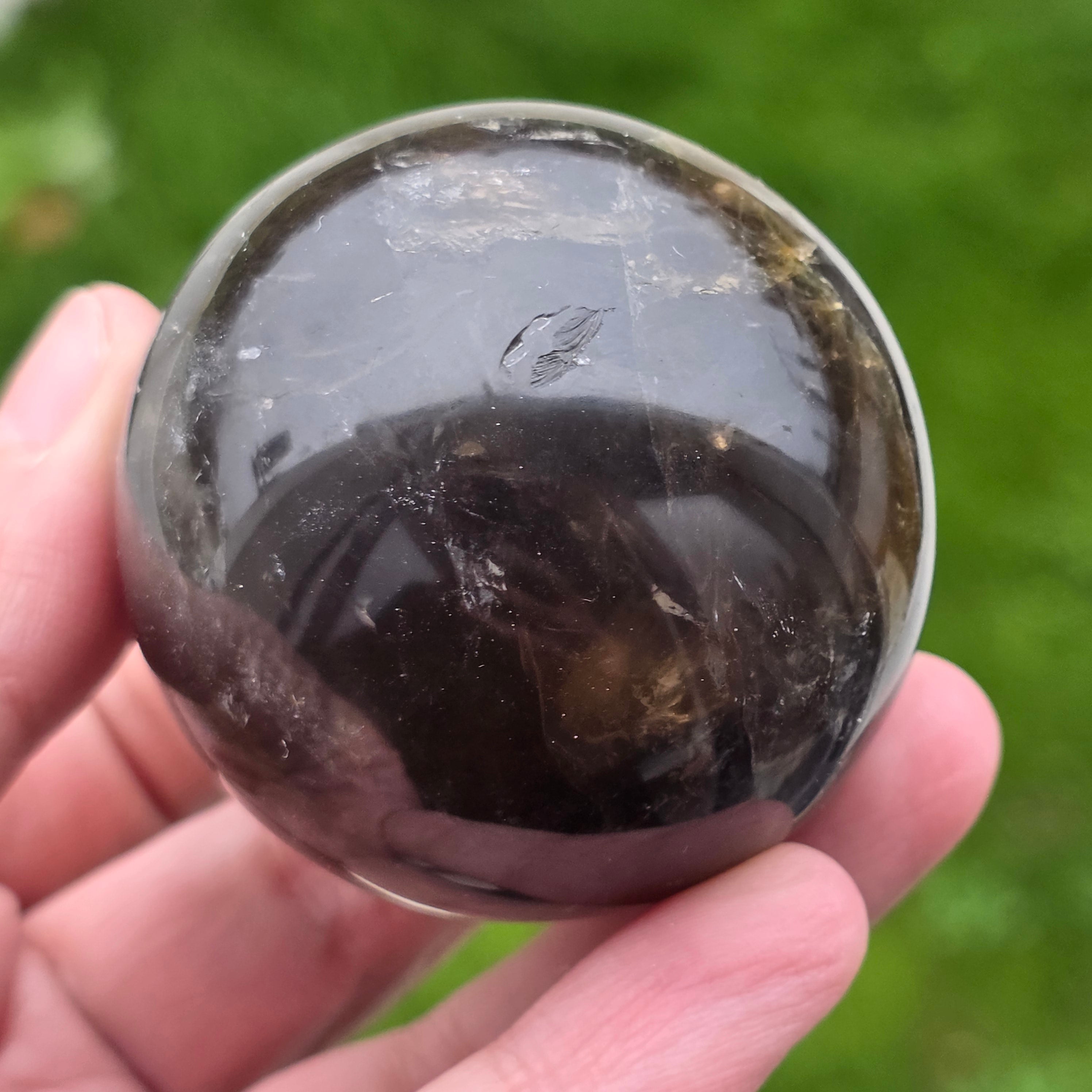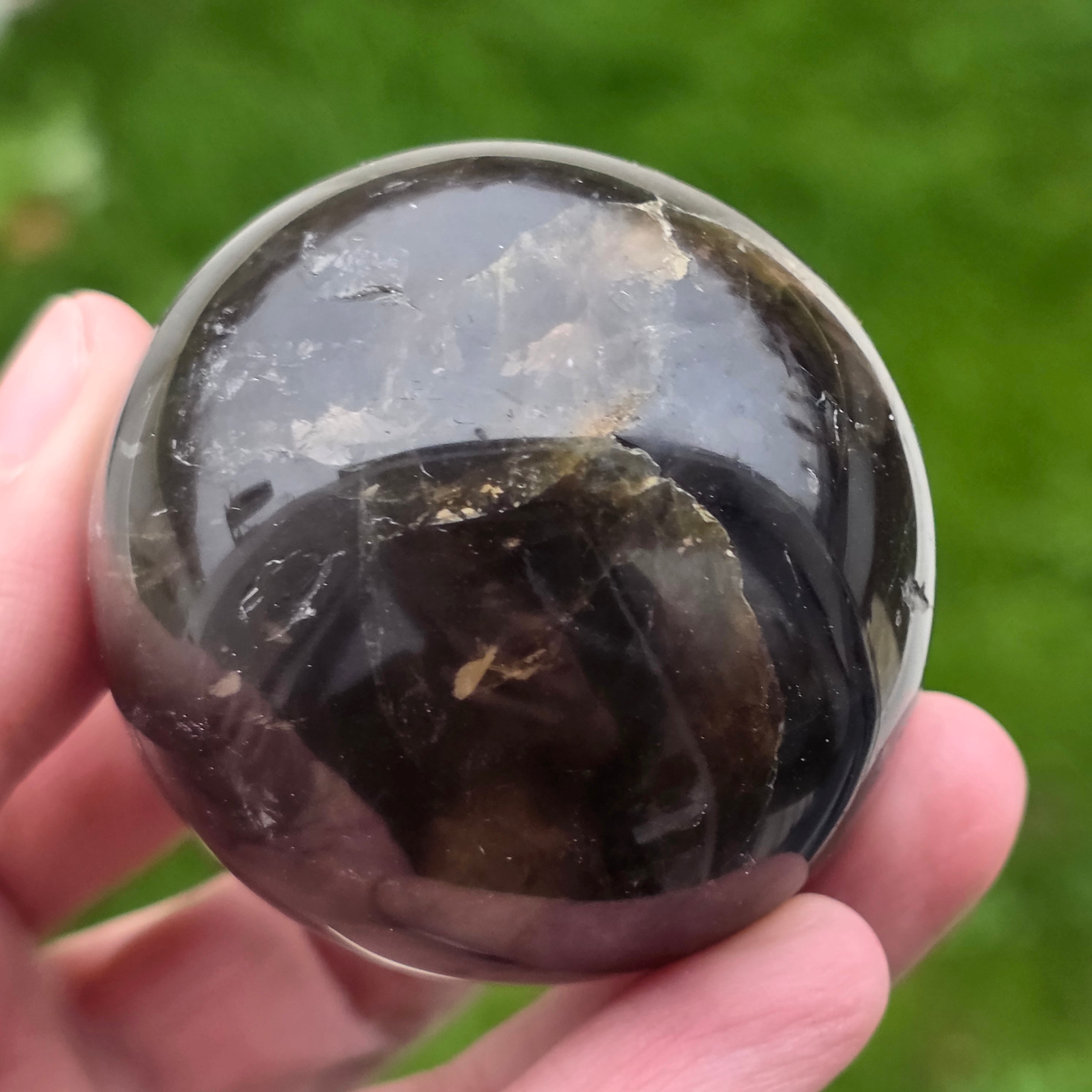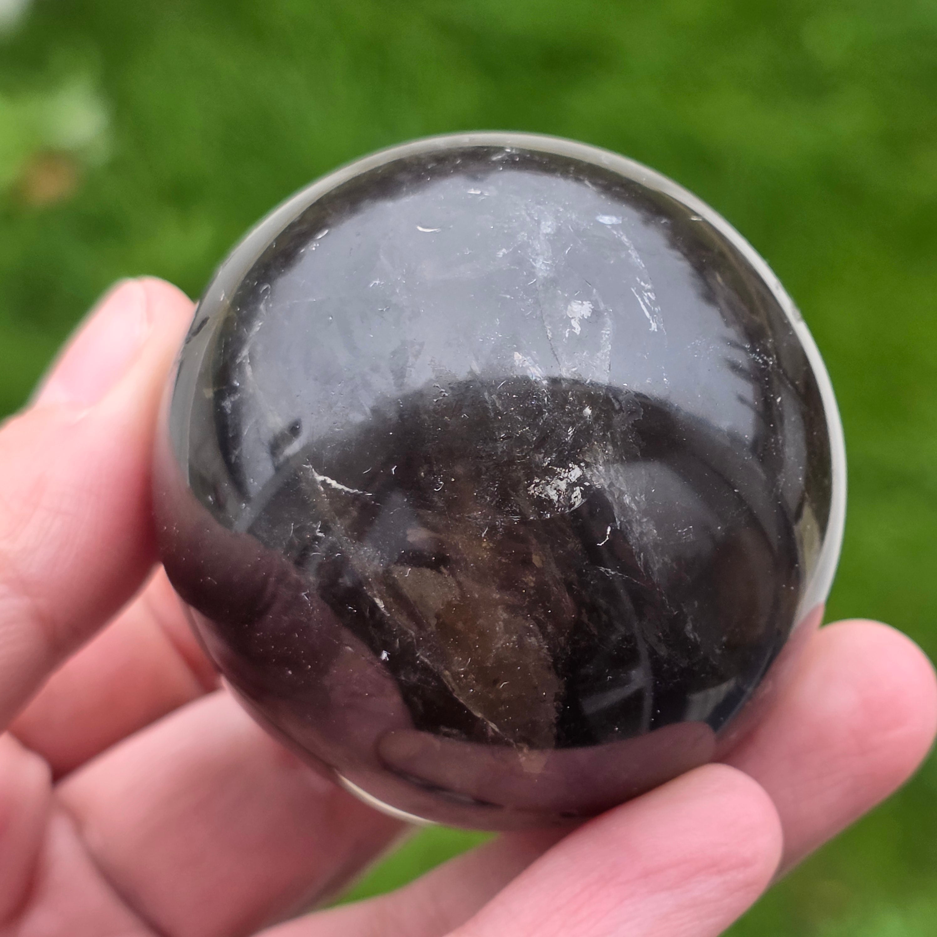 The morion quartz sphere is a powerful and elegant piece, known for its deep shade, resembling dense smoke or transparent obsidian. Morion is the darkest variety of smoky quartz, and in this perfectly round form, it reveals subtle reflections, fine internal details, and a truly sophisticated visual presence.