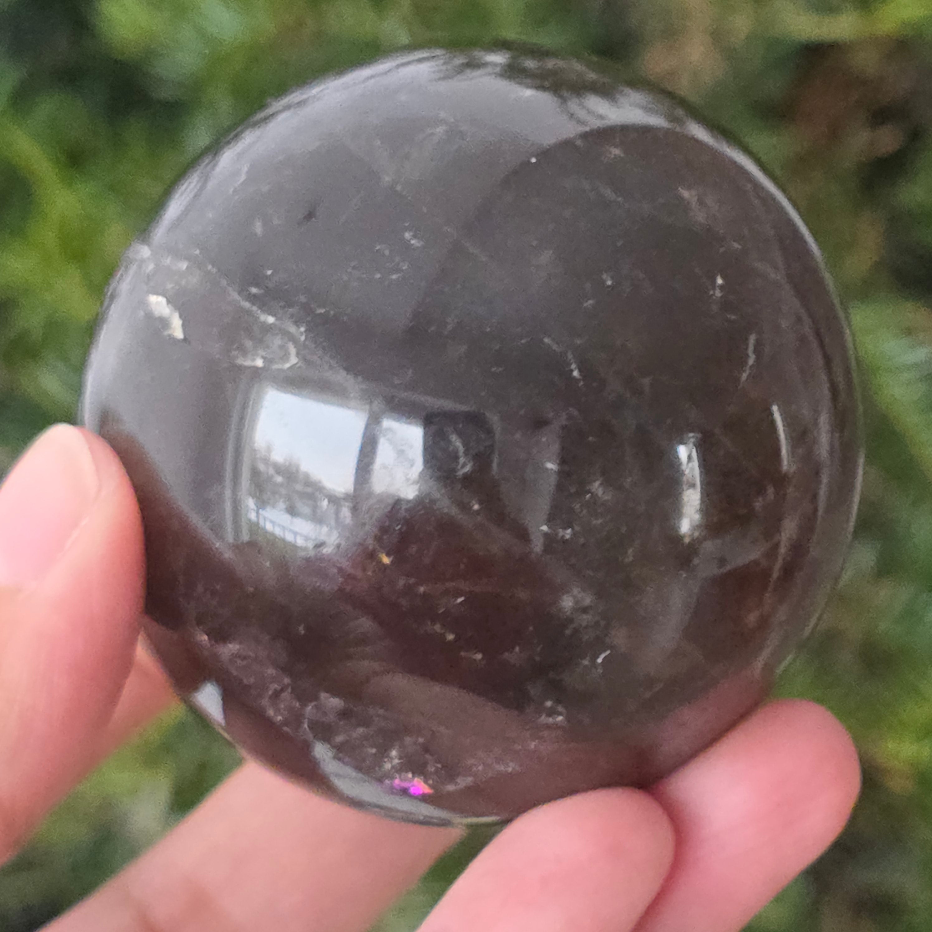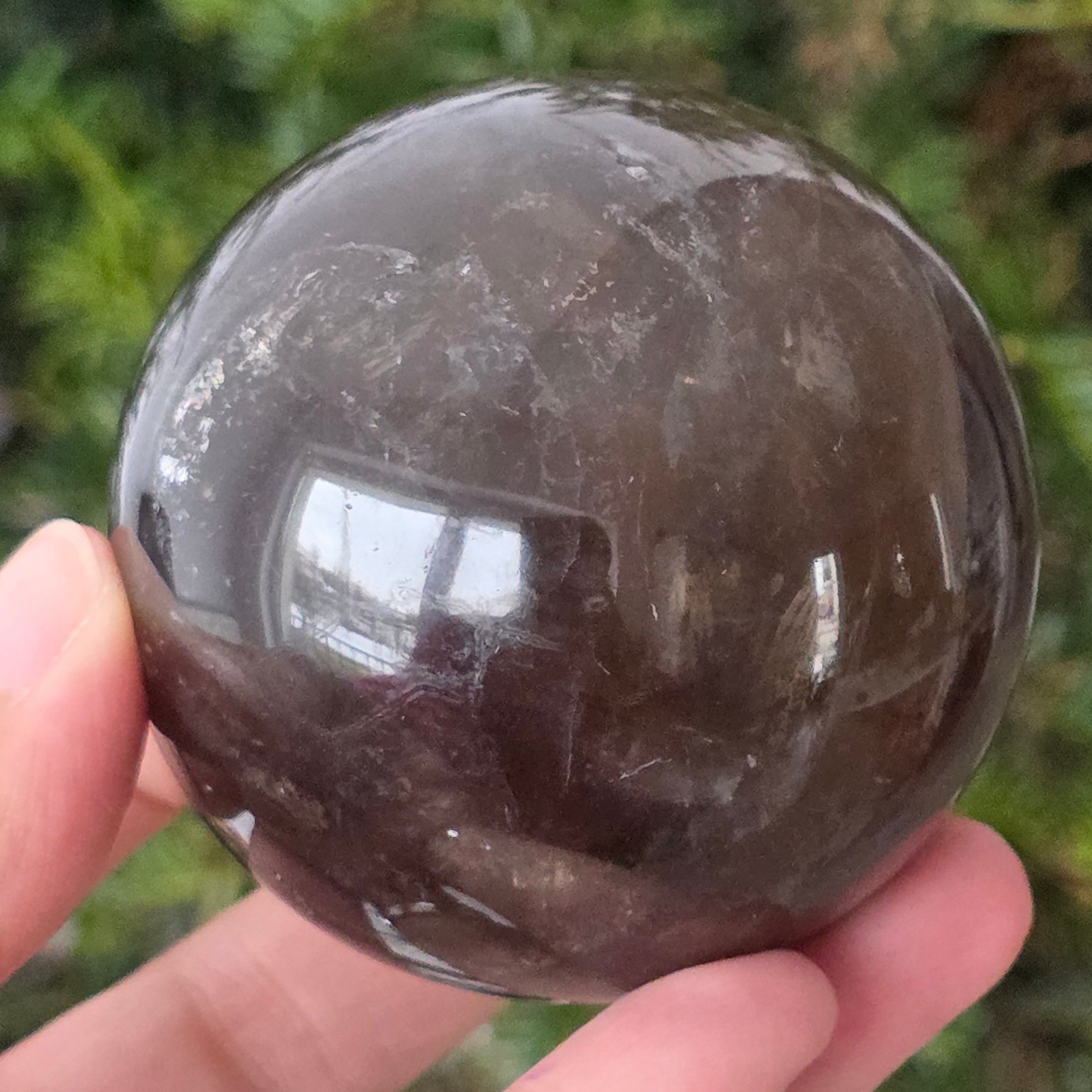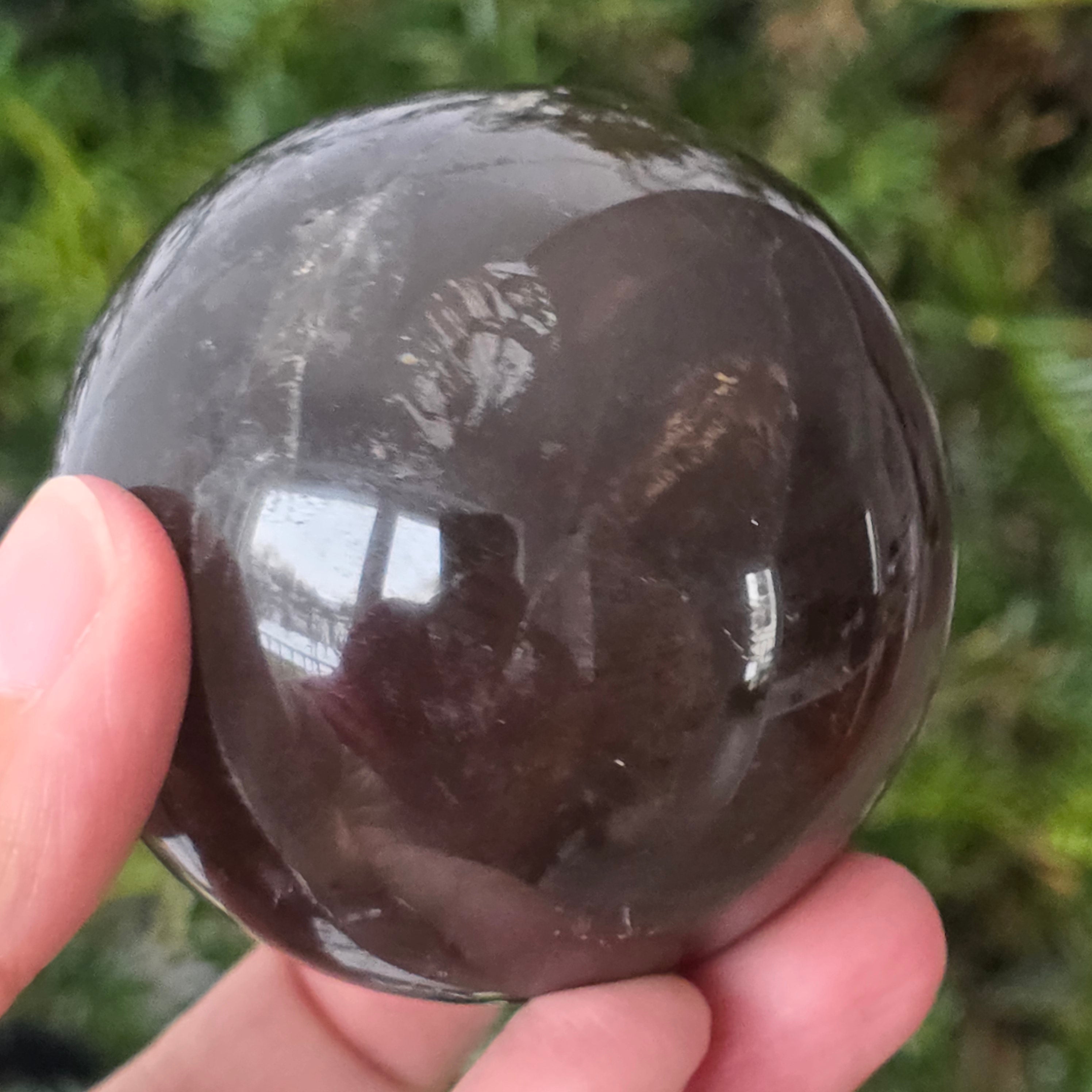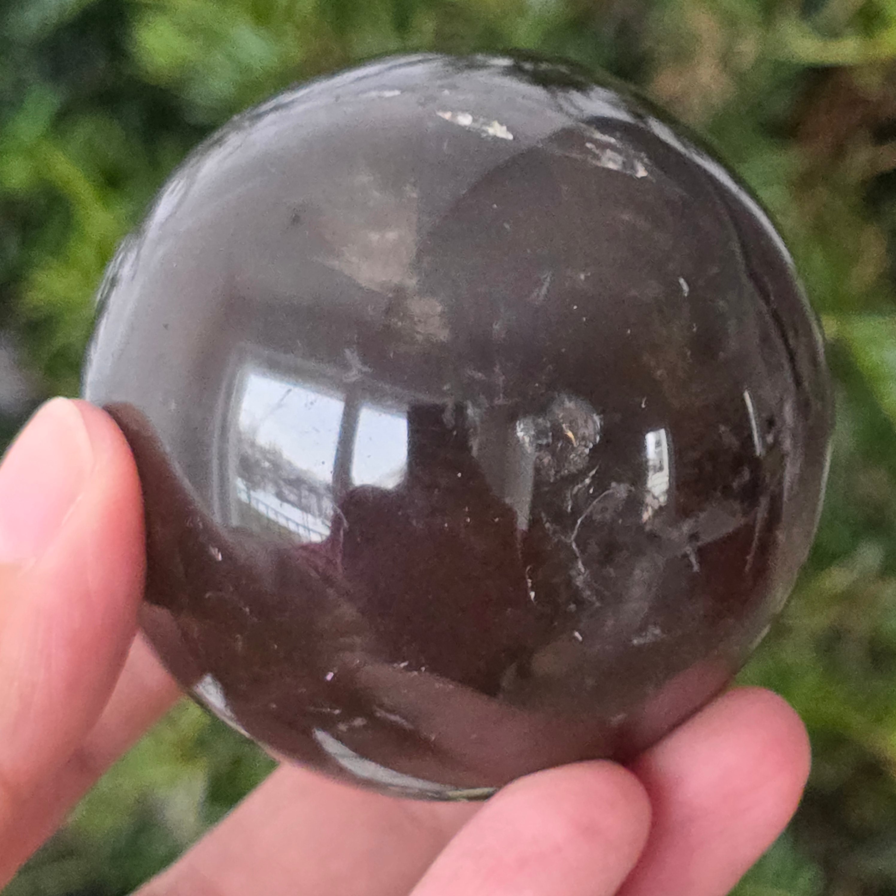 The morion quartz sphere is a powerful and elegant piece, known for its deep shade, resembling thick smoke or transparent obsidian. Morion is the darkest variety of smoky quartz, and in this perfectly round form, it reveals subtle reflections, fine internal details, and a truly sophisticated visual presence.