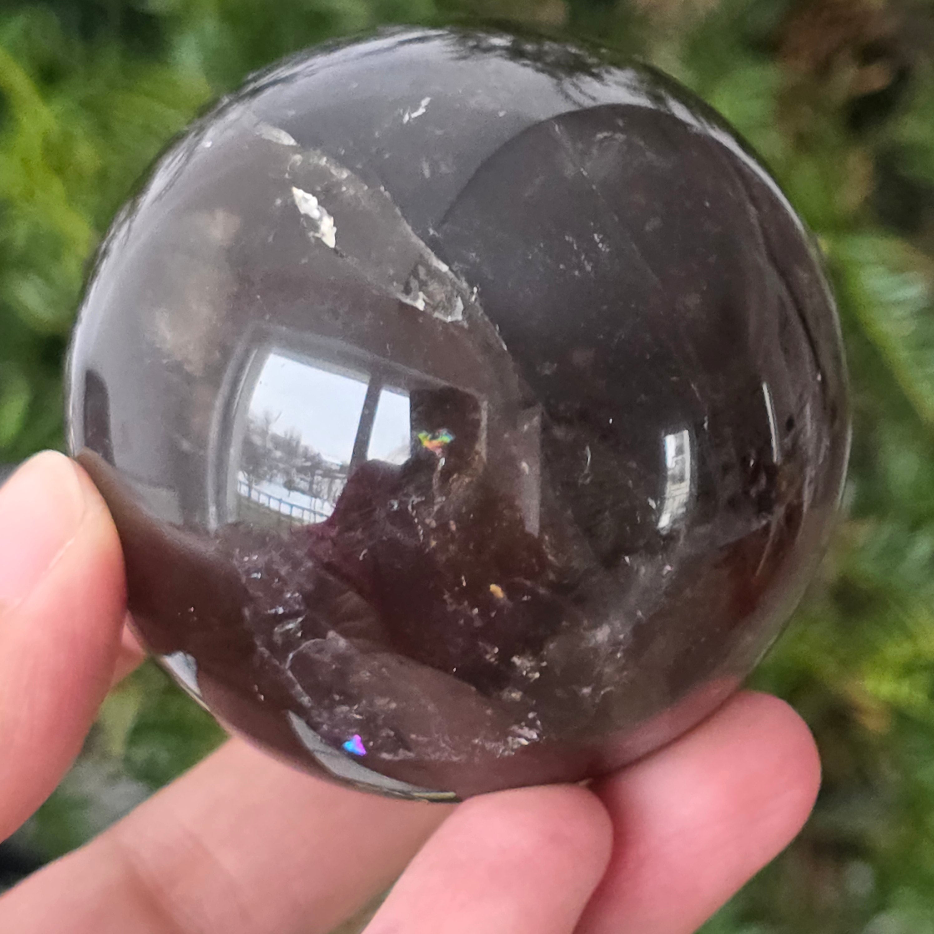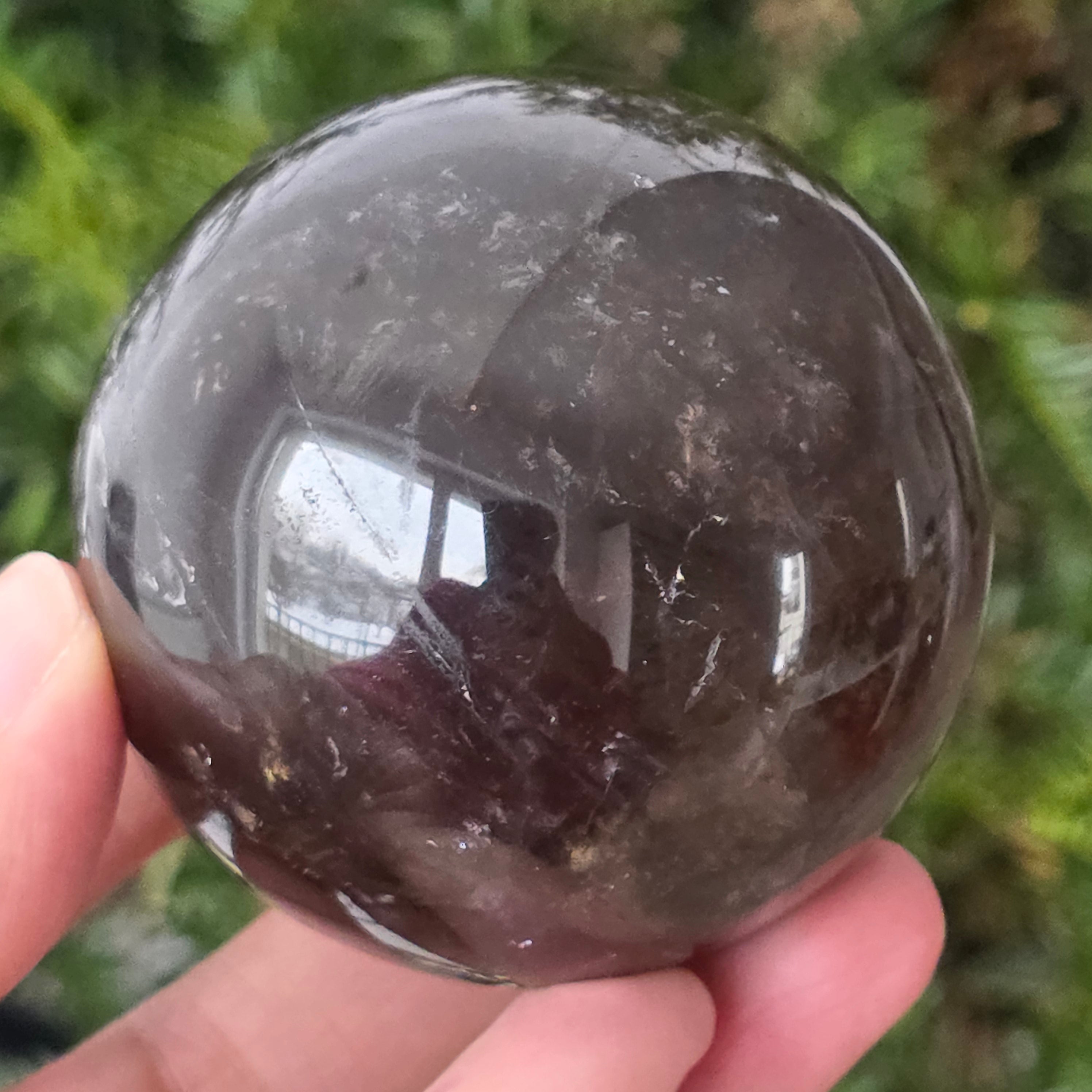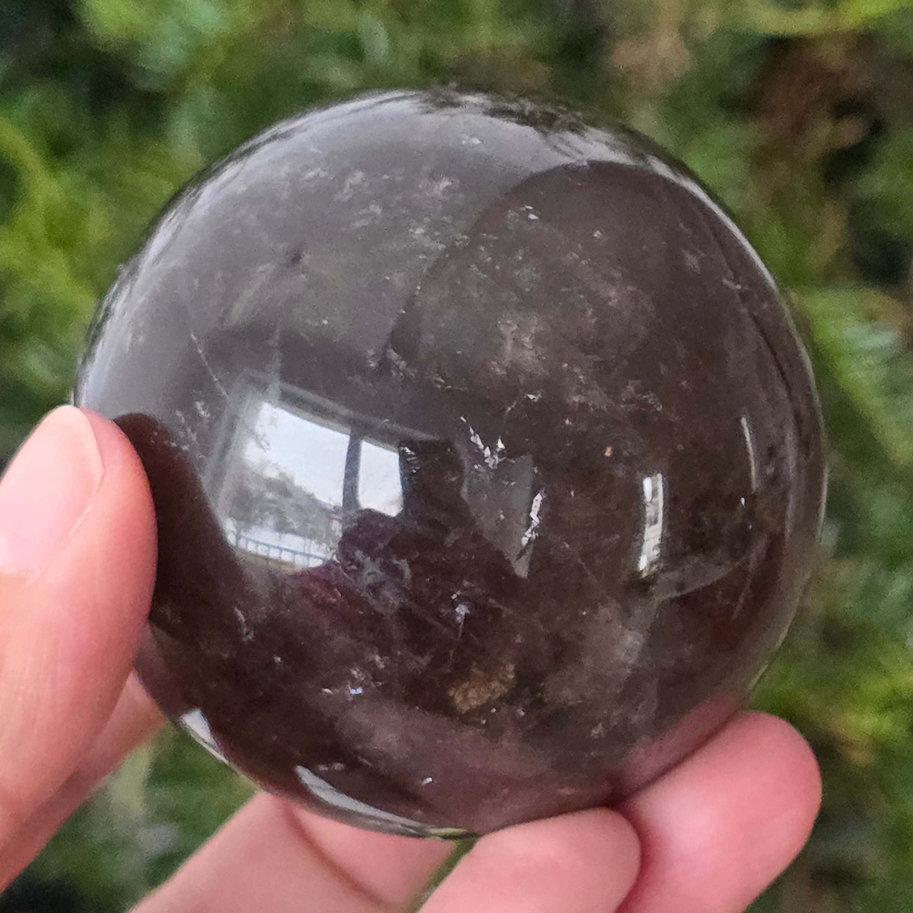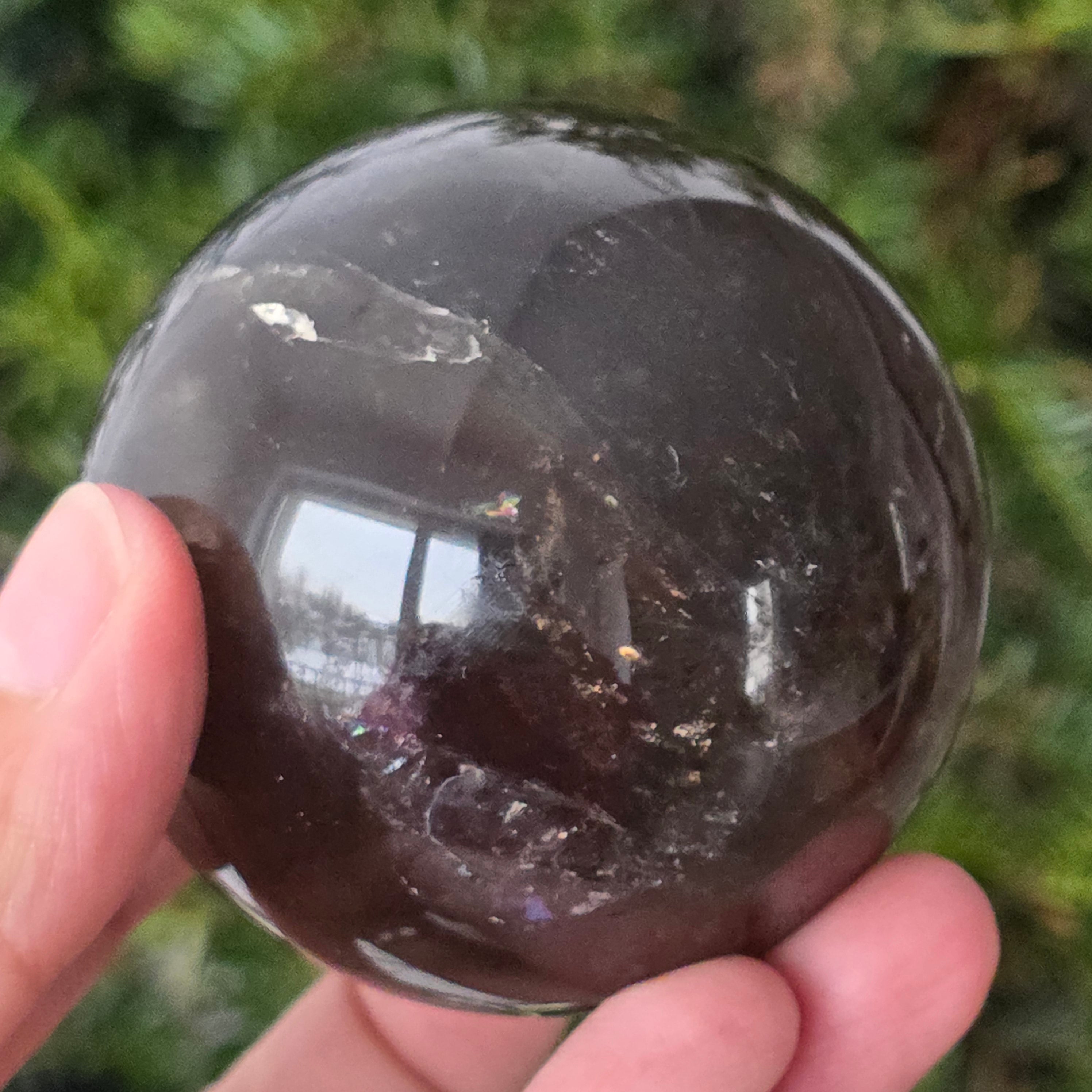 The morion quartz sphere is a powerful and elegant piece, known for its deep shade, resembling thick smoke or transparent obsidian. Morion is the darkest variety of smoky quartz, and in this perfectly round form, it reveals subtle reflections, fine internal details, and a truly sophisticated visual presence.