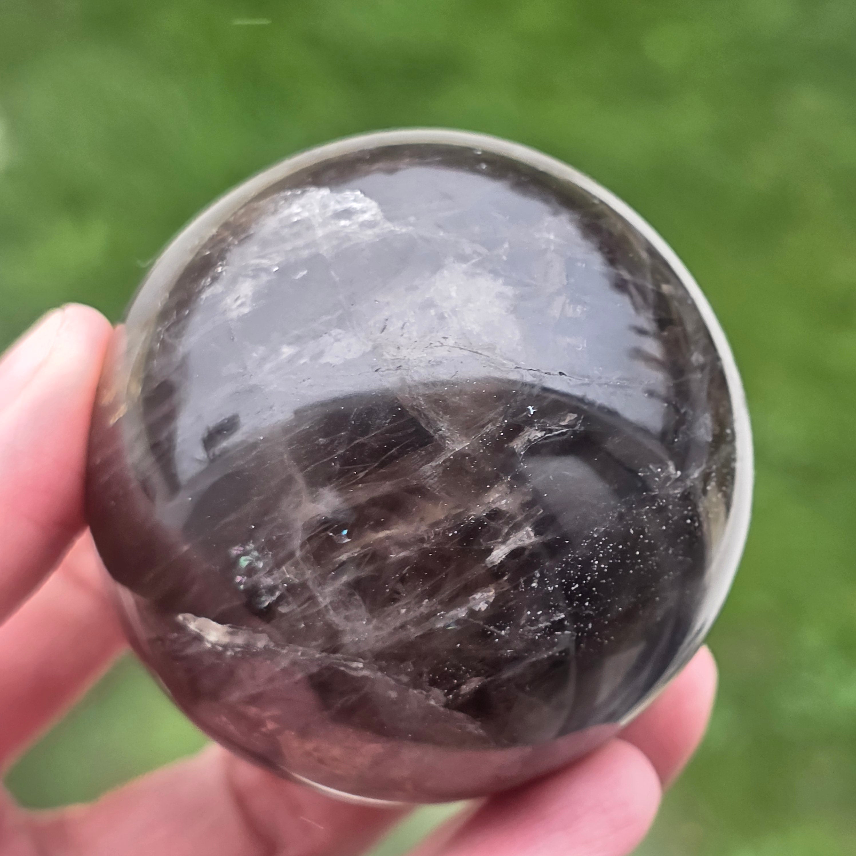 The morion quartz sphere is a powerful and elegant piece, known for its deep shade, resembling dense smoke or transparent obsidian. Morion is the darkest variety of smoky quartz, and in this perfectly round form, it reveals subtle reflections, fine internal details, and a truly sophisticated visual presence.
