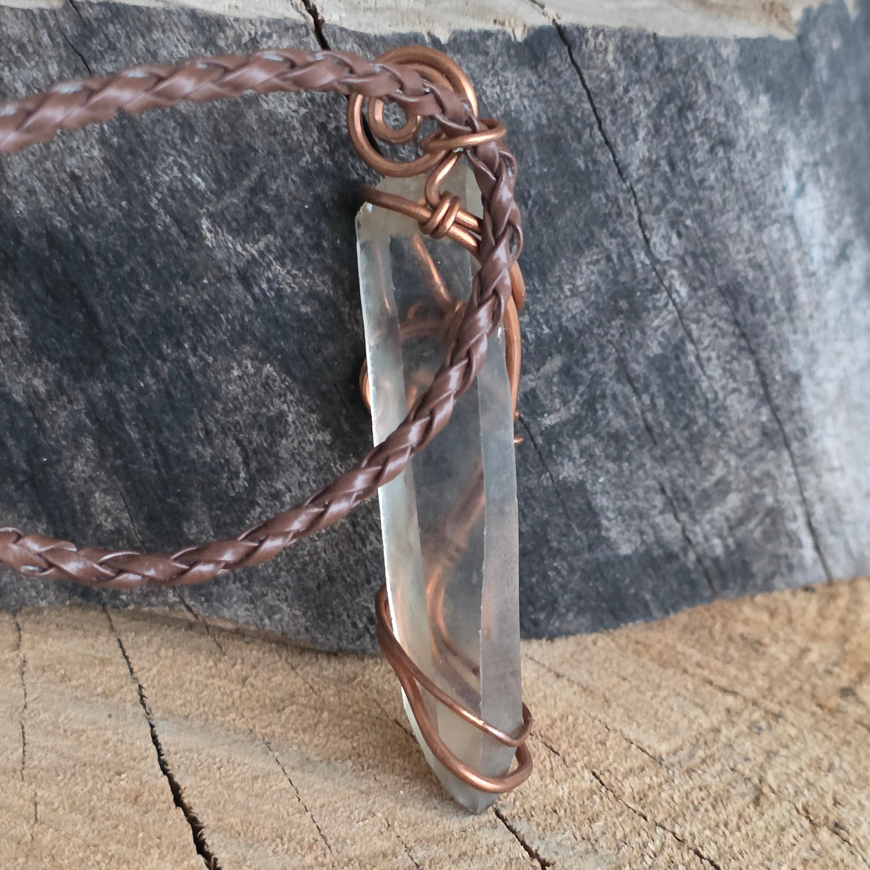 This unique necklace brings the magic of Africa to life through a natural smoky quartz pendant sourced from Zimbabwe. The stone, set in a handmade twisted copper artistic setting, reveals its deep shades ranging from translucent gray to warm brown, seemingly capturing the essence of smoke rising gently from a purifying fire.