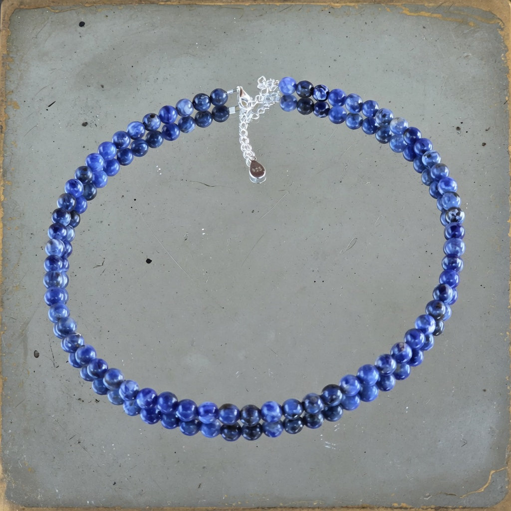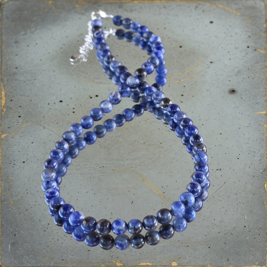 A necklace with a clear and profound presence, made from 6 mm sodalite beads, creating a well-defined and balanced line around the neck. The intense blue, with natural white or gray inclusions, gives the stone a sober and expressive appearance, while the spherical shape enhances the feeling of stability and visual coherence. The design is simple and deliberate, allowing the color and natural structure of the sodalite to be the central element.