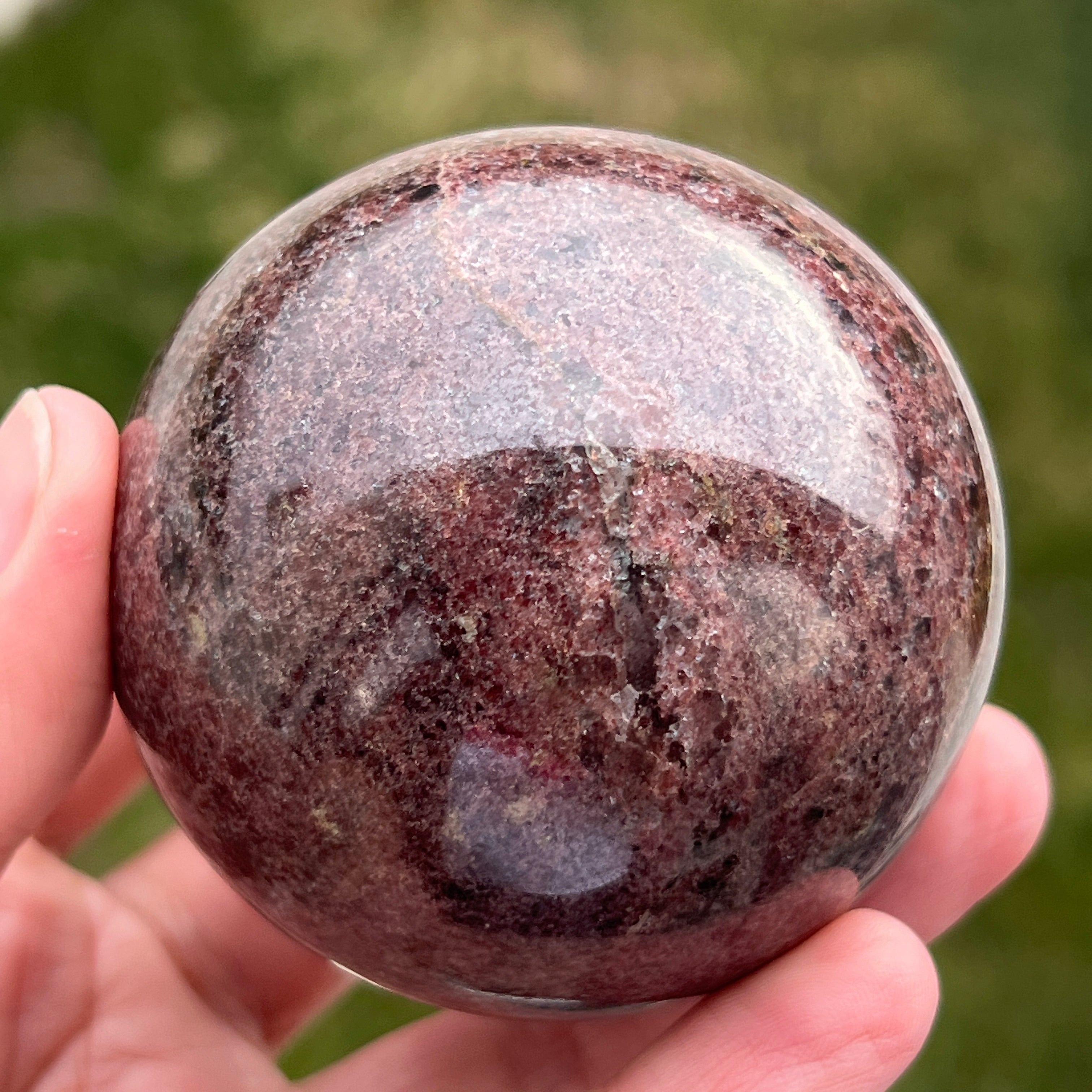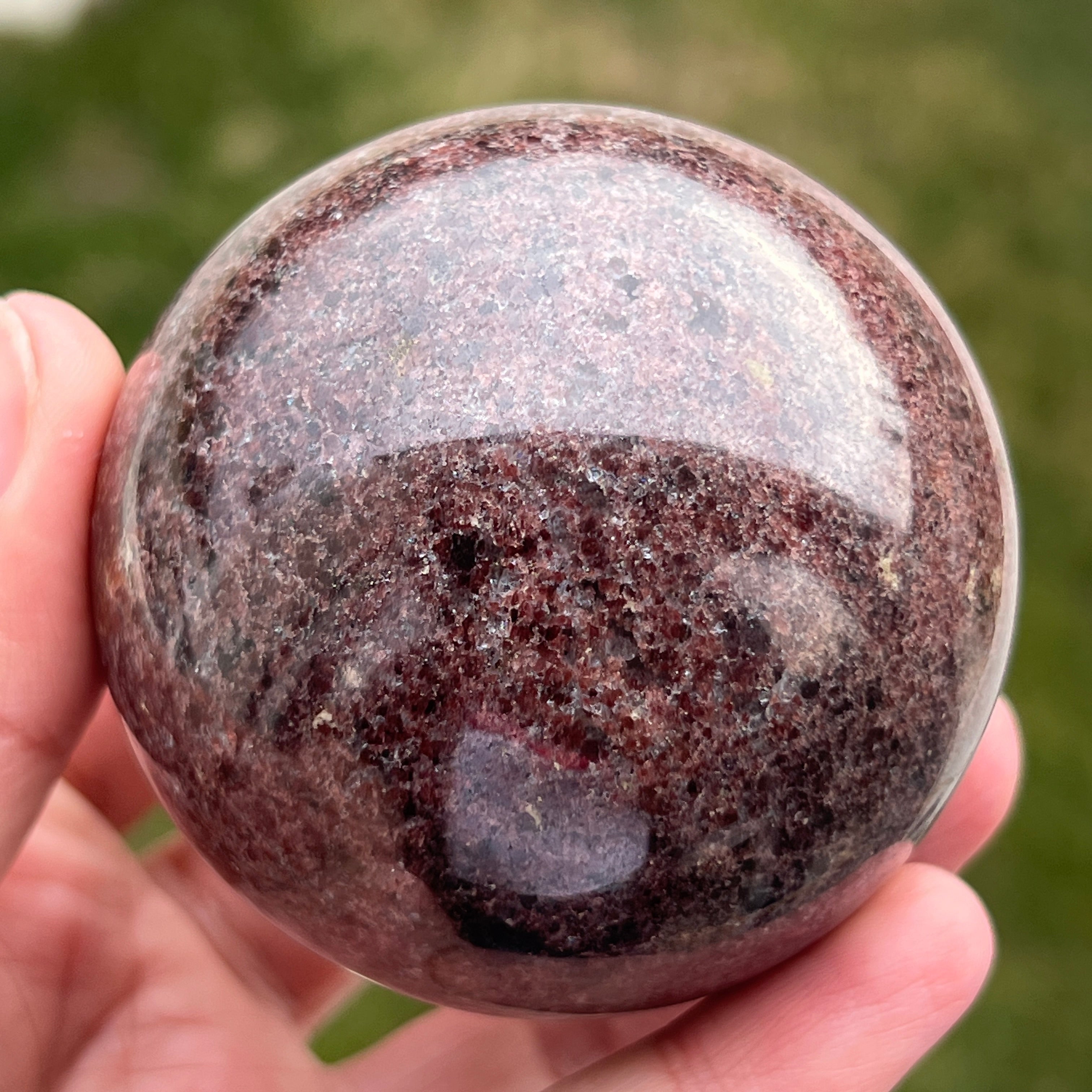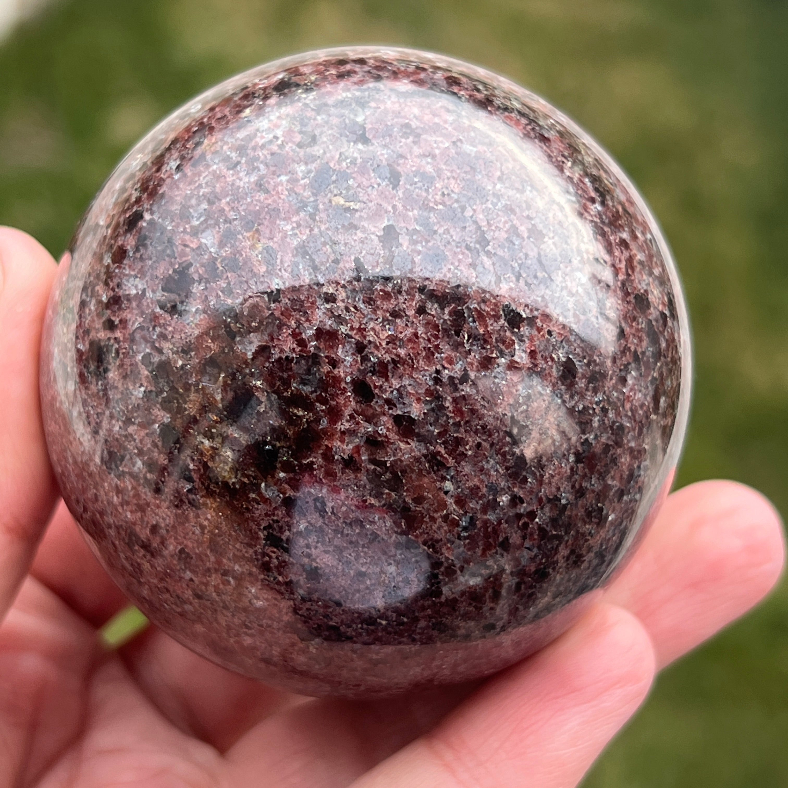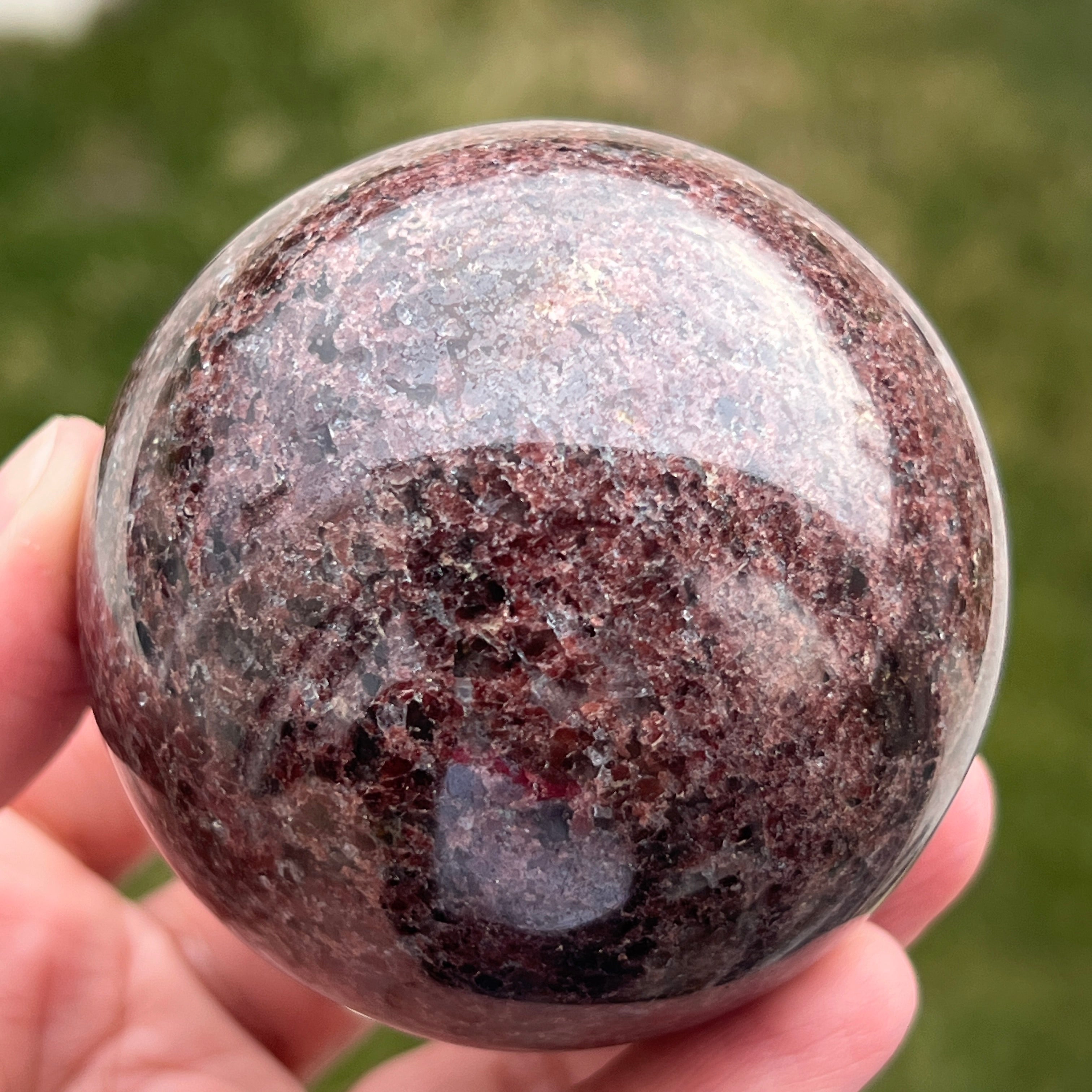 The garnet sphere is made from a mineral in the silicate group, known for its compact crystalline structure and for its intense shades, from dark red to deep cherry tones. Due to its composition, garnet is a hard and stable material, making it suitable for processing into shapes such as the sphere, where its texture and color can be observed uniformly from all angles.