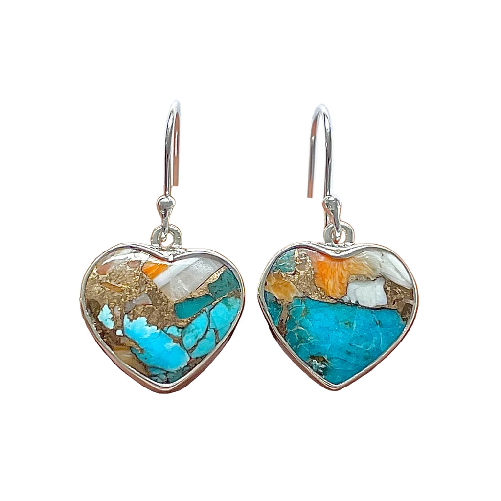 These unique heart -shaped earrings manage to capture the energy of the sea and the sun. The contrast between the intense blue turquoise and the warm orange and white shades of Spiny Oyster shell create a lively jewel, which evokes the freedom of the ocean and the joy of the present moment.