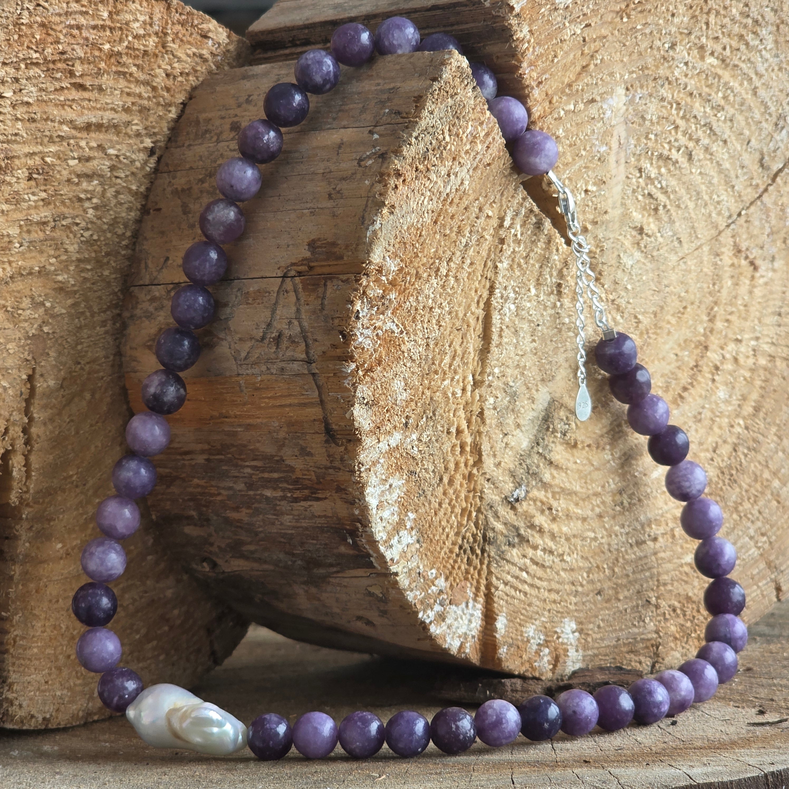 Materials: Natural 8 mm lepidolite, 2 cm natural pearl, 925 silver