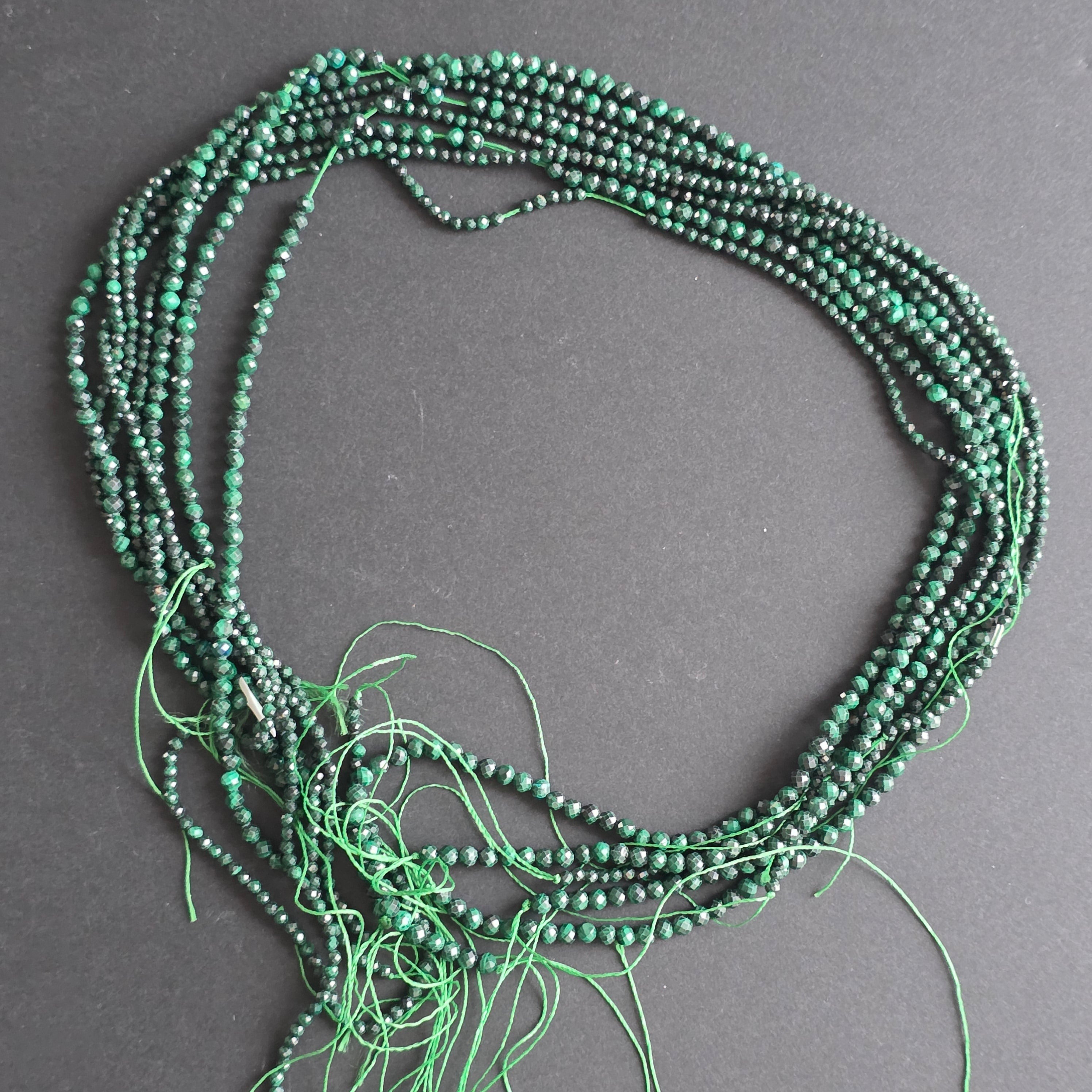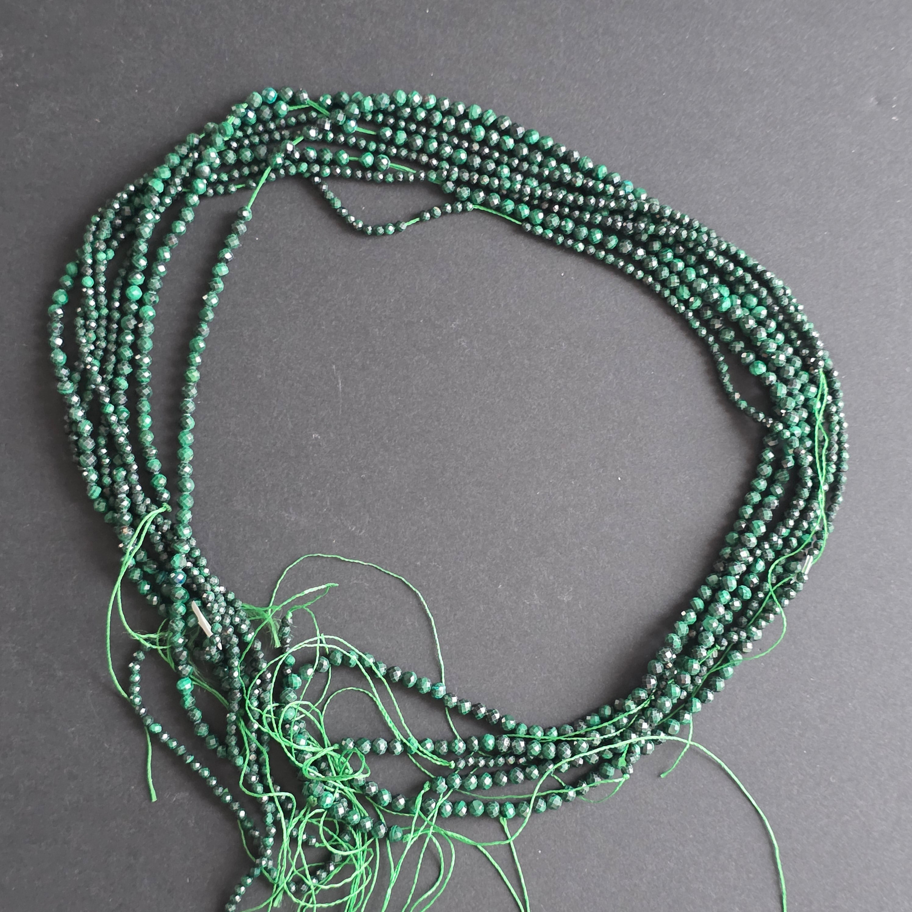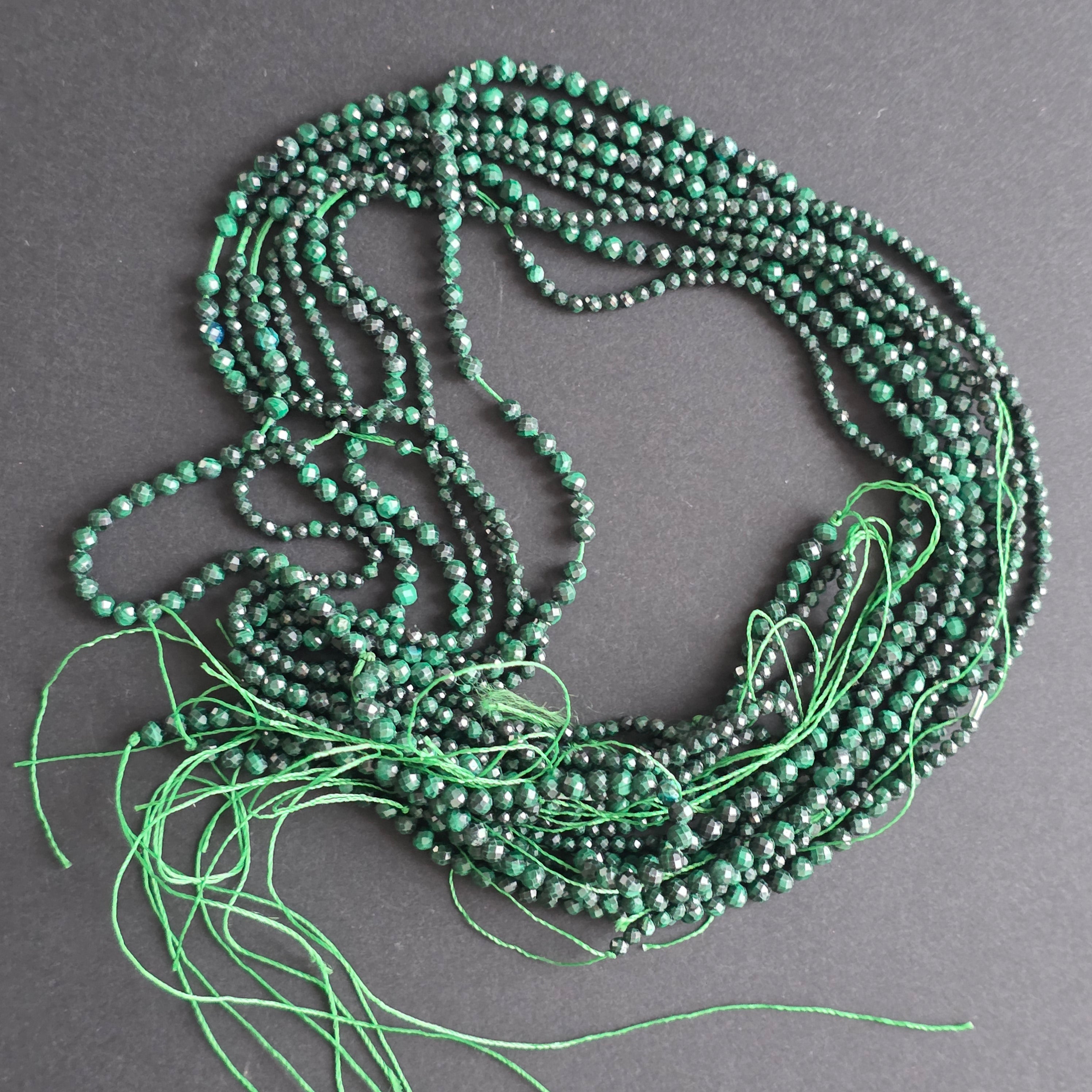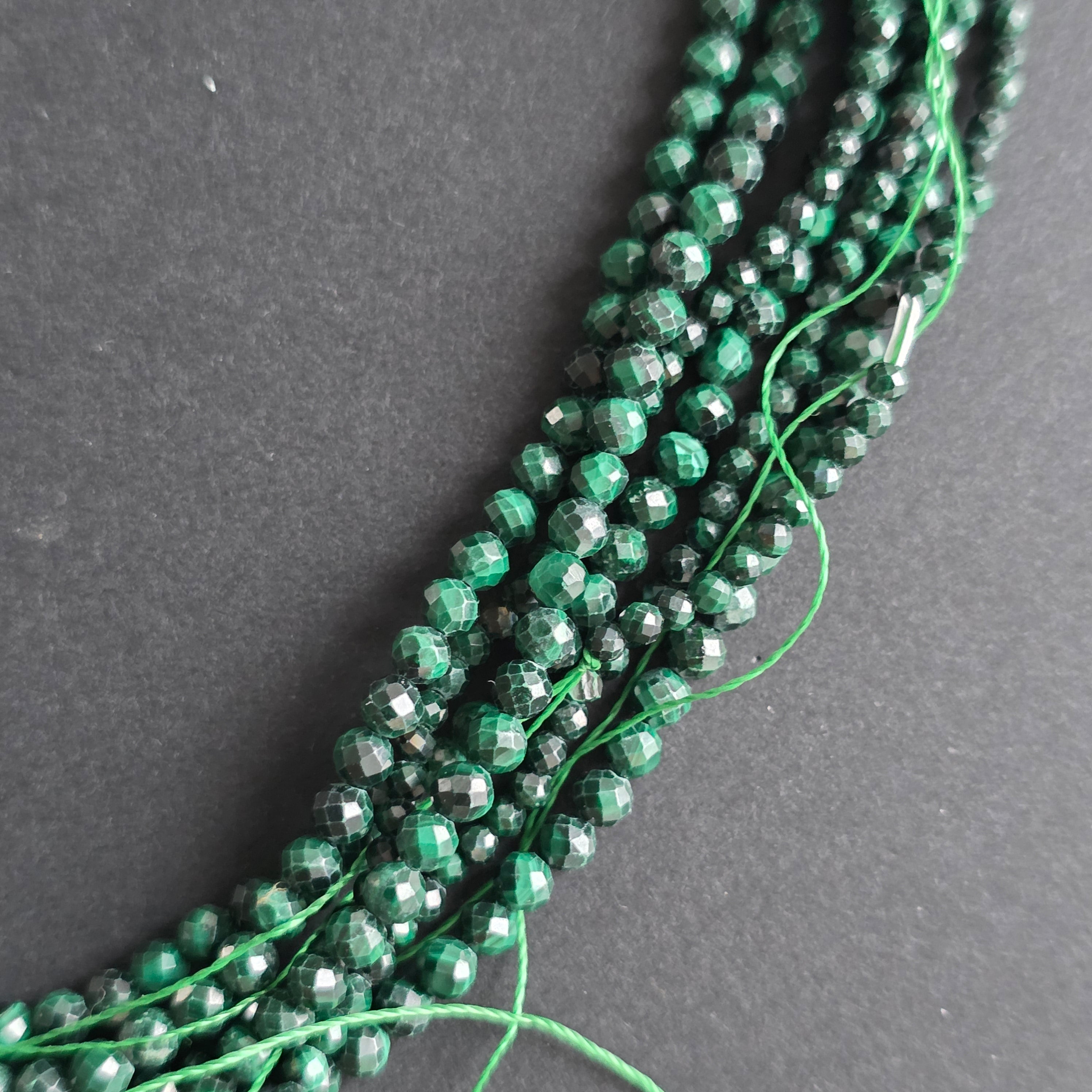 Description - Strand of semi-precious stone beads, faceted MALACHITE SPHERES