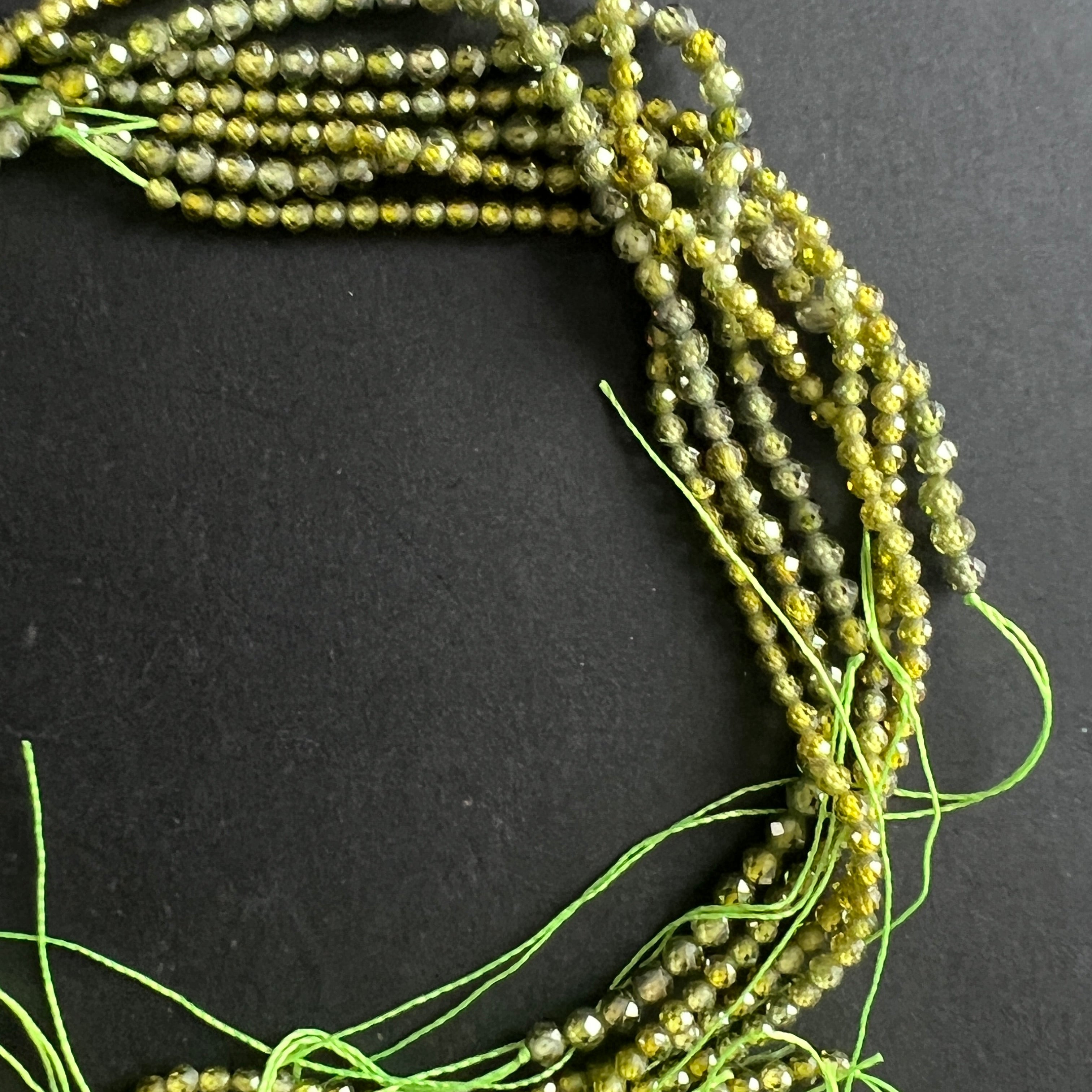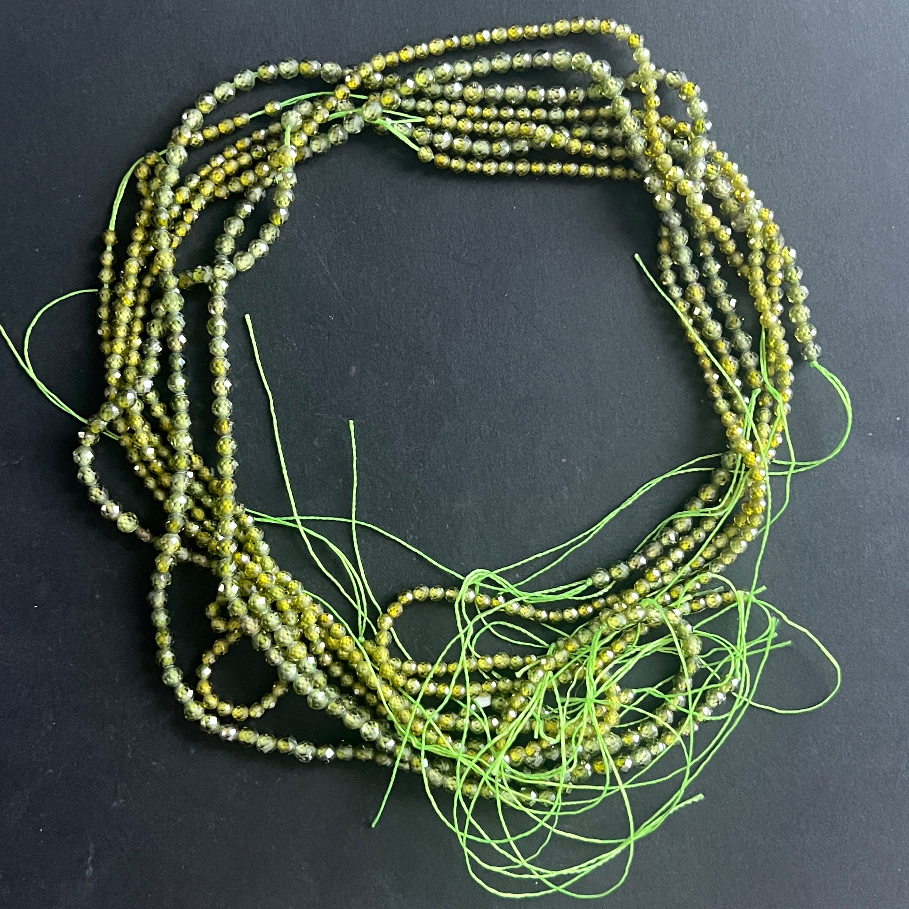 String of beads with semi-precious faceted ZIRCON GREEN spheres