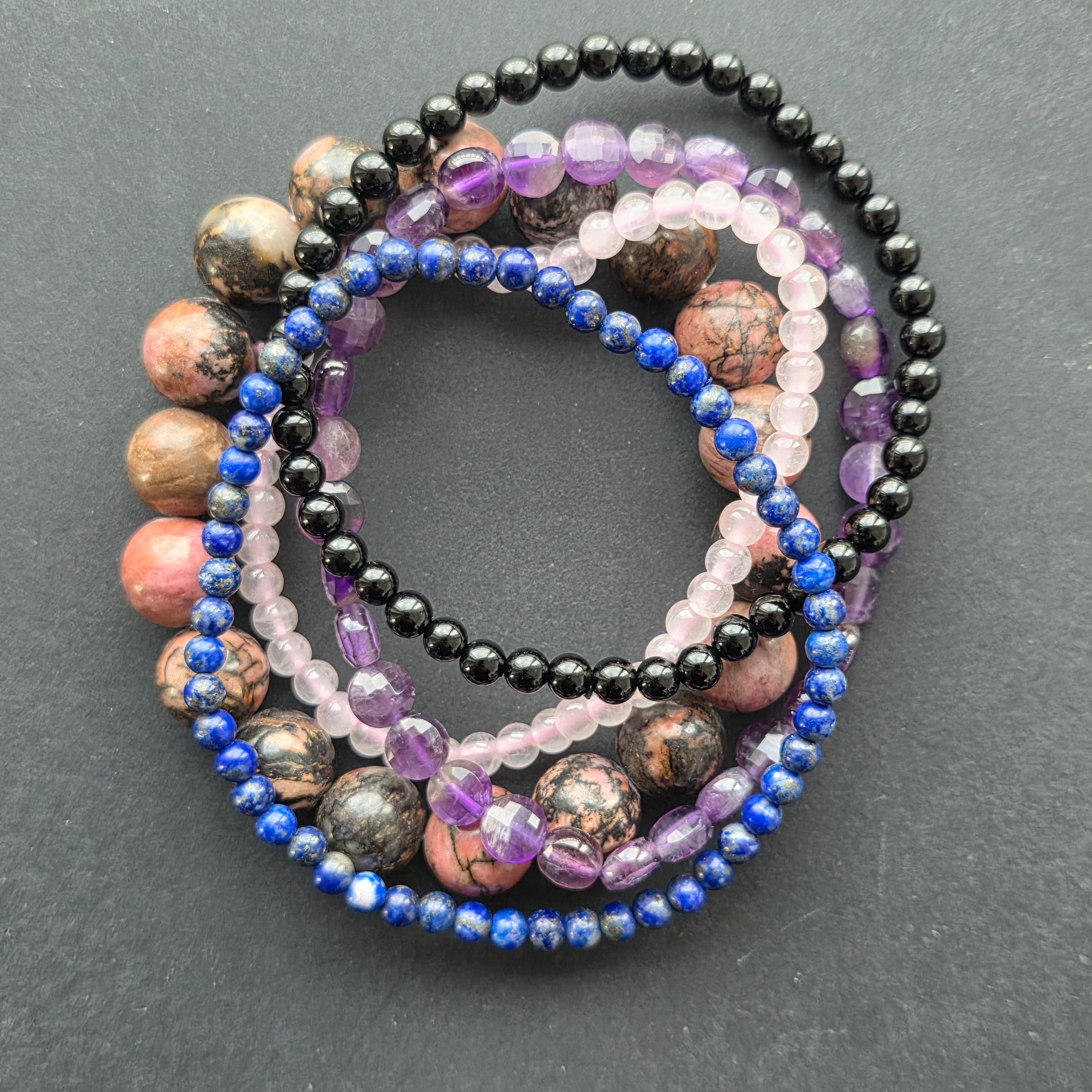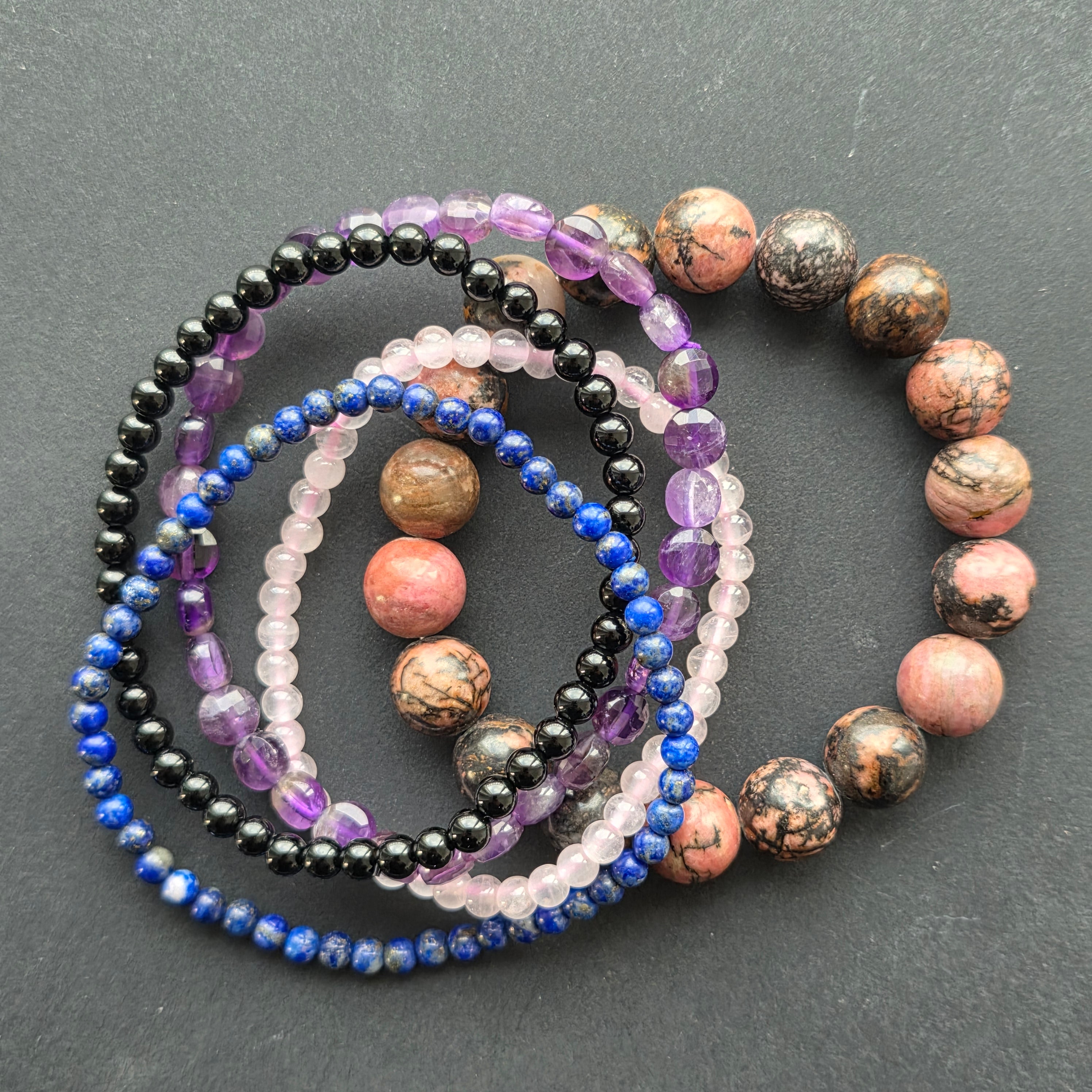 Black onyx in 4 mm completes the set with stability, protection, and grounding — an essential vibration for someone building her life with patience and structure.