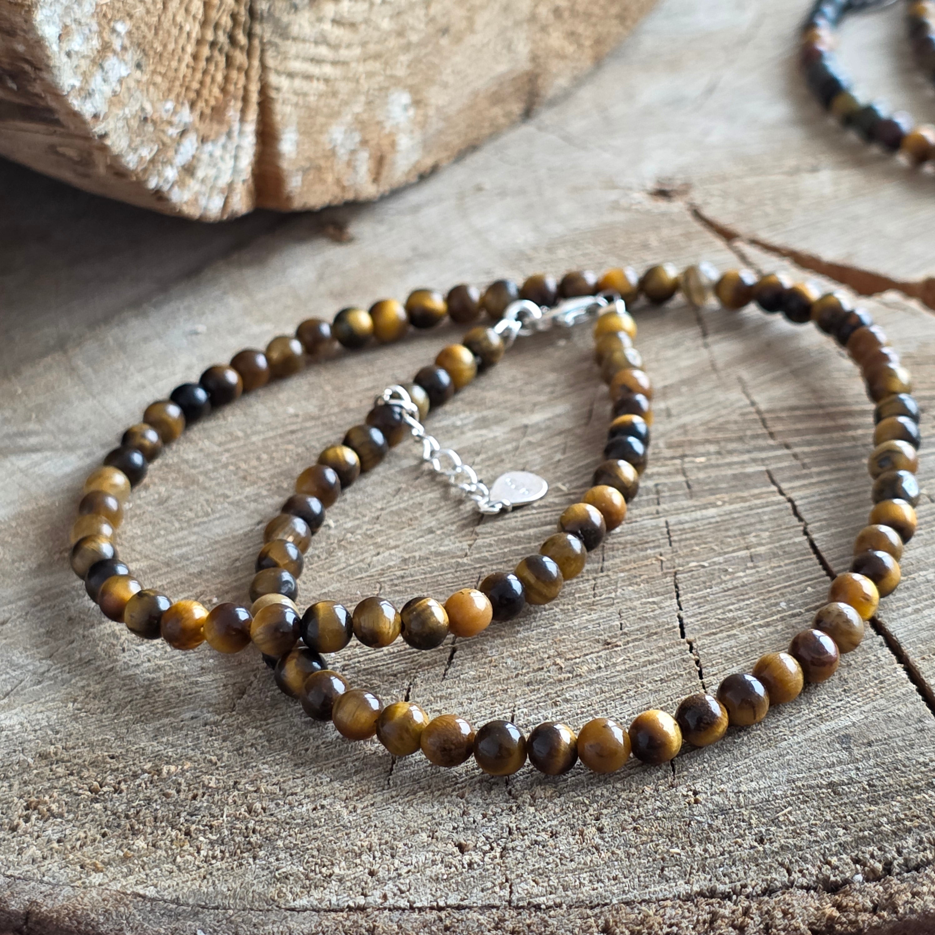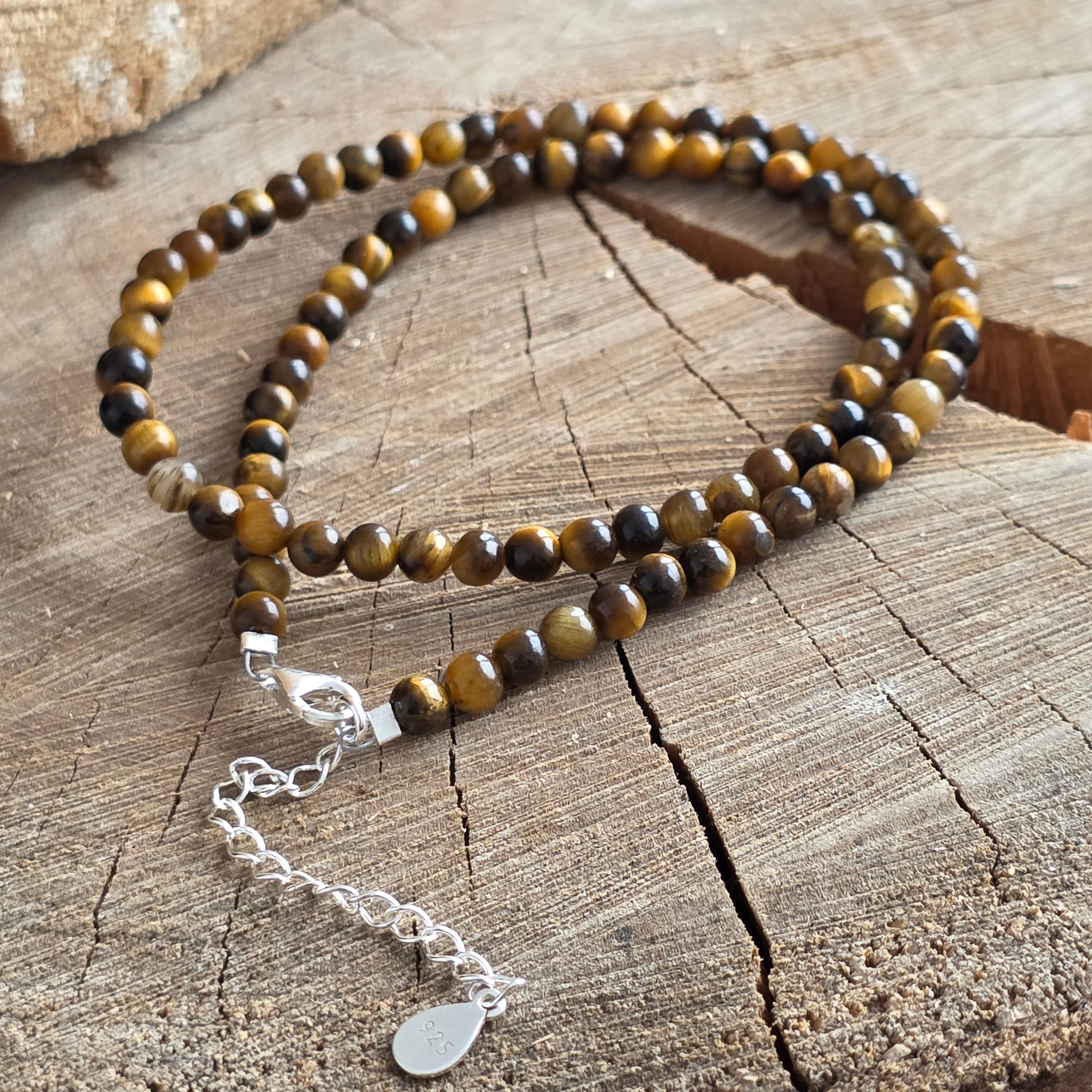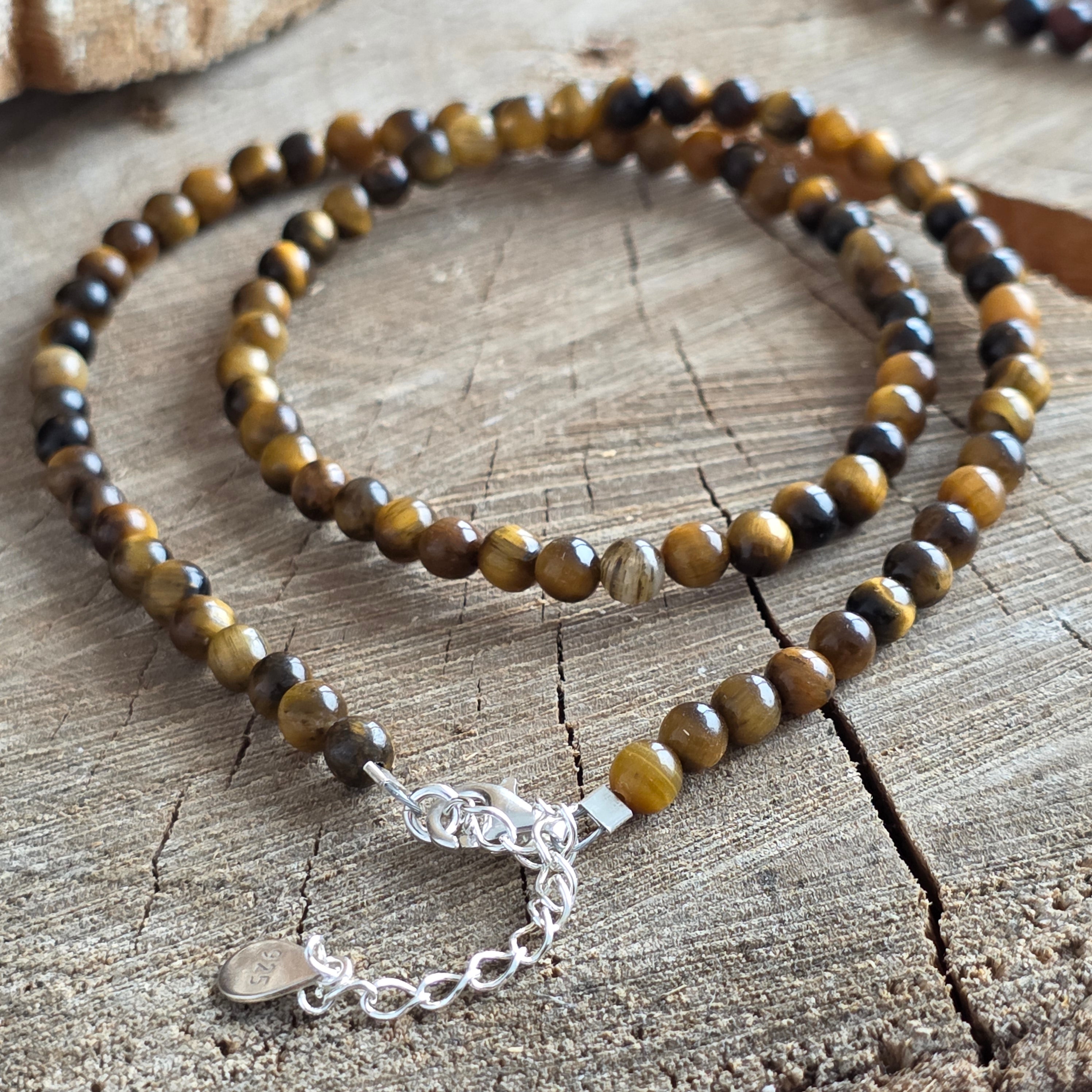 A jewel that vibrates in golden tones and copper shadows - like the rays filtered through the dense foliage of a sacred forest. This tiger eye necklace, with 4 mm beads, reveals a subtle glow, like a promise spoken in a whisper by the earth itself.