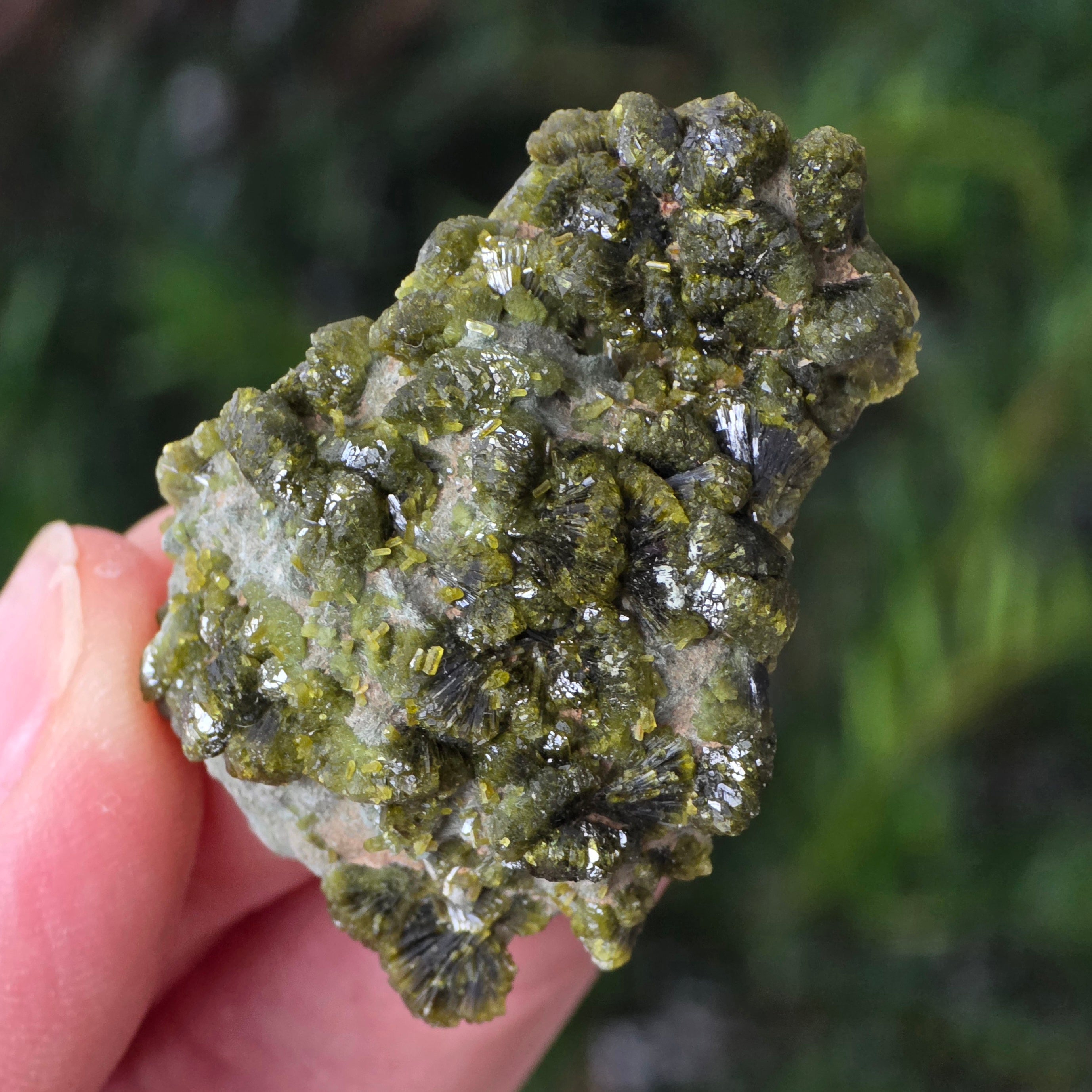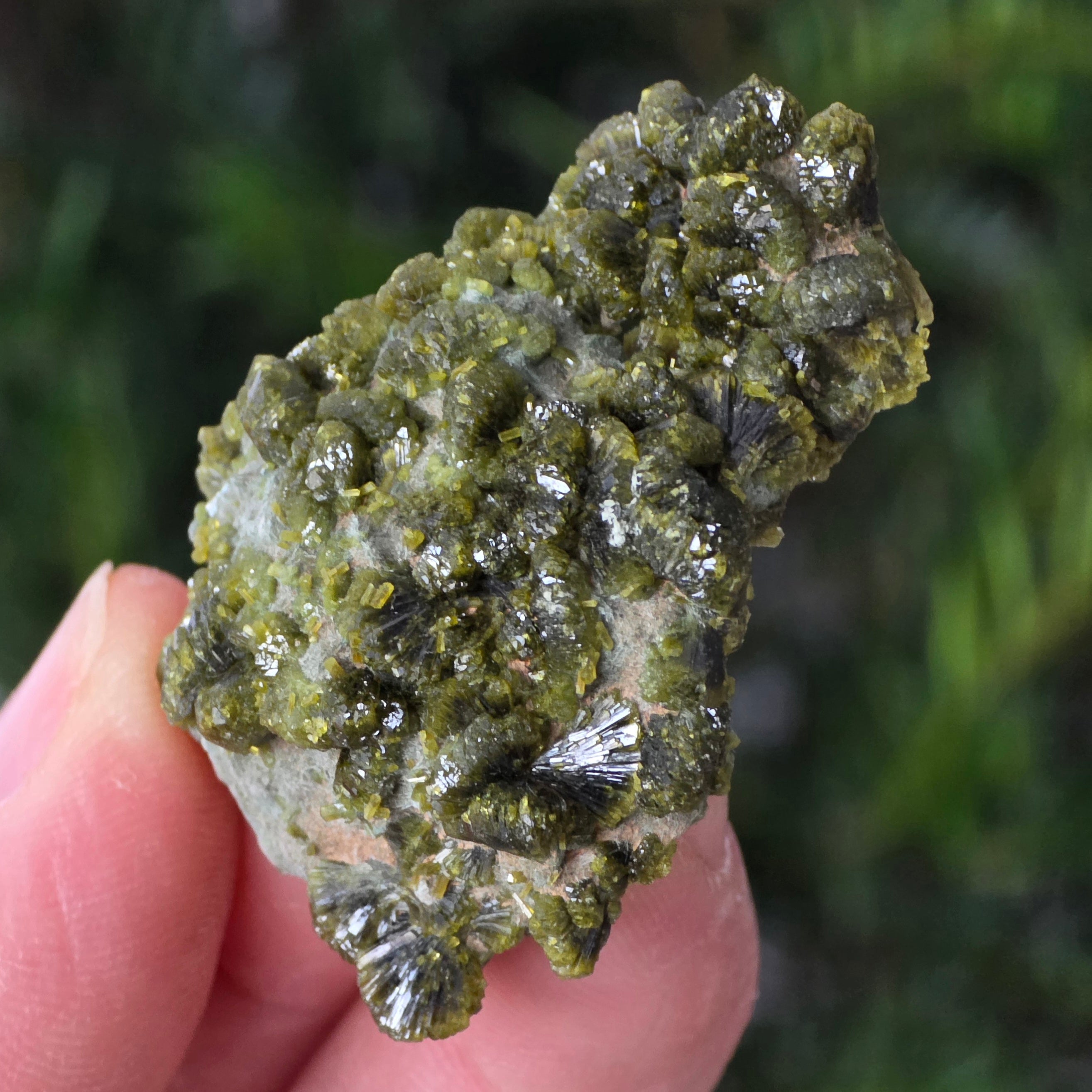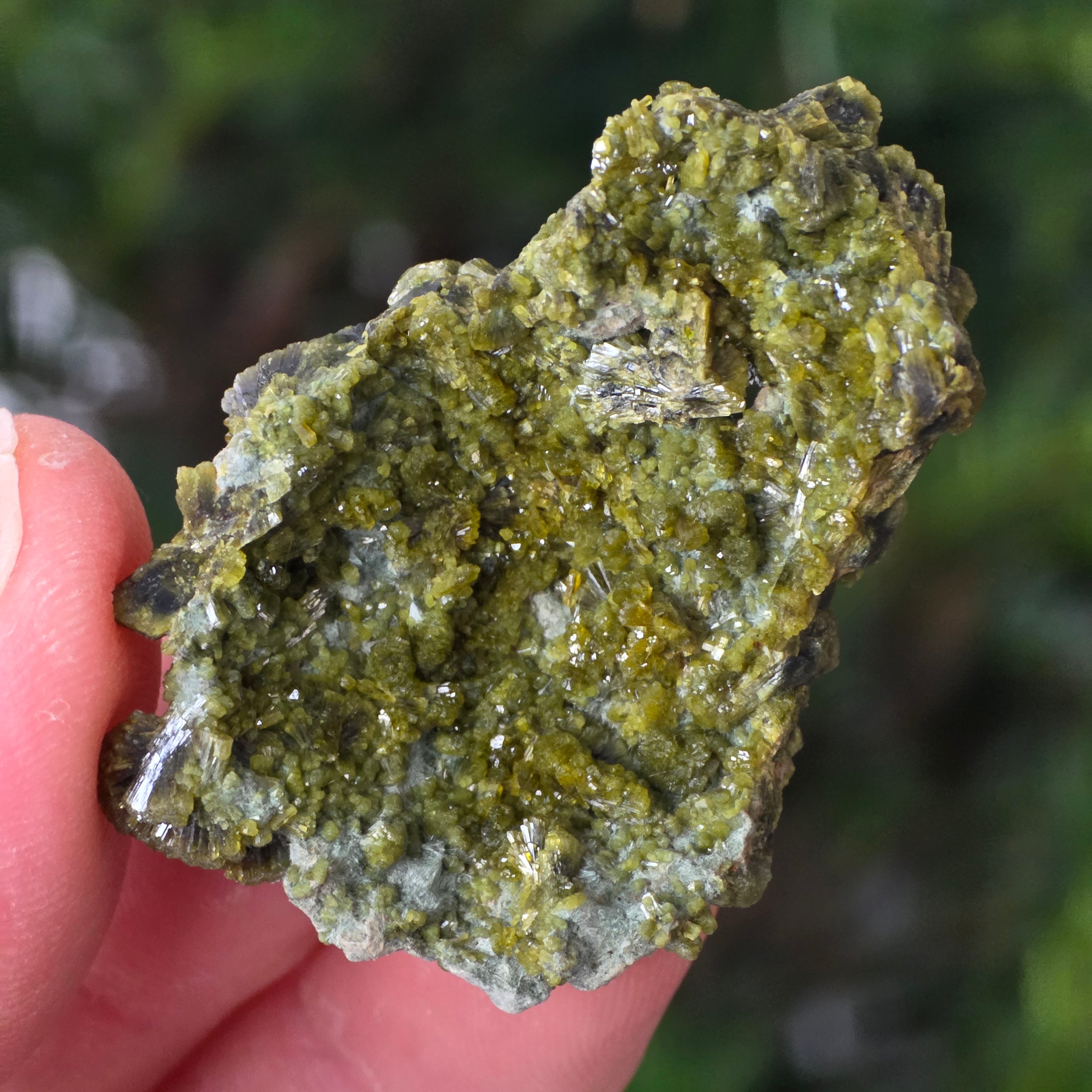 Epidote forms in metamorphic rocks and hydrothermal cavities, as a result of the slow transformation of primary minerals under the pressure of the Earth. Its prismatic, shiny crystals can range from olive green to deep green or even brownish-green, depending on the iron content.