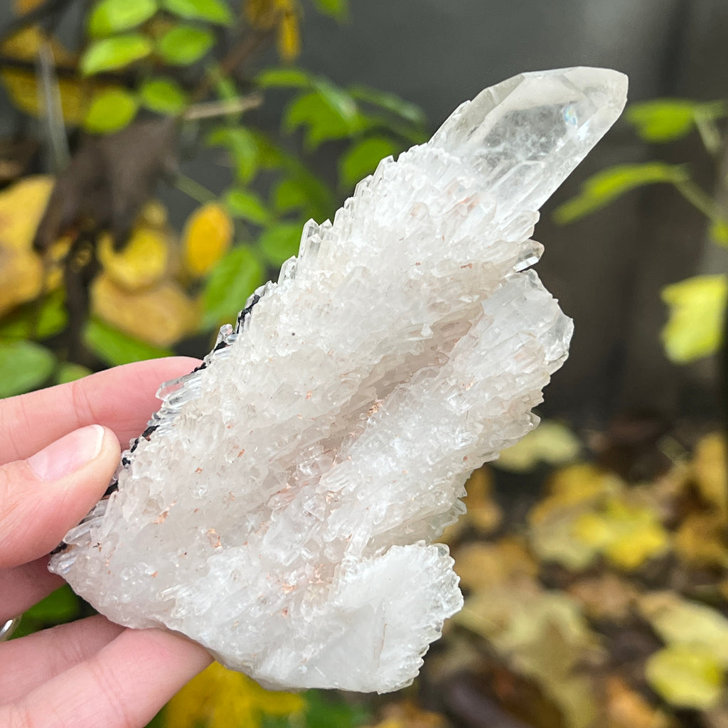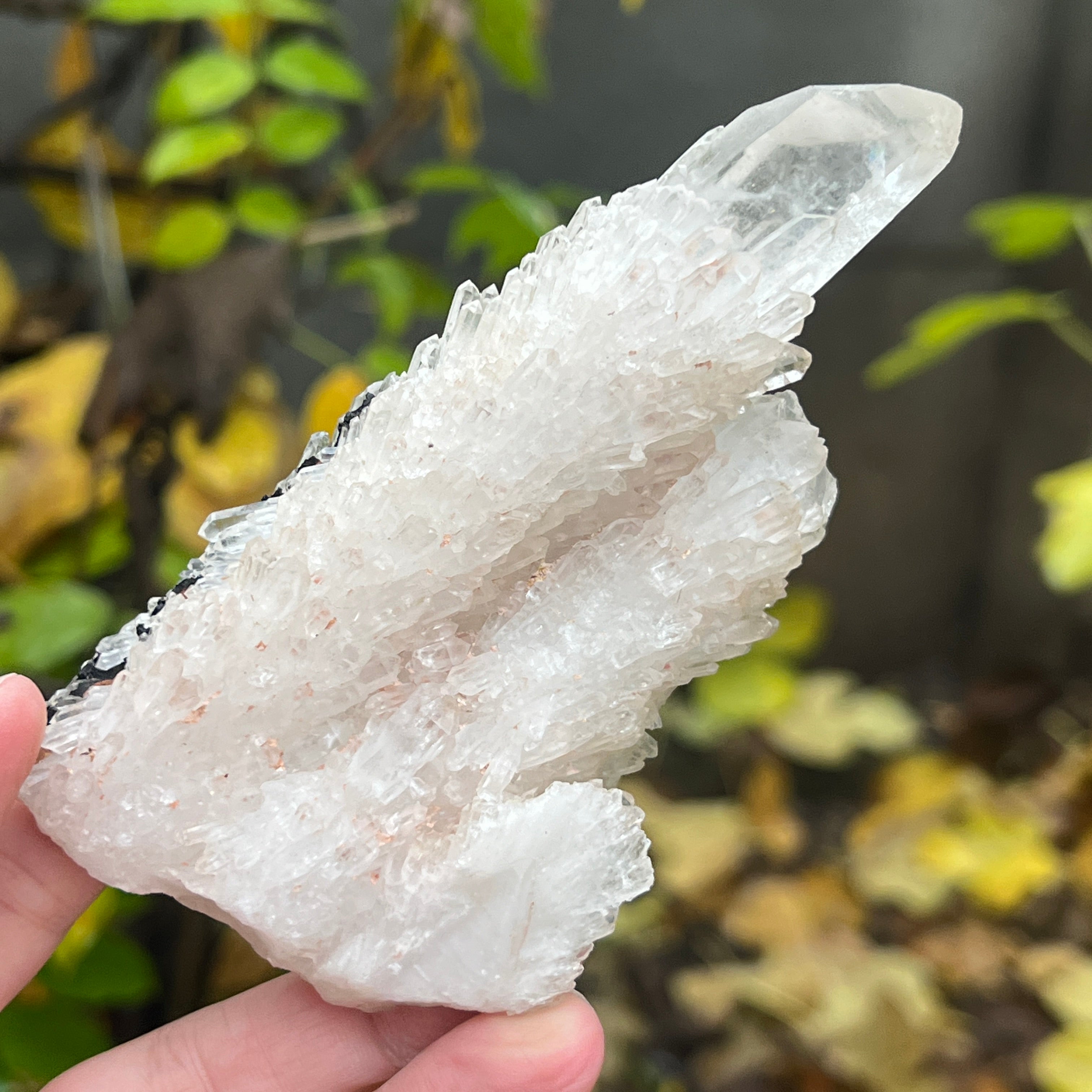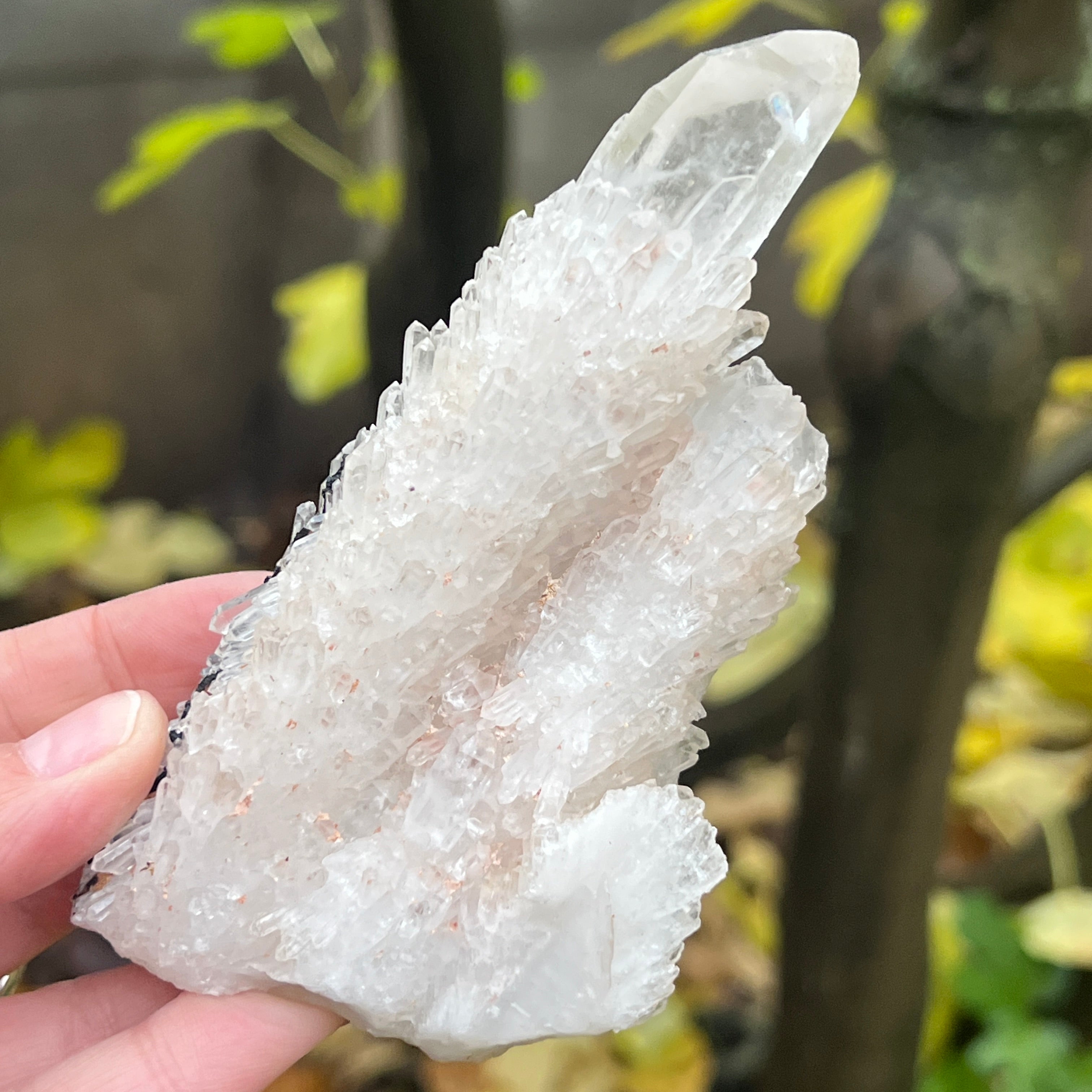 Un vârf care pare sculptat de lumină însăși. Cuartul celest, cunoscut și ca cuart lumânare, îmbină forța unui cristal de cuarț cu blândețea și strălucirea unei flăcări interioare. Forma sa unică, asemănătoare unui ananas cristalin, emană o energie de purificare profundă și de conectare cu planurile superioare ale conștiinței.