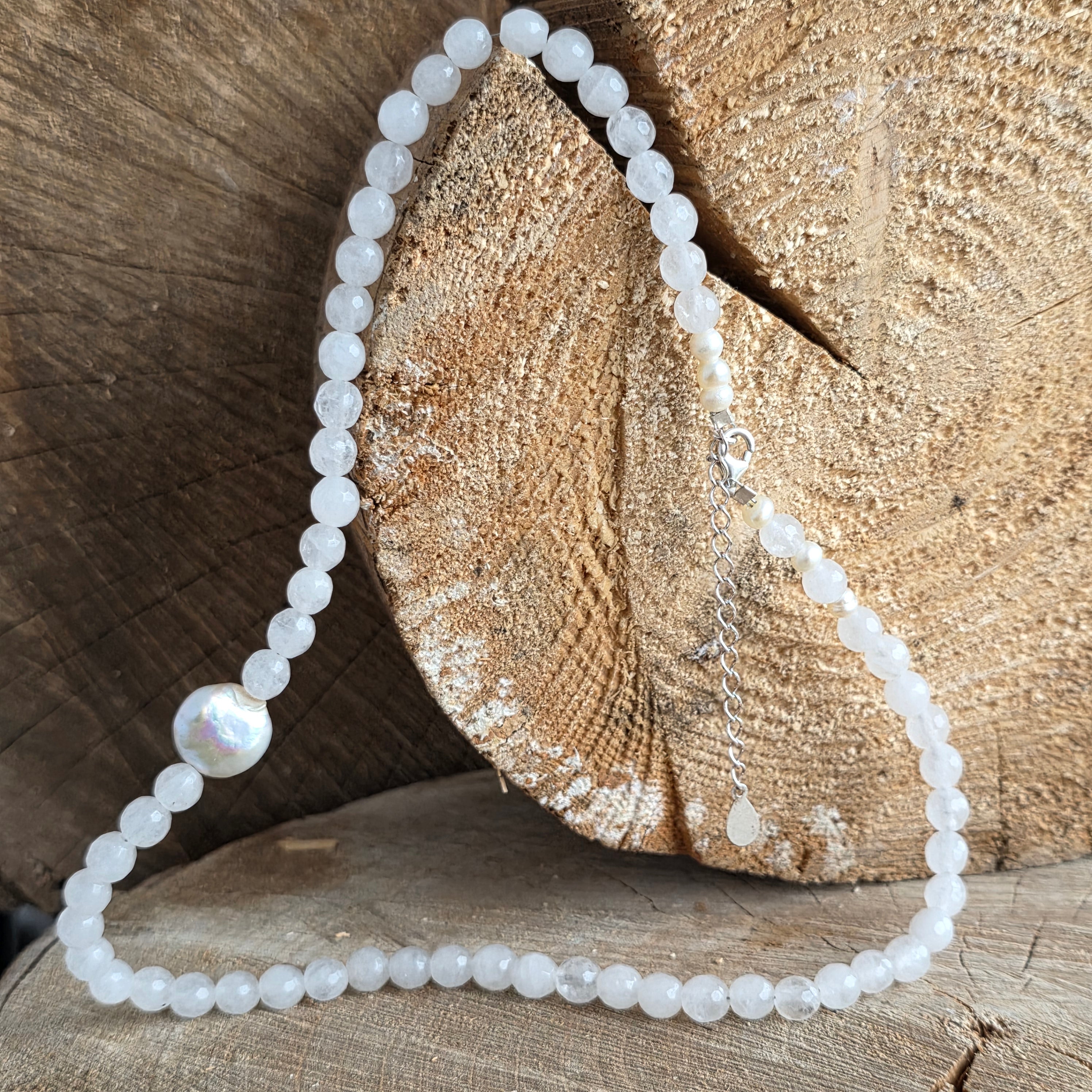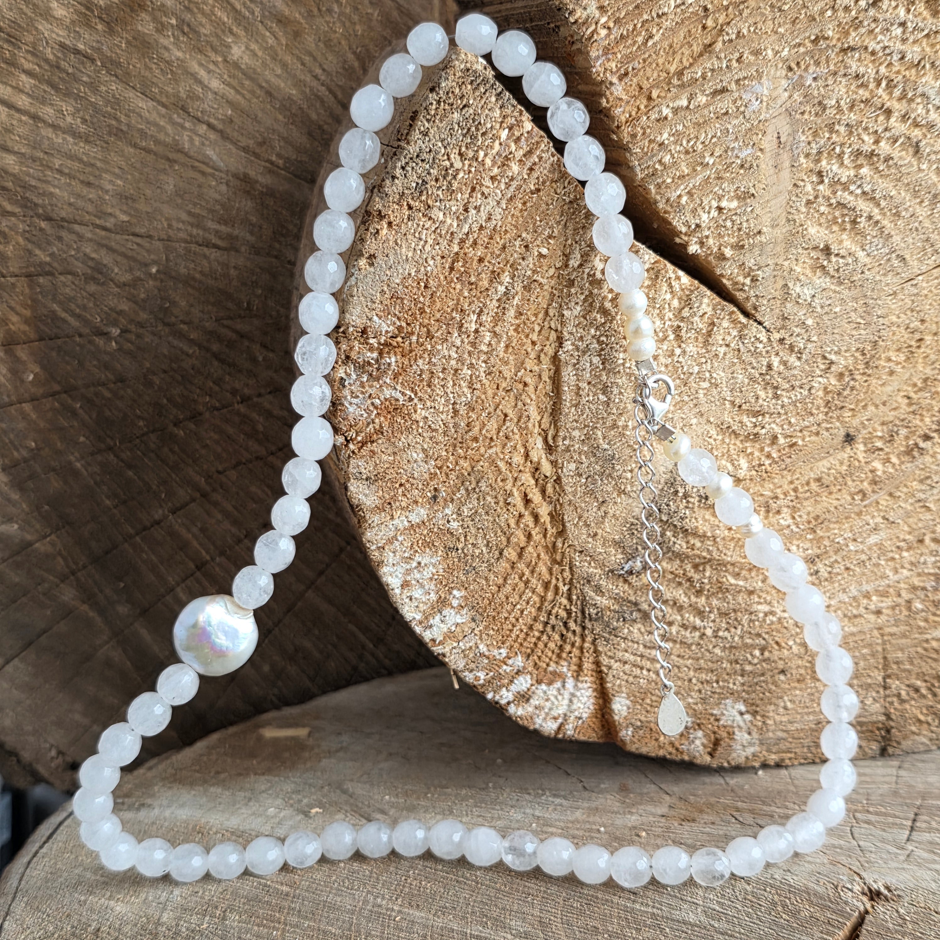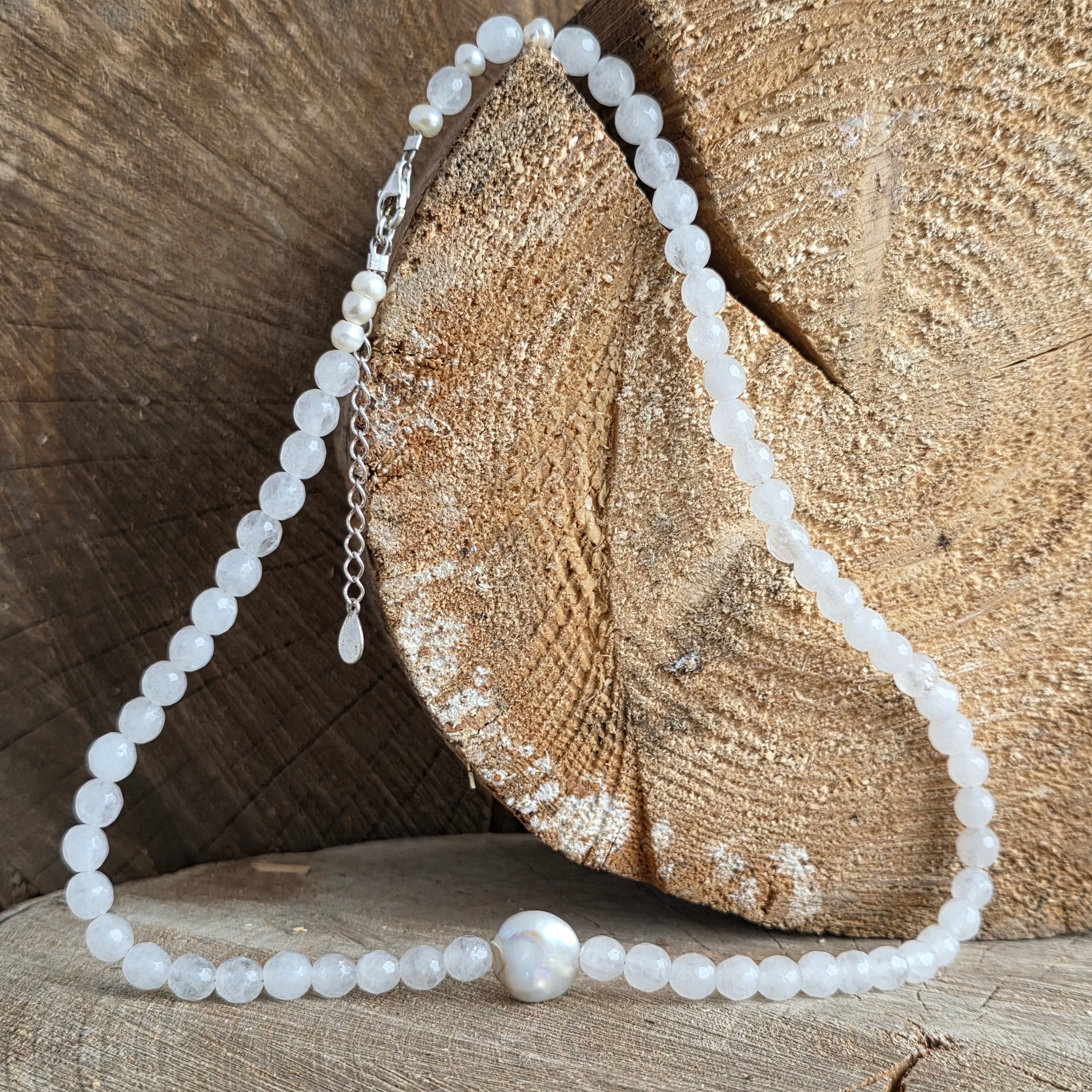 Materials: natural white jade 5 mm, natural pearls, 925 silver