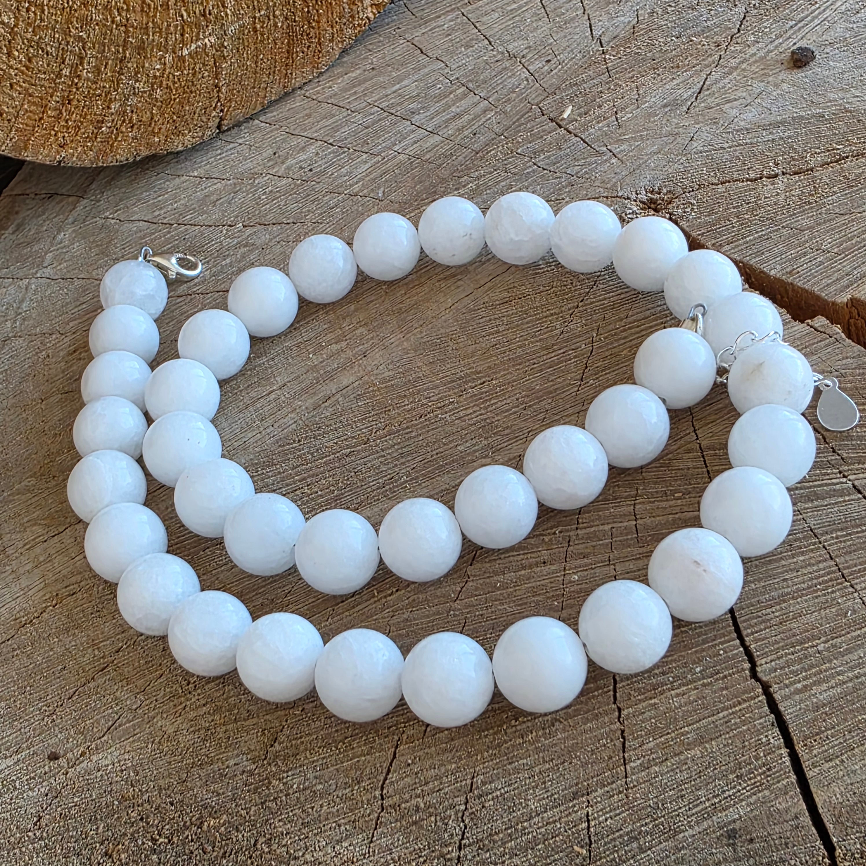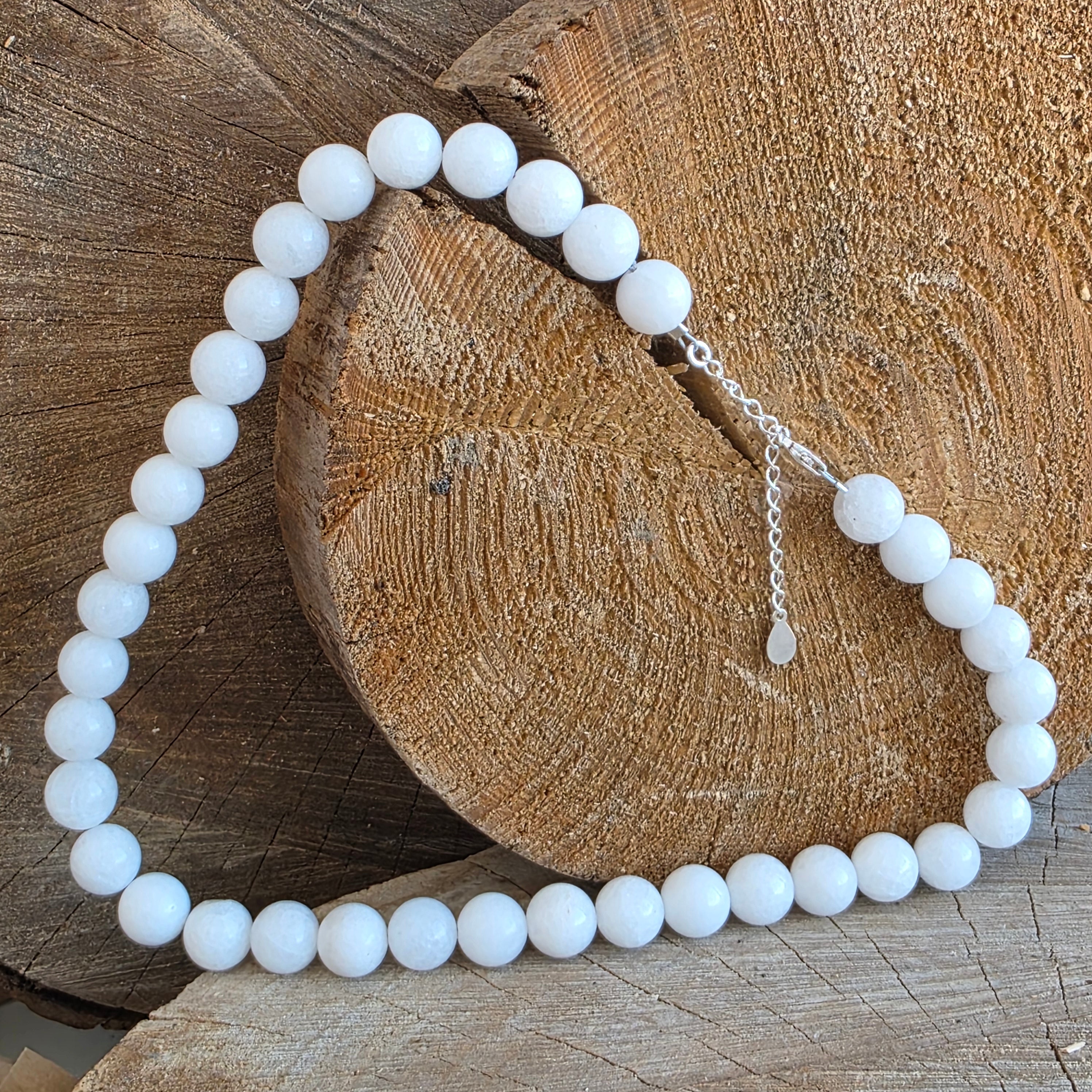 A necklace with a calm and refined presence, made of 6 mm white jade beads, which sit harmoniously around the neck, forming a balanced and luminous line. The milky white, sometimes slightly translucent, stone gives it a pure and orderly expression, while the fine faceting adds subtle reflections that enhance the natural texture without visually overwhelming the jewelry. The design is clean and timeless, suitable for daily wear or elegant accents.