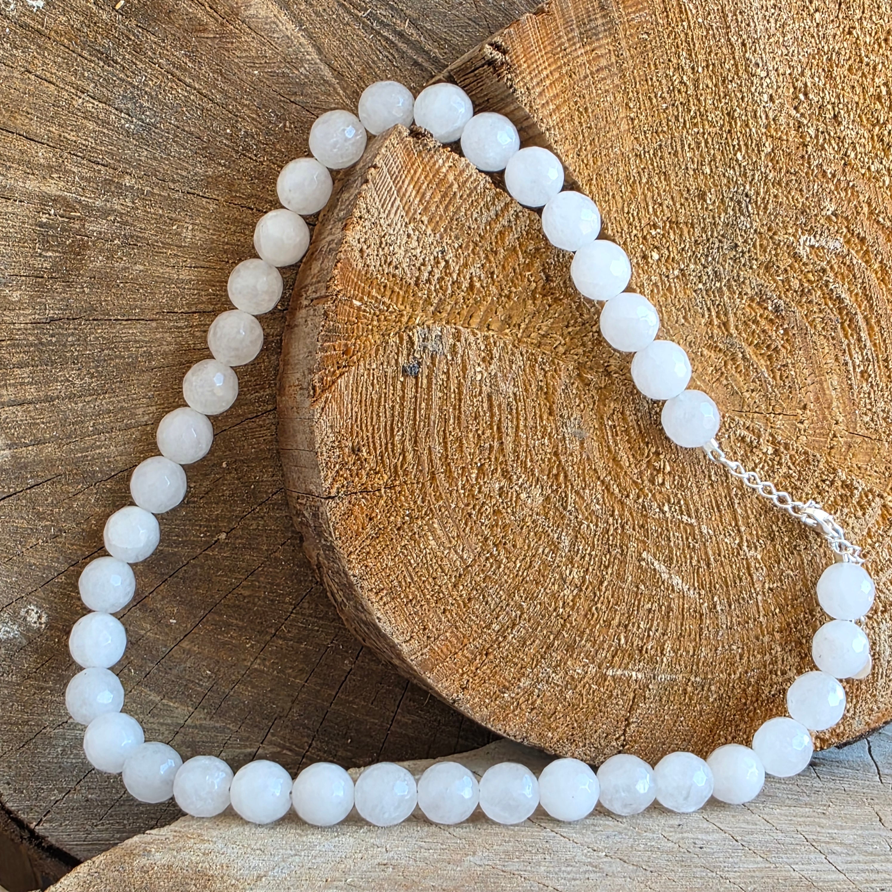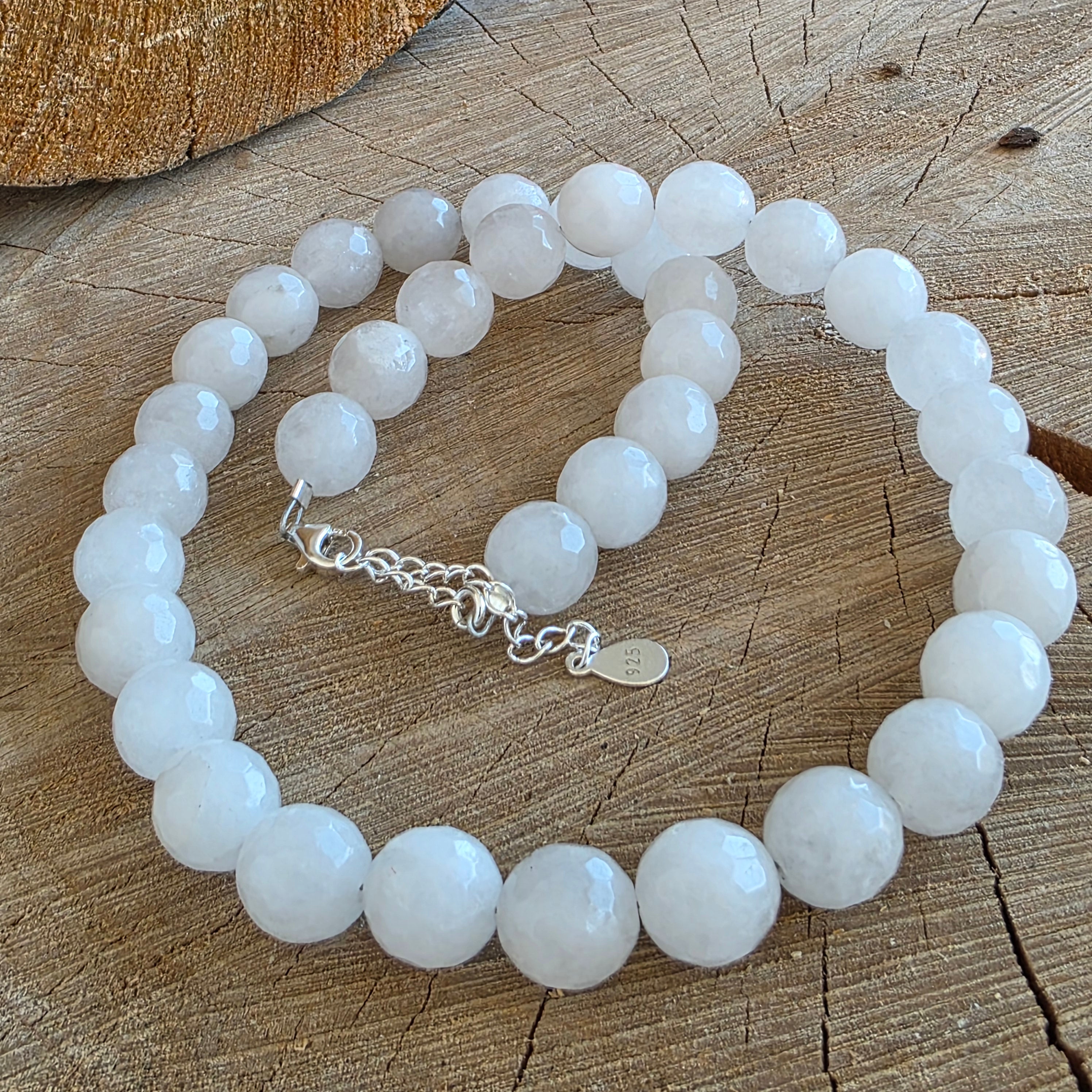 A necklace with a calm and refined presence, made from 10 mm white jade beads that sit harmoniously around the neck, forming a balanced and luminous line. The milky white, sometimes slightly translucent, hue gives the stone a pure and orderly expression, while the fine faceting adds subtle reflections that highlight the natural texture without visually weighing down the jewelry. The design is clean and timeless, suitable for daily wear or as an elegant accent.