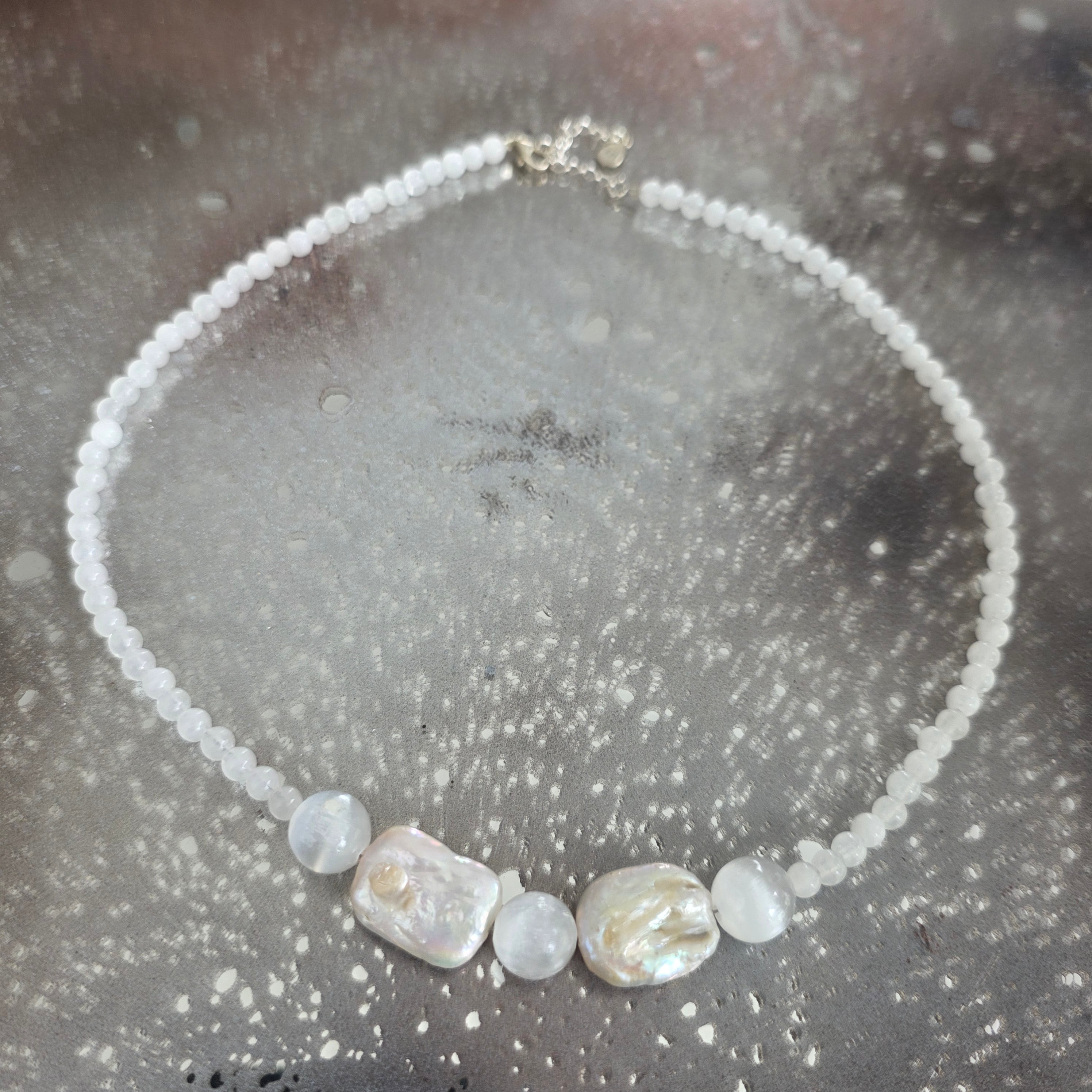 White jade, selenite, and pearl necklace Purity#96