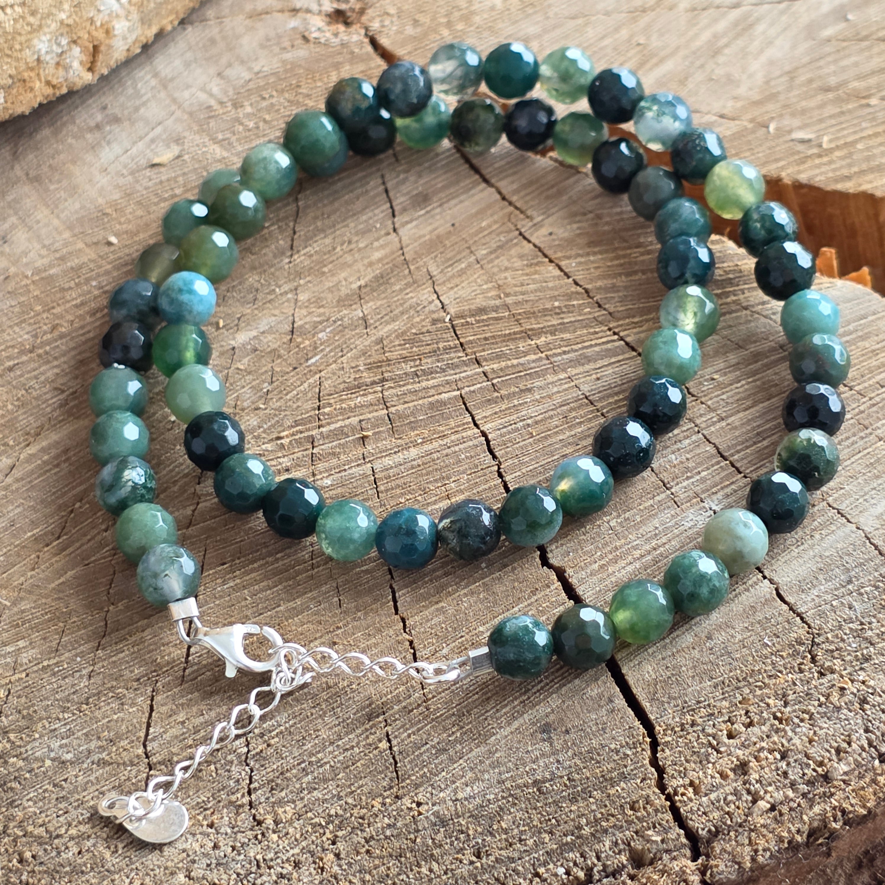 A necklace that carries the calm and strength of living nature. The natural faceted 6 mm moss agate radiates an organic and pure beauty, with shades reminiscent of morning moss and the coolness of trees after rain. Its delicate reflections and translucent texture add depth, while the fine facets catch the light in subtle sparkles.