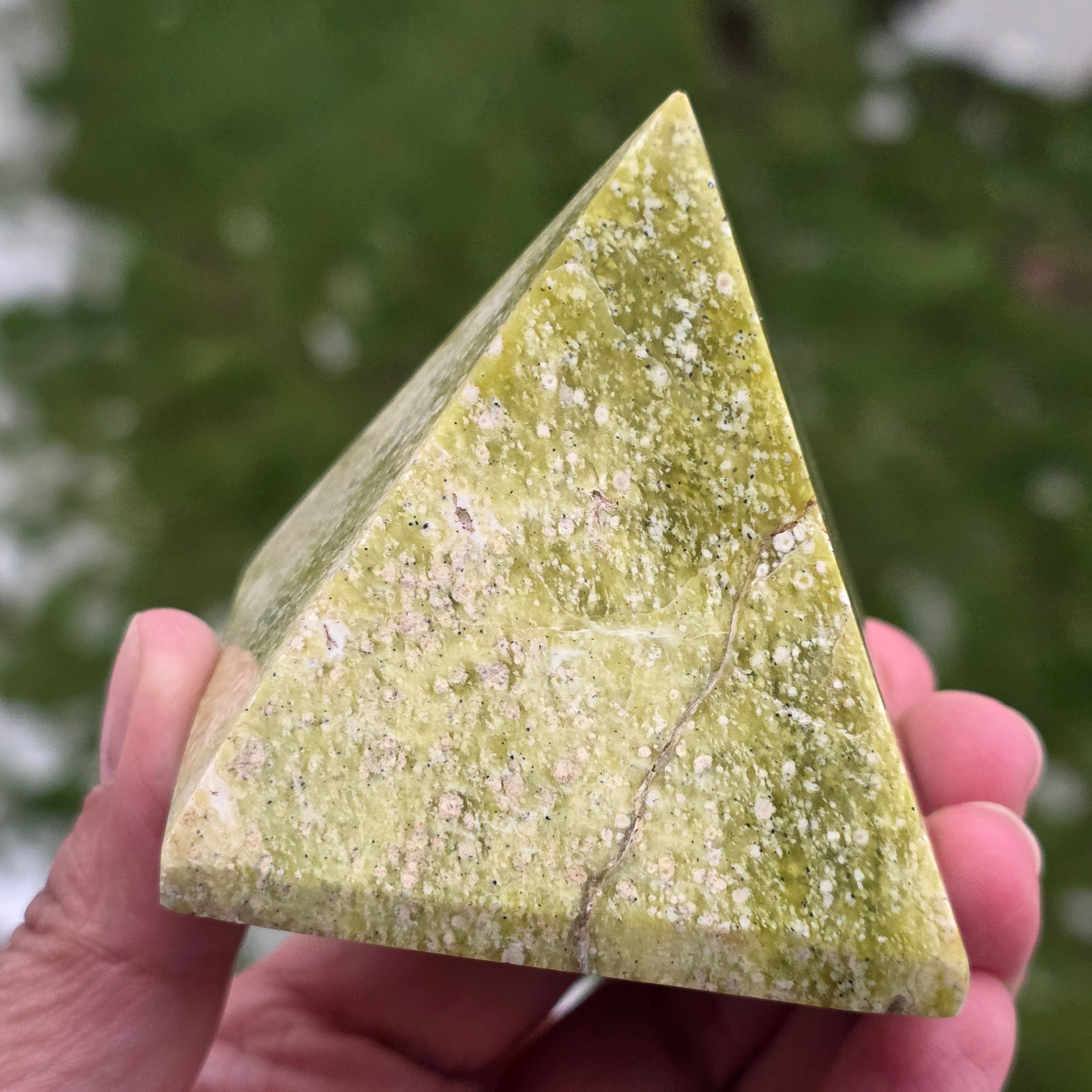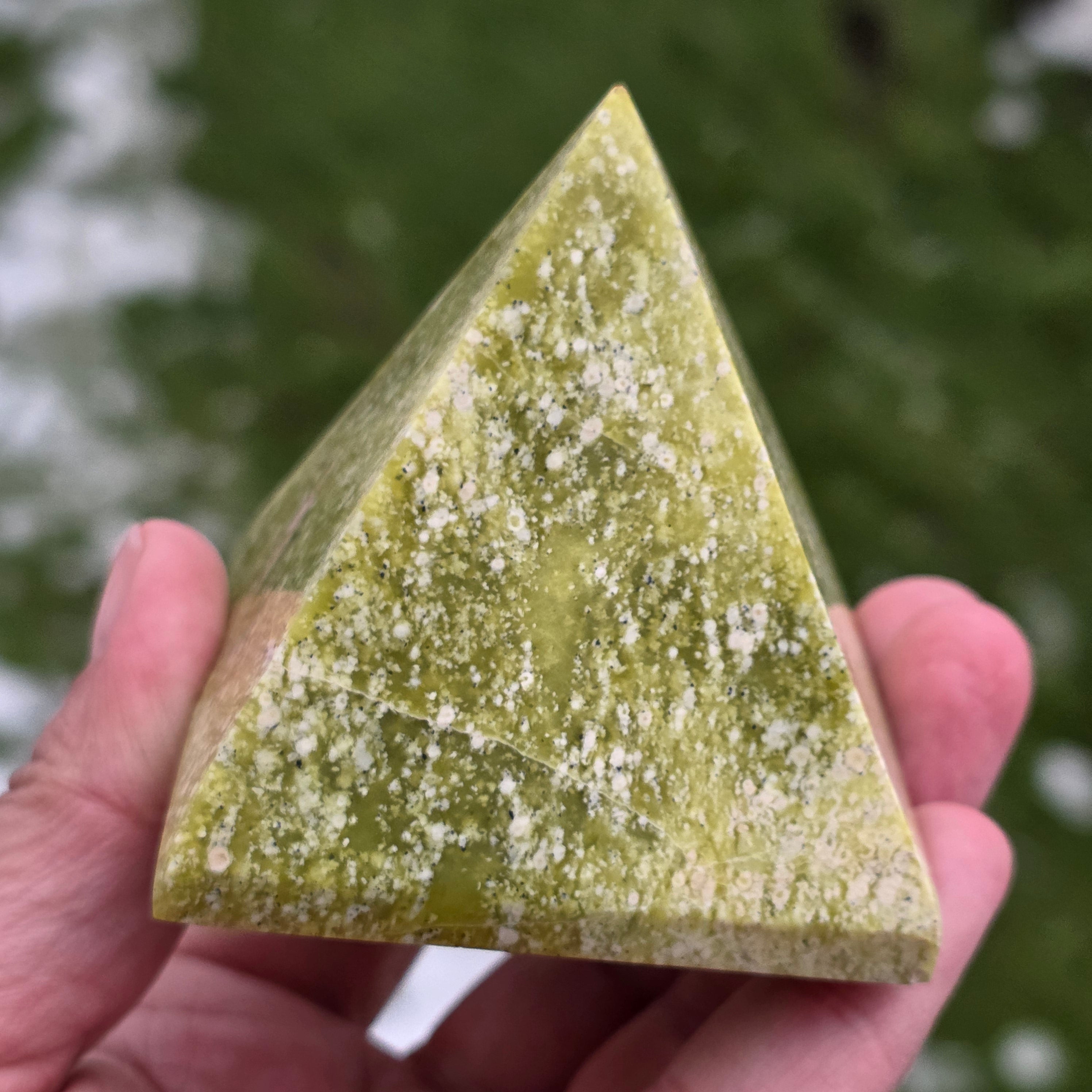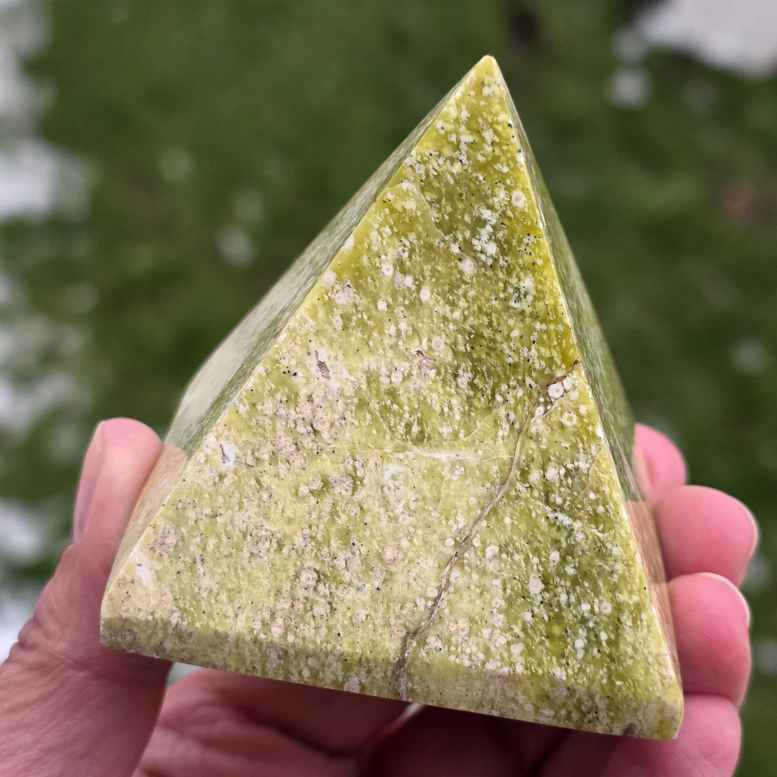This natural yellow serpentine pyramid is a luminous and balancing piece, suitable for meditation spaces, offices, or areas dedicated to inner regeneration. Yellow serpentine is associated with energy revitalization, mental clarity, and supporting emotional balancing processes. The pyramid shape helps to focus and stabilize energy, making this piece a subtle support point for focus, harmony, and reconnection.